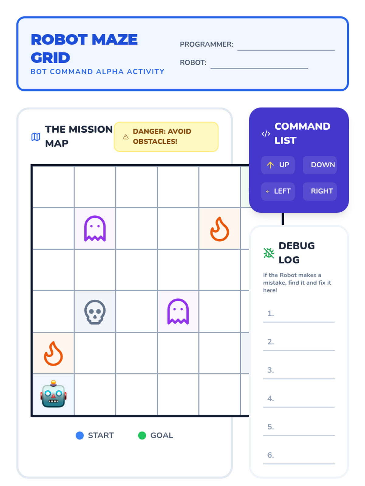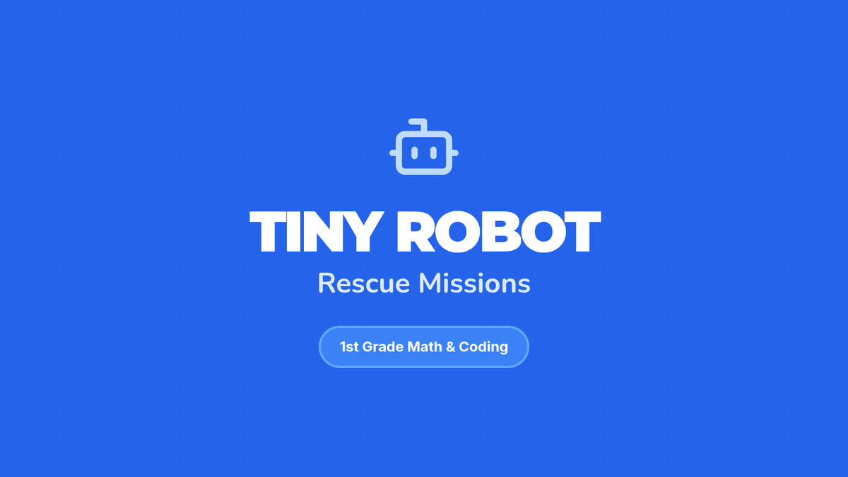 A 1st Grade lesson introducing directional language (up, down, left, right) and grid navigation using a 'Tiny Robot' theme. Students engage in a physical floor grid activity and complete a coding-themed maze worksheet.