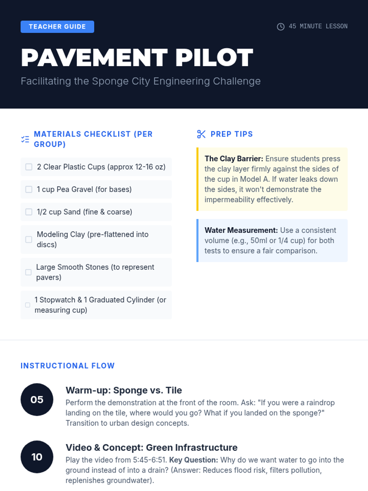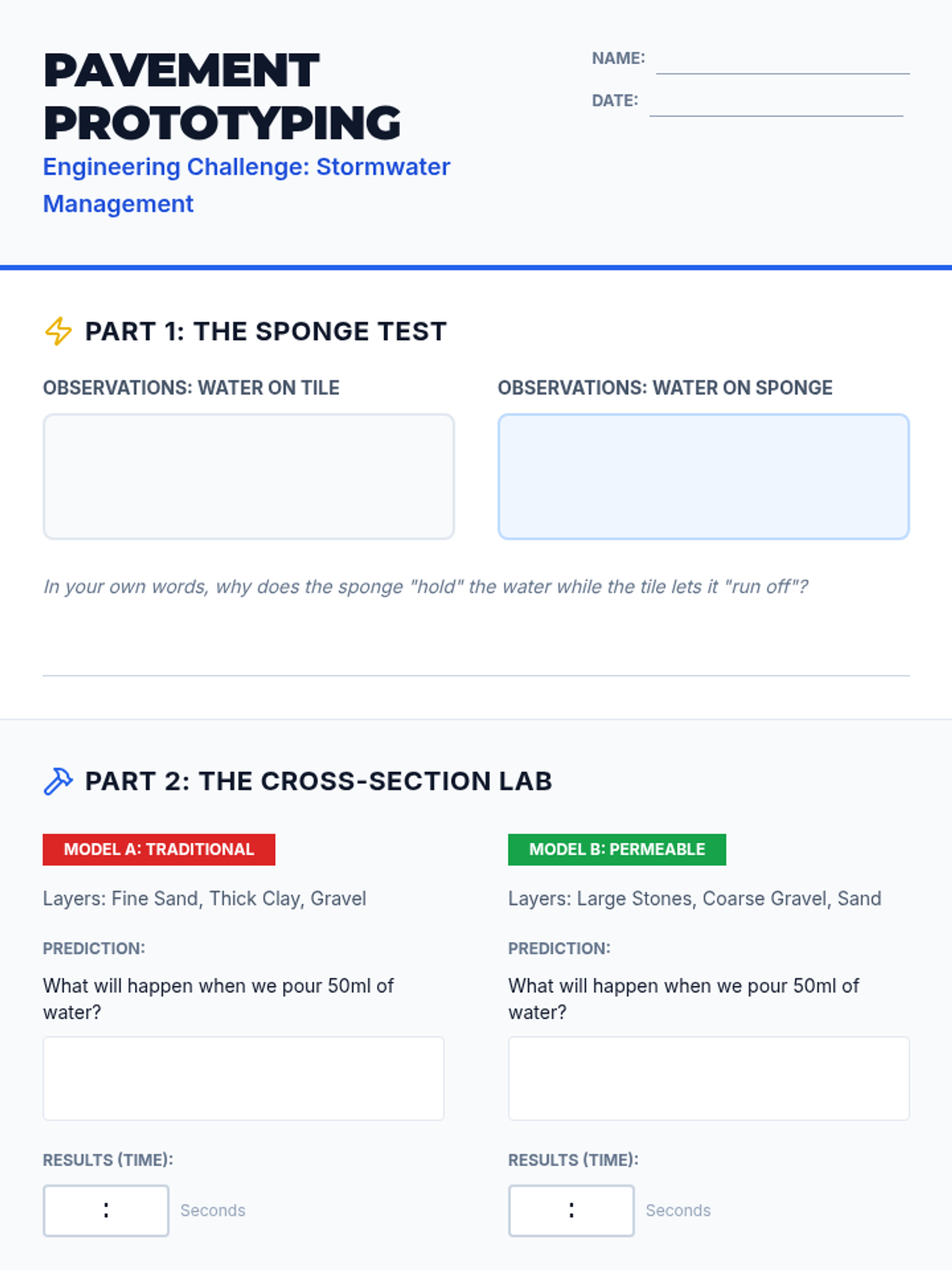A hands-on engineering lesson where students explore how permeable pavement mimics natural systems to manage stormwater and reduce urban flooding. Students build and test model pavement cross-sections to compare traditional and sustainable urban design.