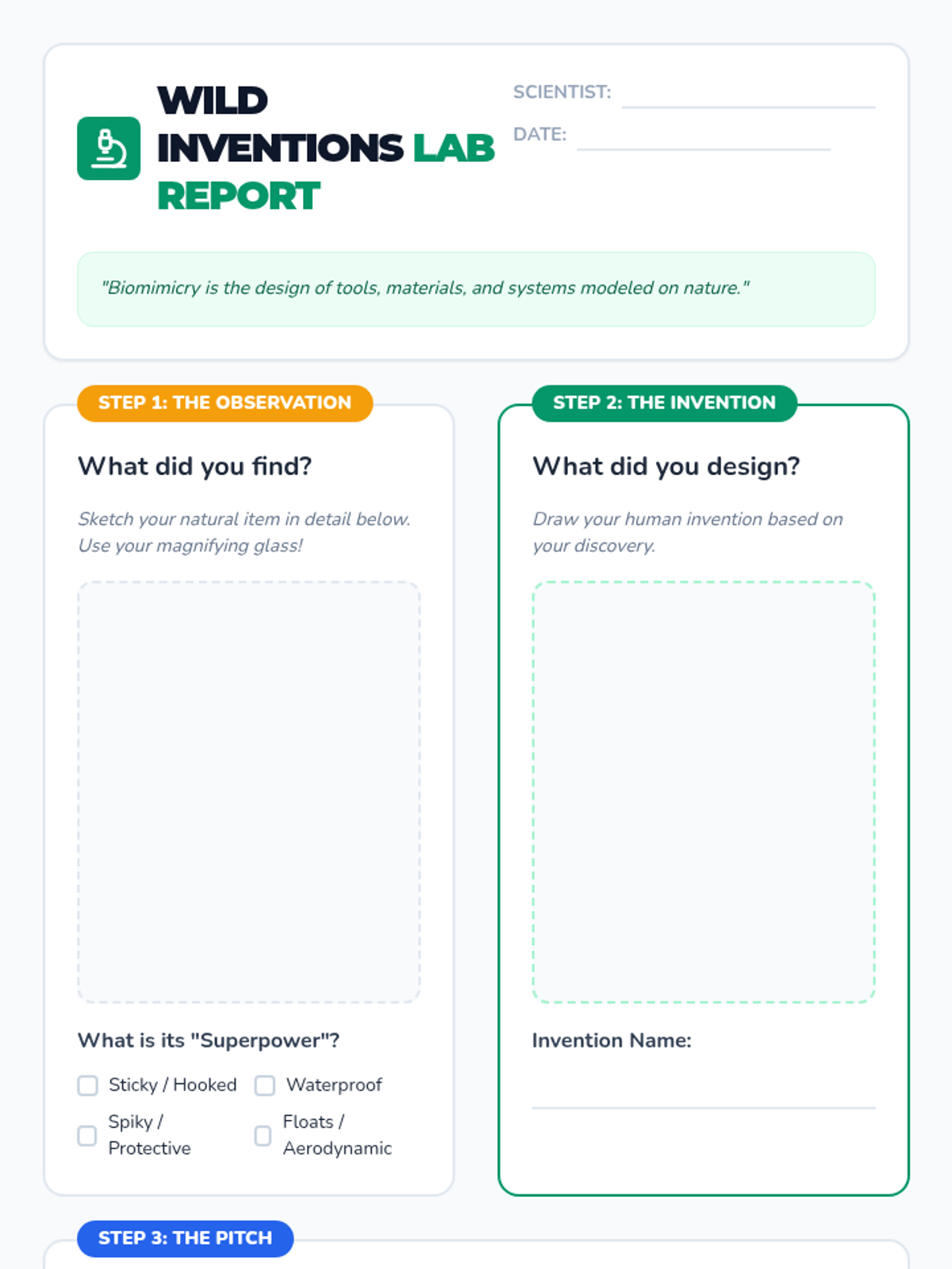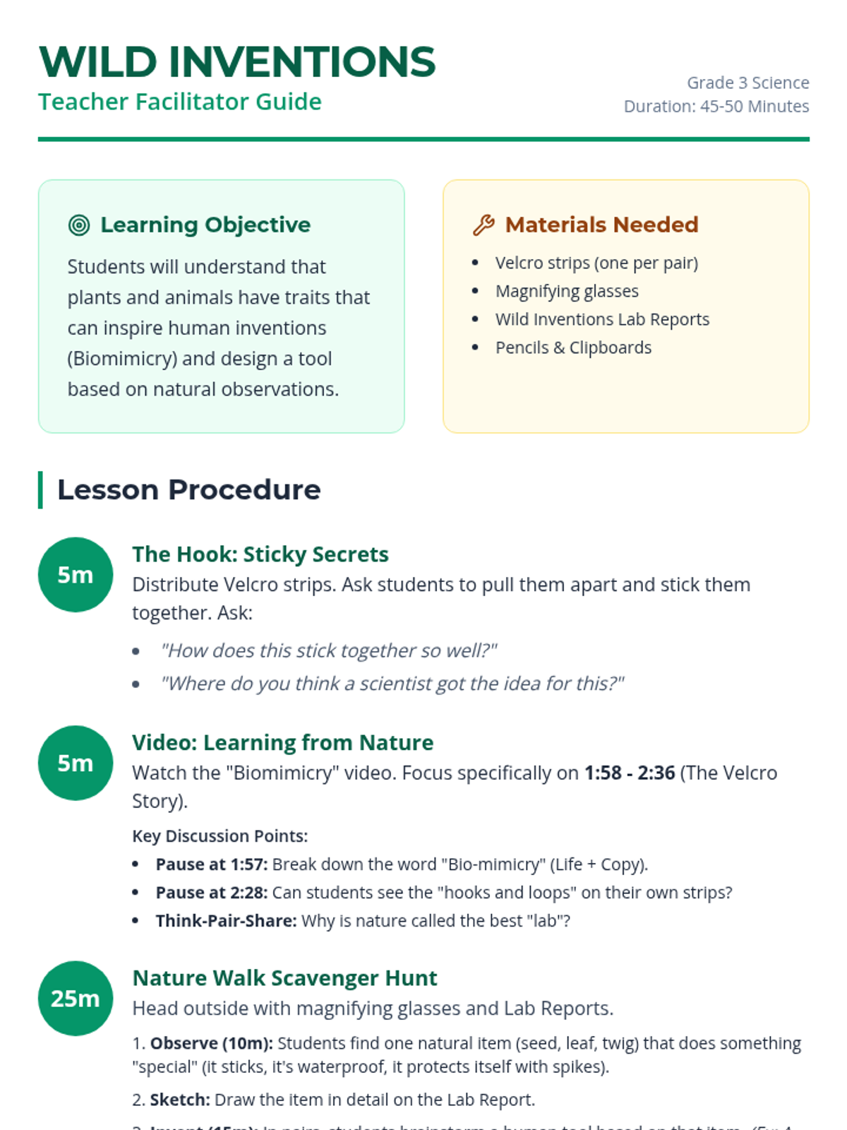 A 3rd-grade science lesson exploring biomimicry, where students observe nature's traits to inspire their own human-centered inventions through a hands-on nature walk and design challenge.