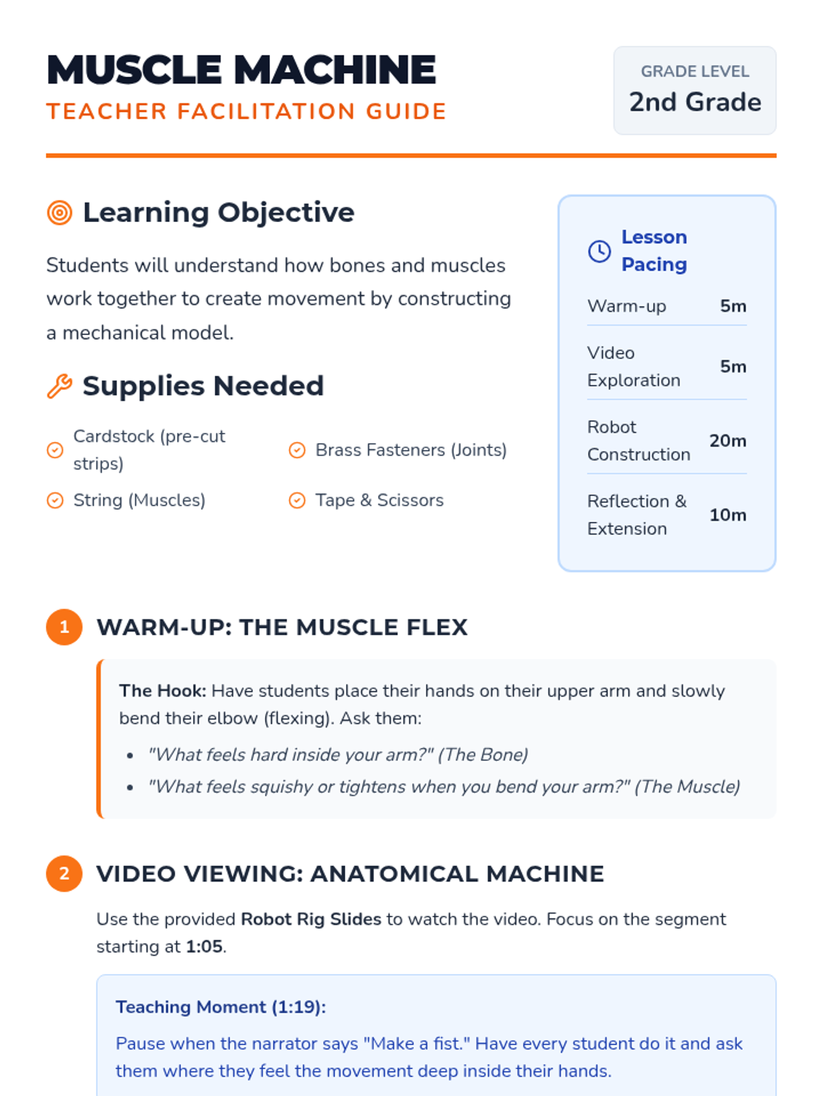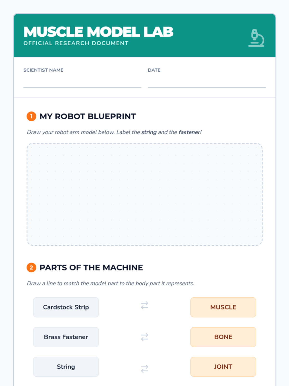 A hands-on engineering lesson where 2nd-grade students build a model robot arm to discover how muscles pull on bones at joints to create movement.