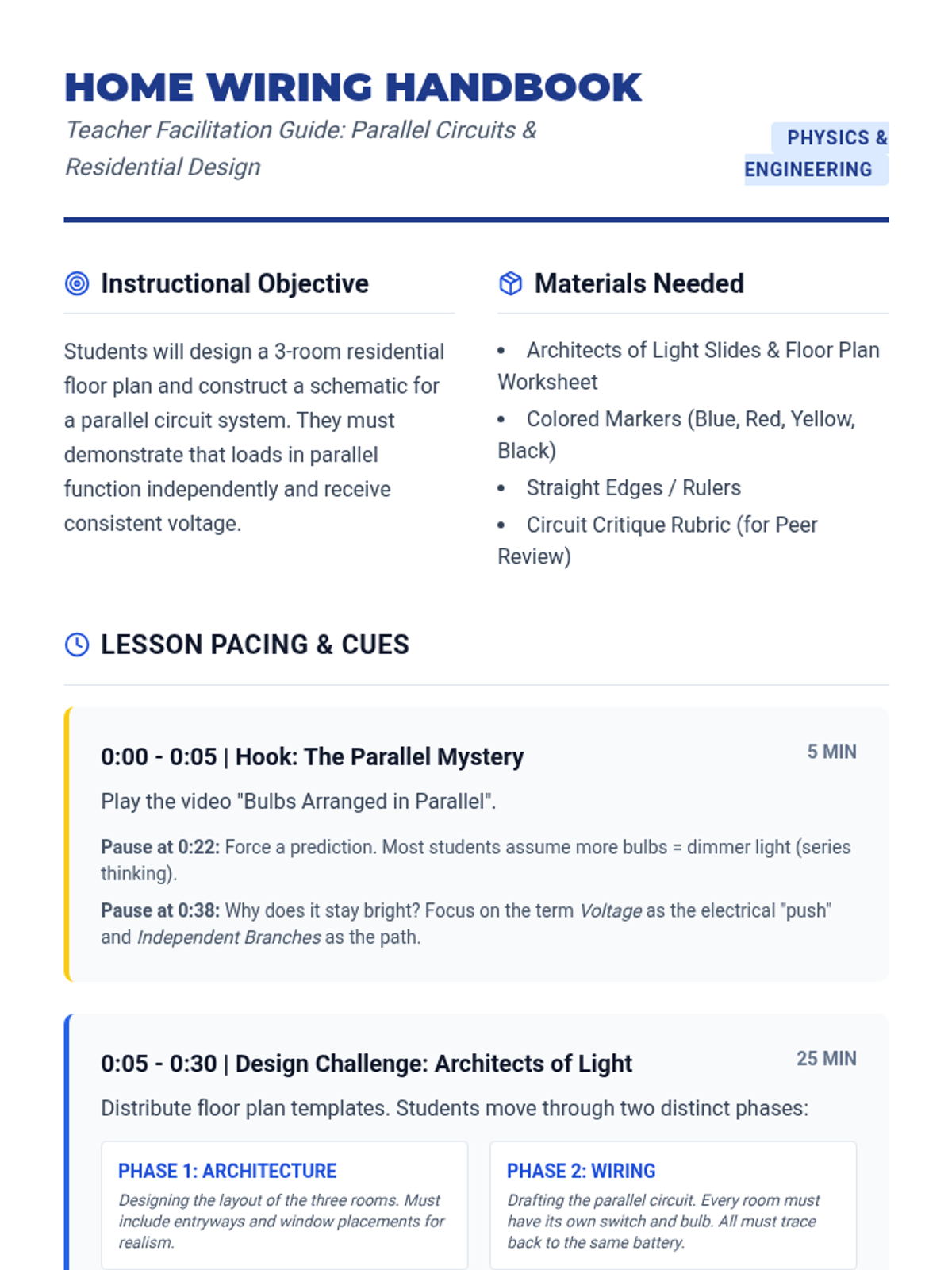 Students will transition from understanding simple circuits to designing a parallel circuit system for a 3-room house model. The lesson uses a video hook to demonstrate the constant brightness of parallel loads and challenges students to apply this 'Architect of Light' mindset to floor plan wiring.