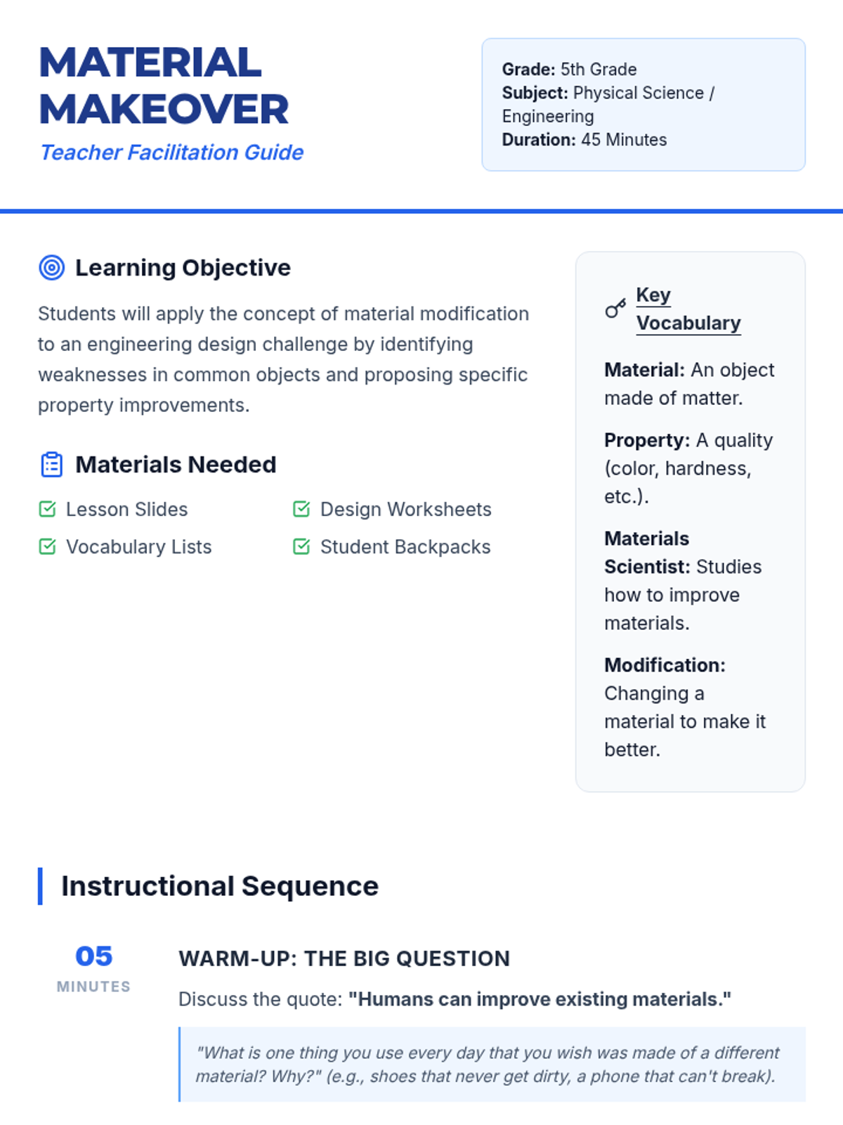 A 5th-grade engineering lesson where students analyze the materials in their backpacks and propose scientific improvements based on material properties, inspired by the development of steel and Gorilla Glass.