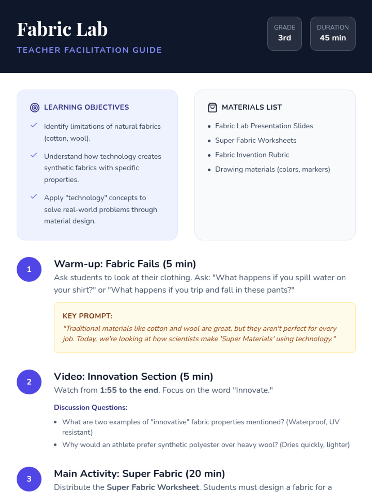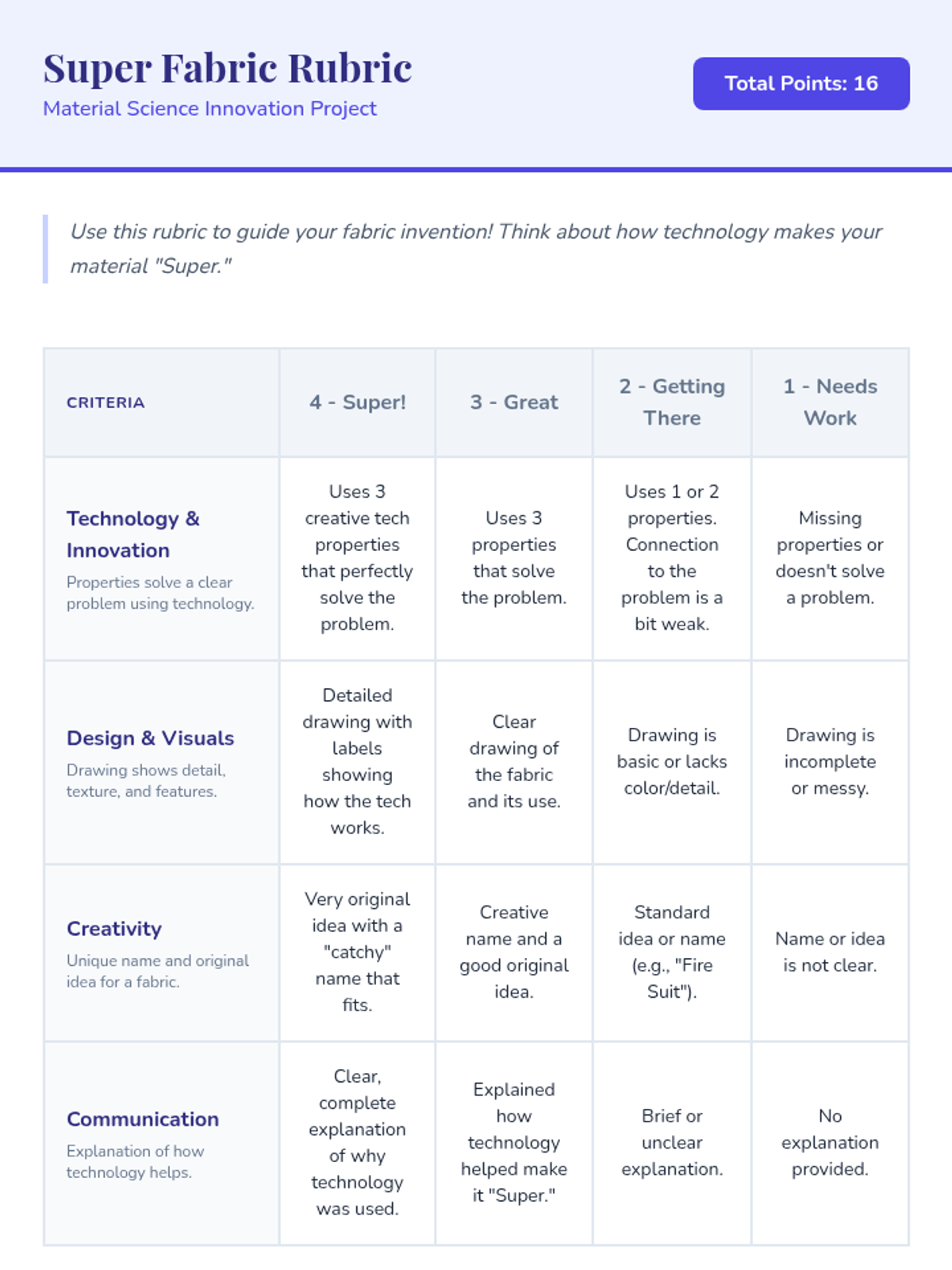 Students explore how technology improves materials by inventing a 'Super Fabric' designed for specific professional or environmental needs.