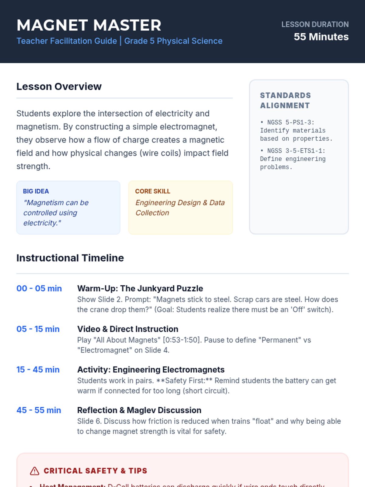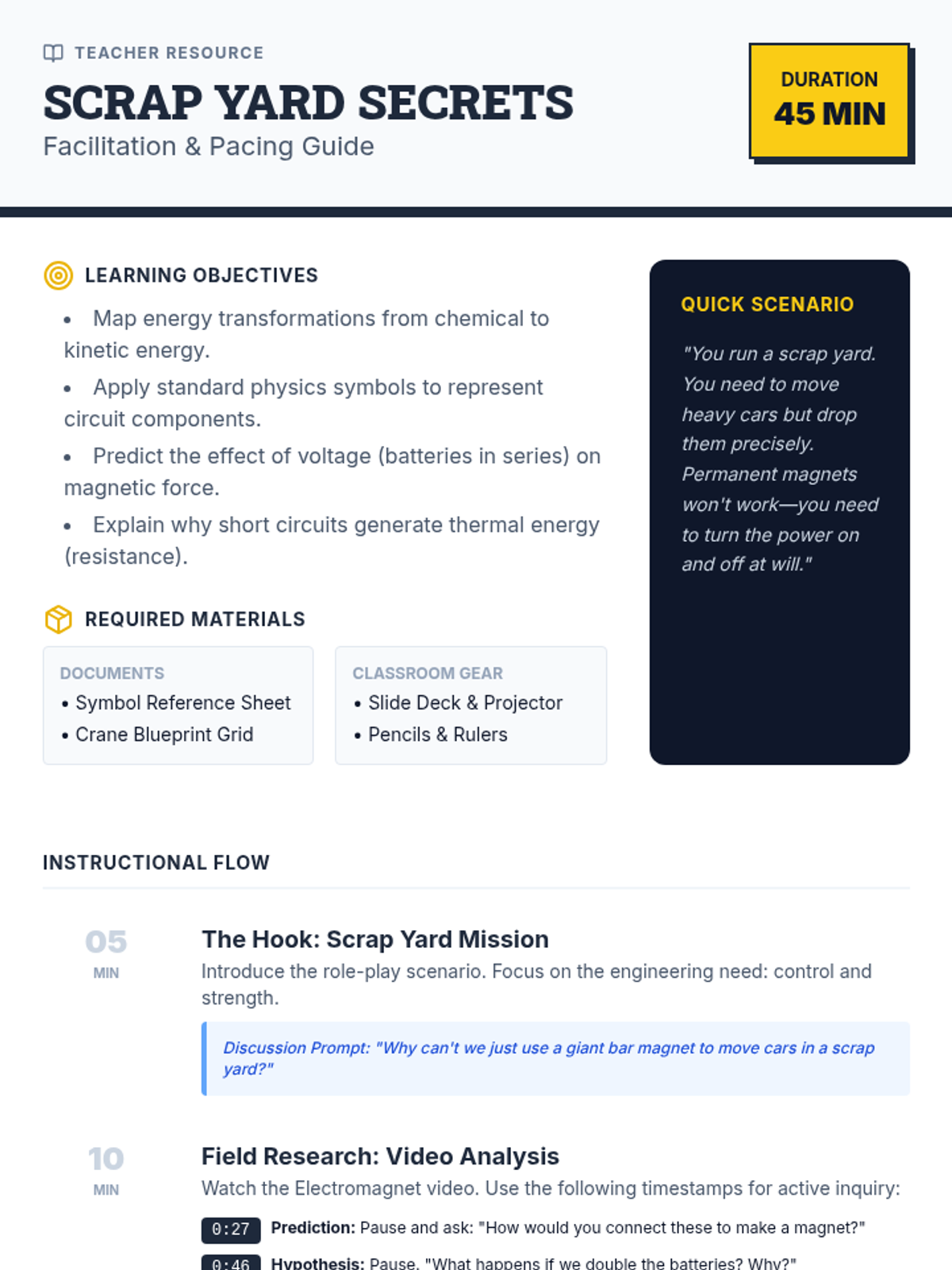Students explore energy transformation and circuit design through the lens of building a powerful electromagnet for a scrap yard crane. They will map energy flow, learn standard circuit symbols, and diagram a multi-battery electromagnet system while discussing resistance and safety.