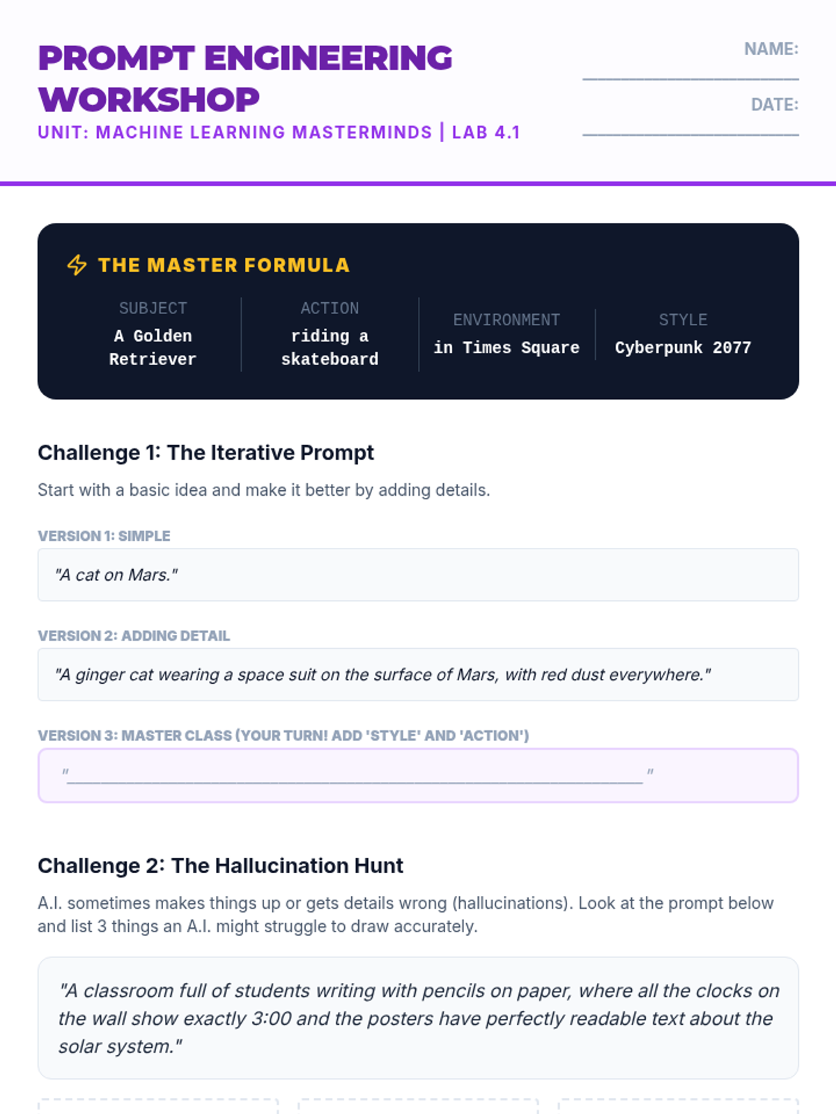 Students experiment with generative AI tools to understand prompt engineering and the relationship between human intent and machine creation.