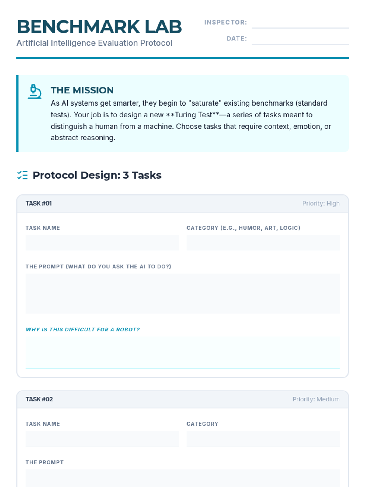 Students explore the concept of AI benchmarks by analyzing deepfakes and designing their own 'Turing Test' style evaluations for artificial intelligence.