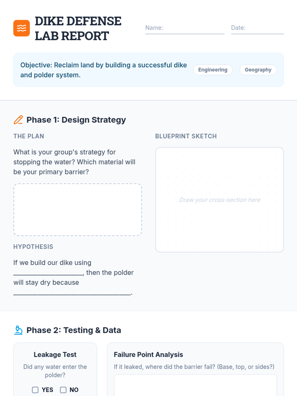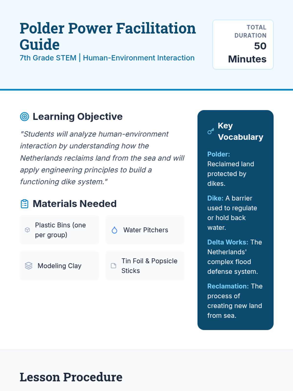 A STEM-focused lesson where 7th-grade students explore the engineering of the Netherlands' polders and dikes, culminating in a hands-on 'Build a Dike' challenge to understand human-environment interaction.