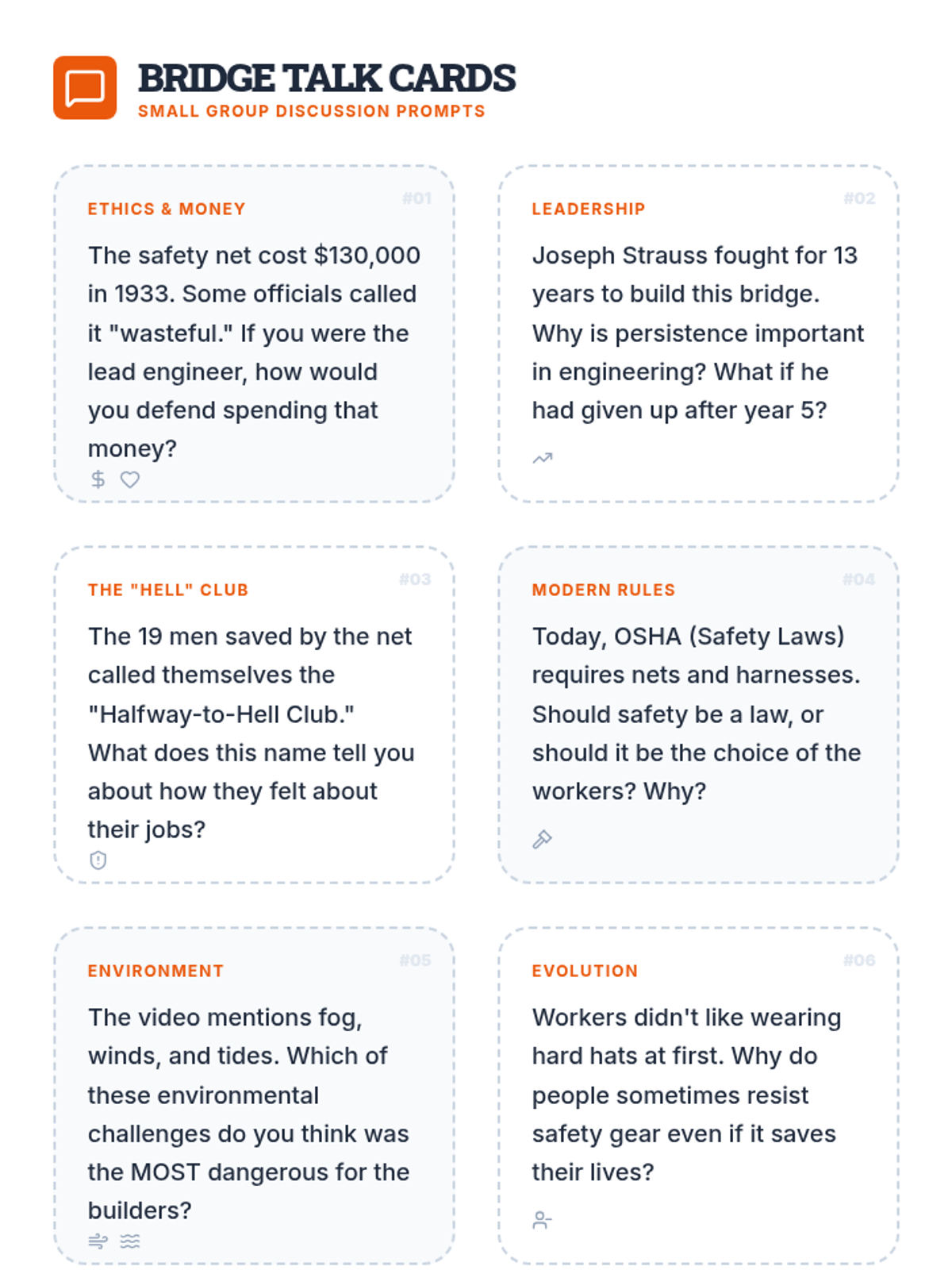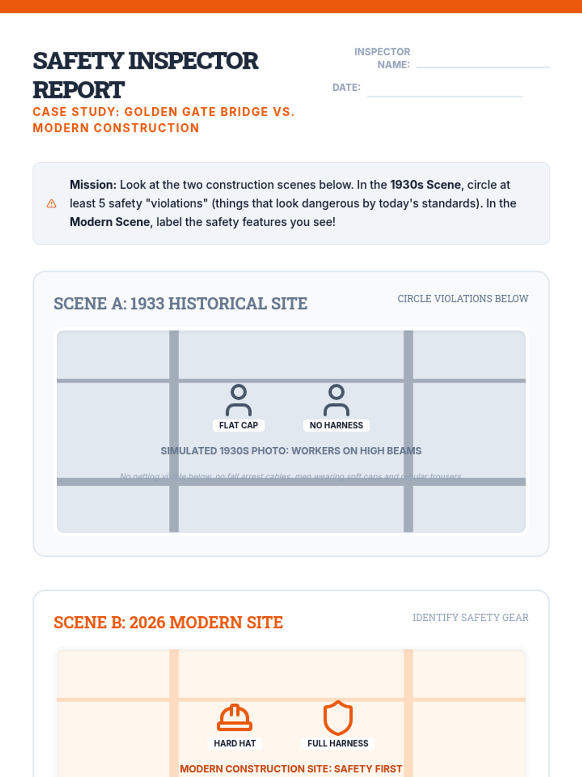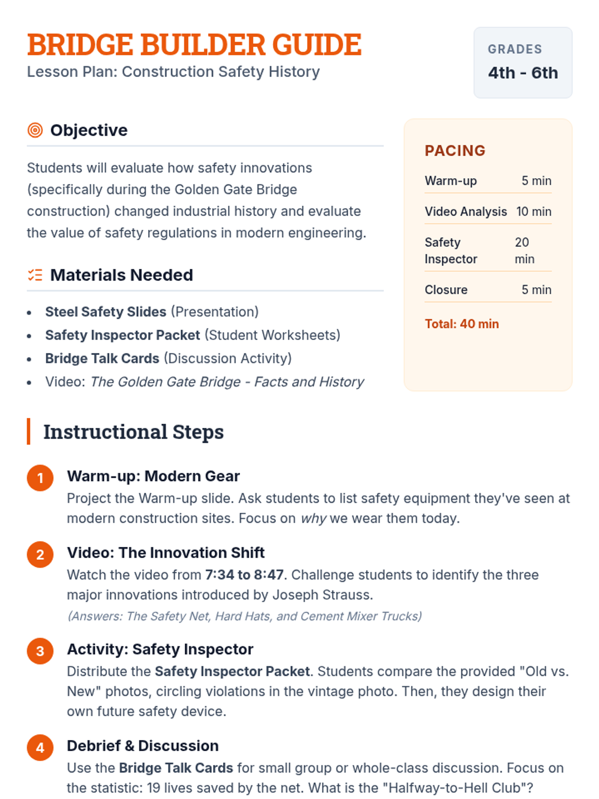 A STEM and History lesson for grades 4-6 exploring the revolutionary safety measures introduced during the construction of the Golden Gate Bridge, featuring a comparison of historical vs. modern construction practices and a creative design challenge.