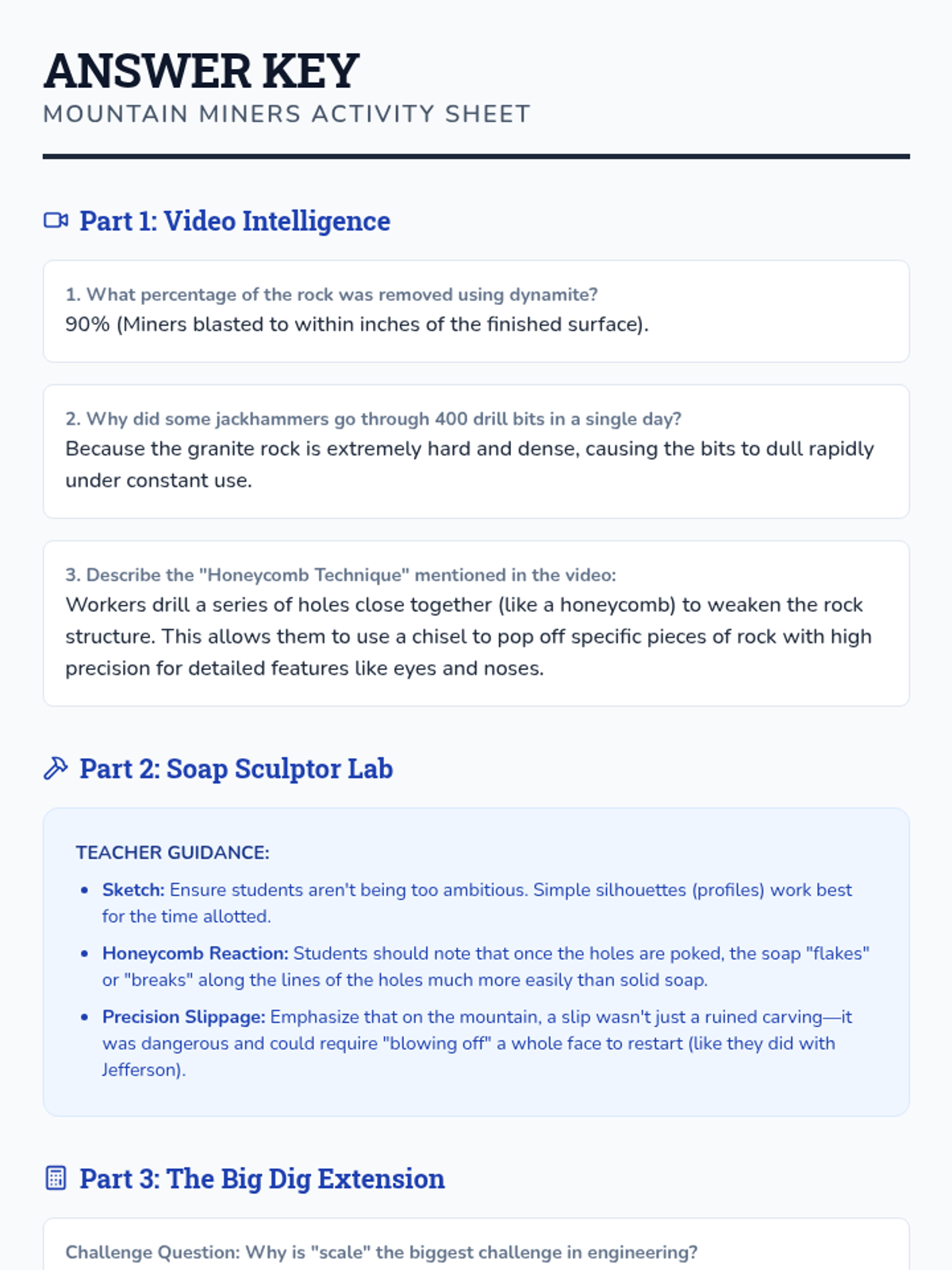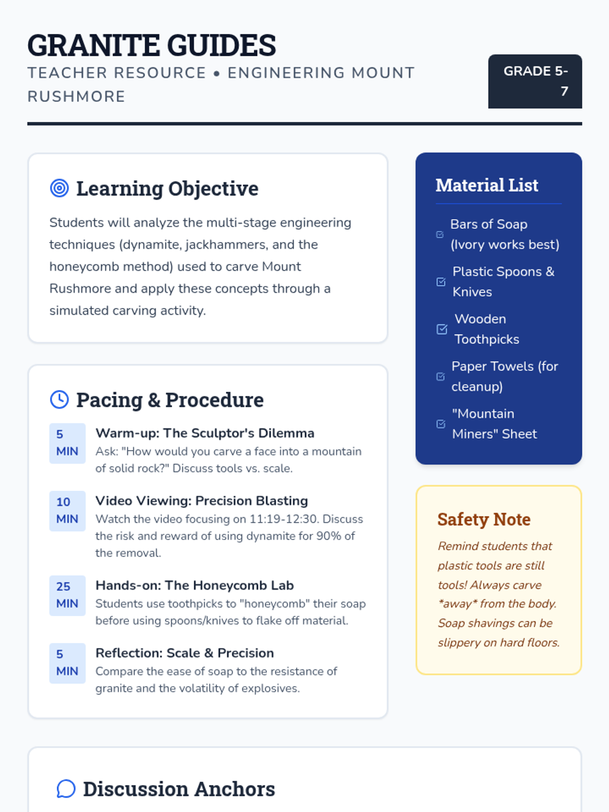 Students explore the engineering marvel of Mount Rushmore, focusing on the specific techniques of dynamite blasting and the 'honeycomb' method to carve granite at scale. The lesson culminates in a hands-on soap carving activity where students simulate these industrial techniques.