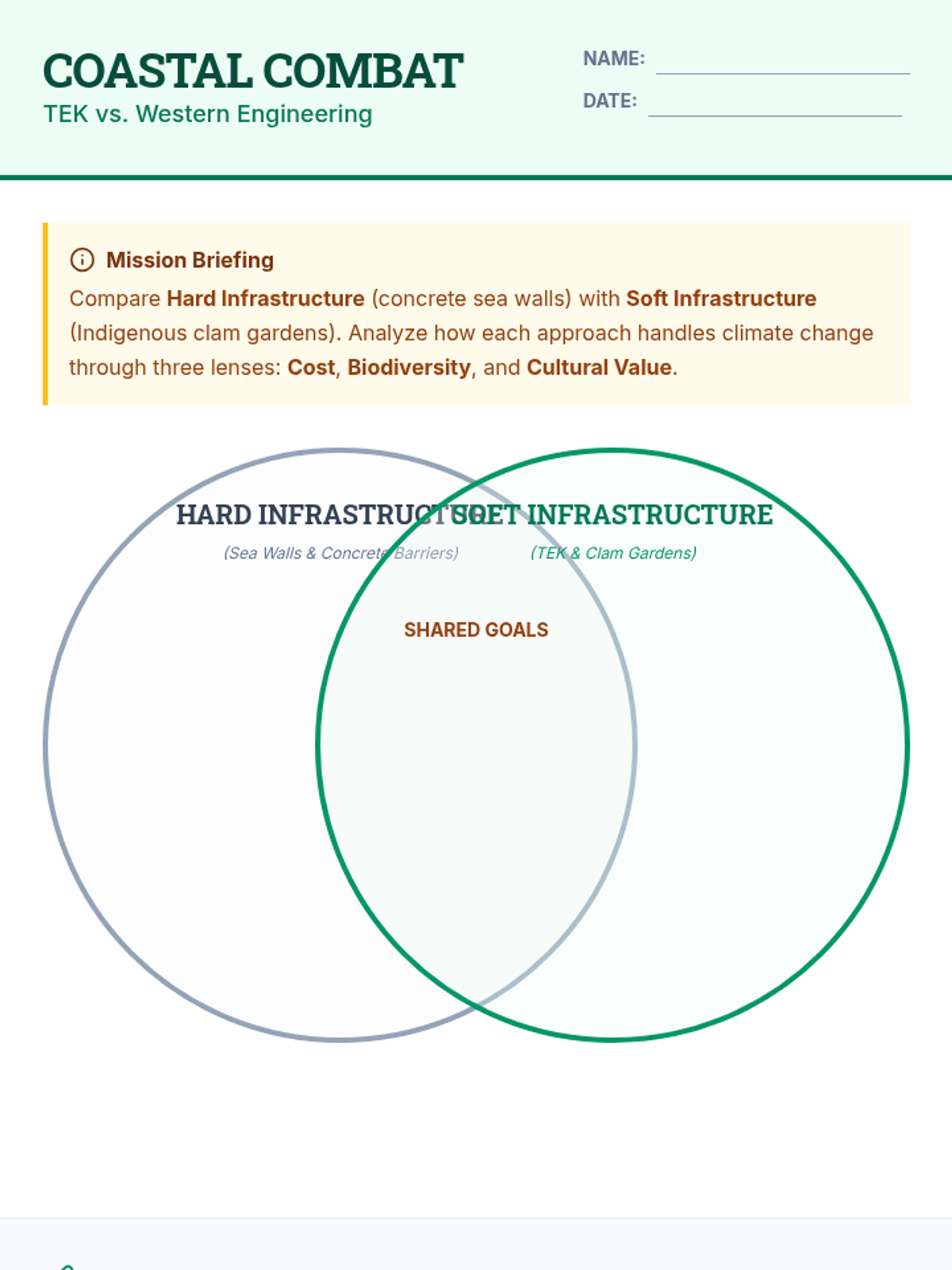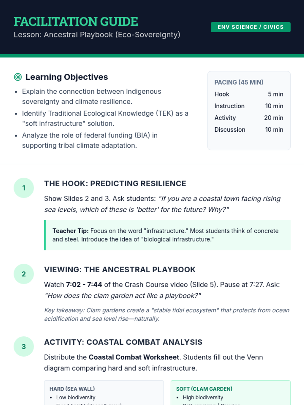 This lesson explores the intersection of Indigenous sovereignty, Traditional Ecological Knowledge (TEK), and environmental engineering. Students will compare 'hard infrastructure' like sea walls with the 'soft infrastructure' of Swinomish clam gardens to understand climate resilience through a lens of federal law and Indigenous wisdom.