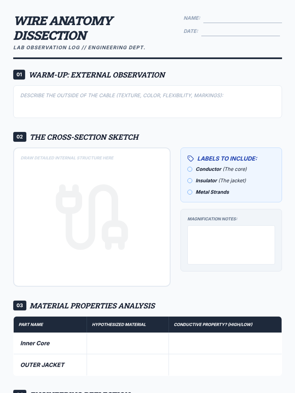 A hands-on engineering lesson where students dissect electrical cables to explore the atomic properties of conductors and insulators, material selection in engineering, and the economics of resource scarcity.