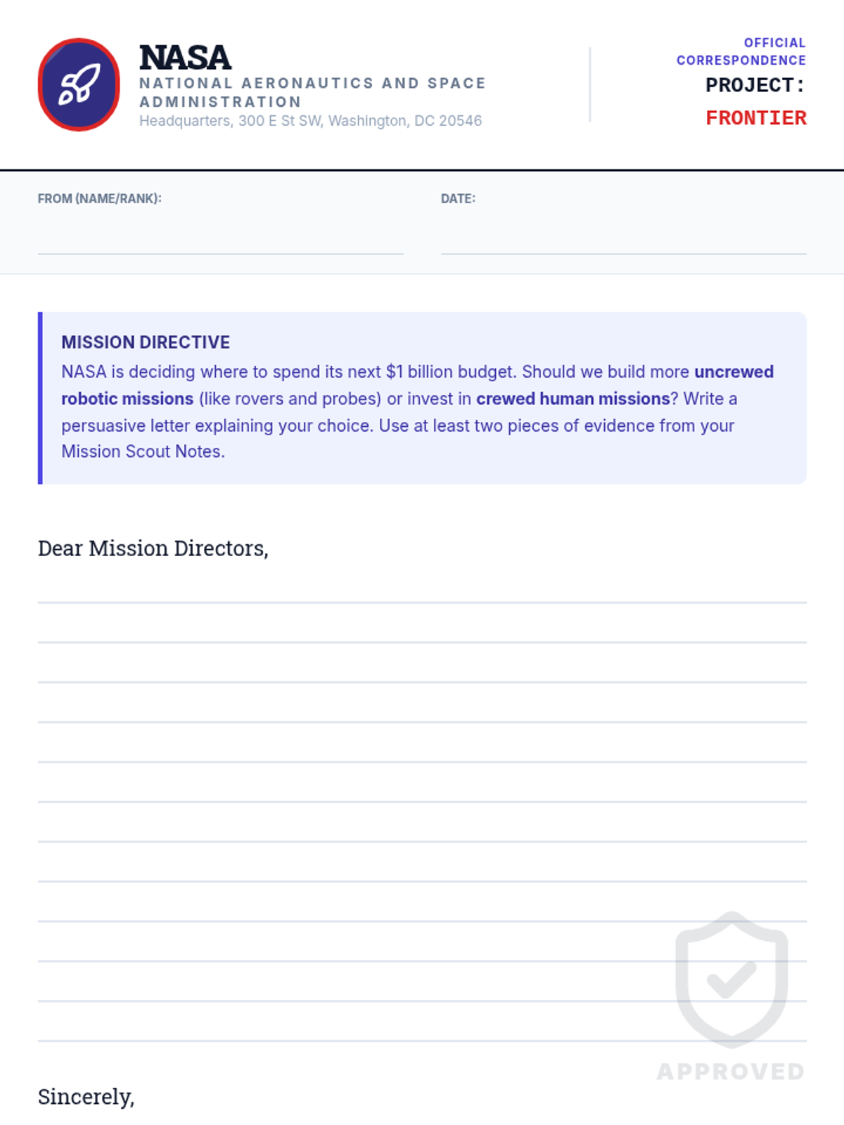 Students explore the advantages and disadvantages of human versus robotic space exploration, culminating in a persuasive letter to NASA based on evidence from a comparative analysis video.