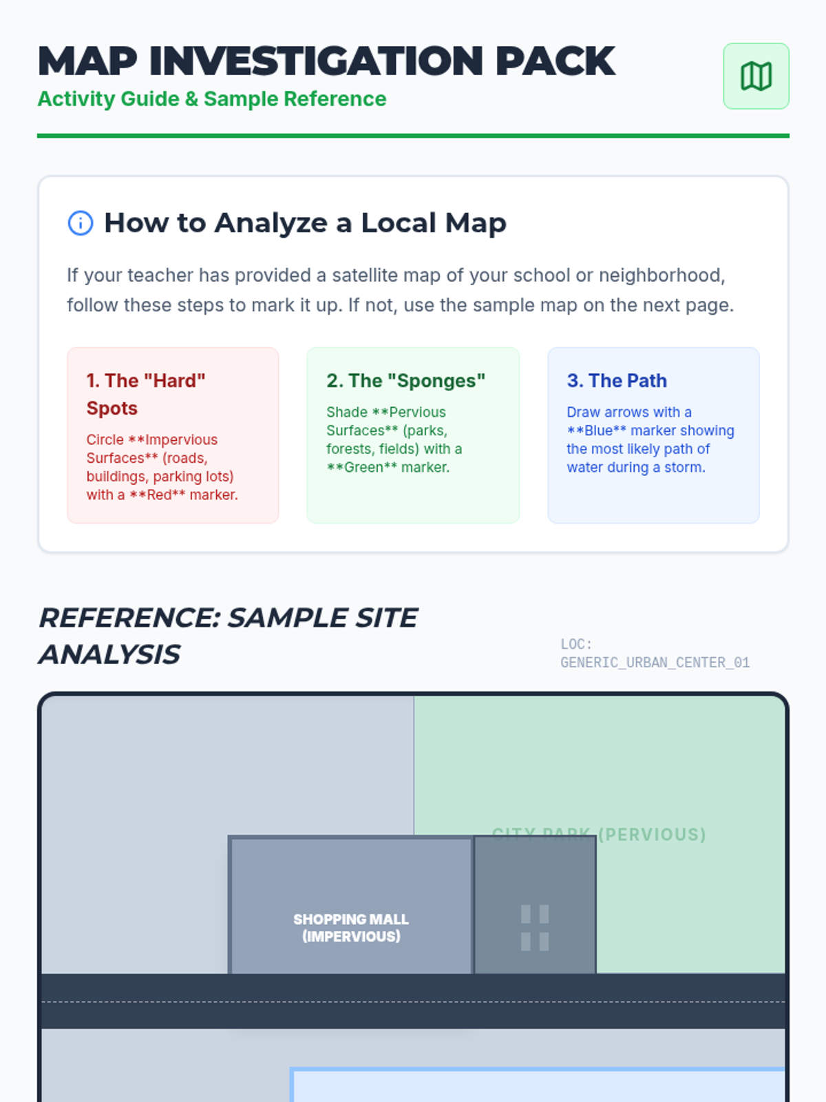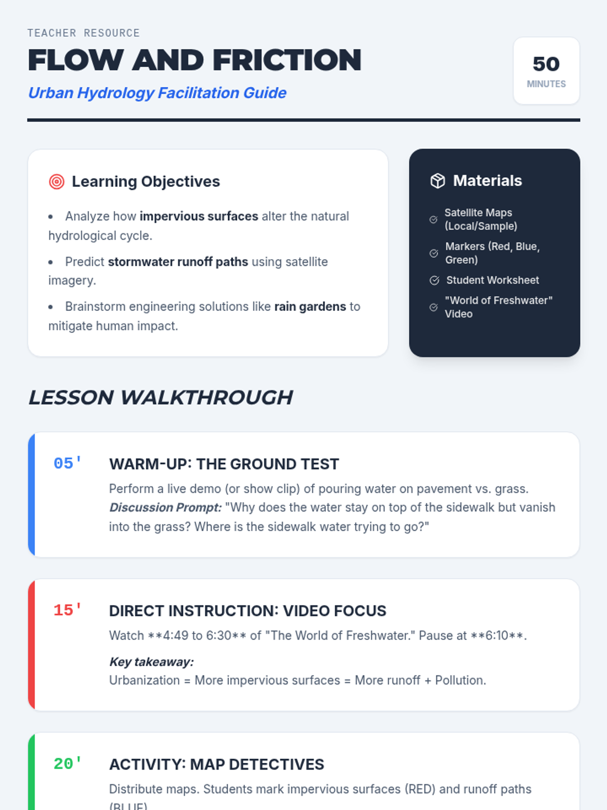 Students analyze how urbanization and impervious surfaces affect the hydrosphere, using satellite imagery to predict runoff paths and brainstorming sustainable urban design solutions.