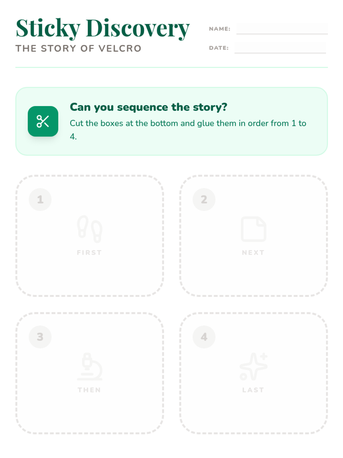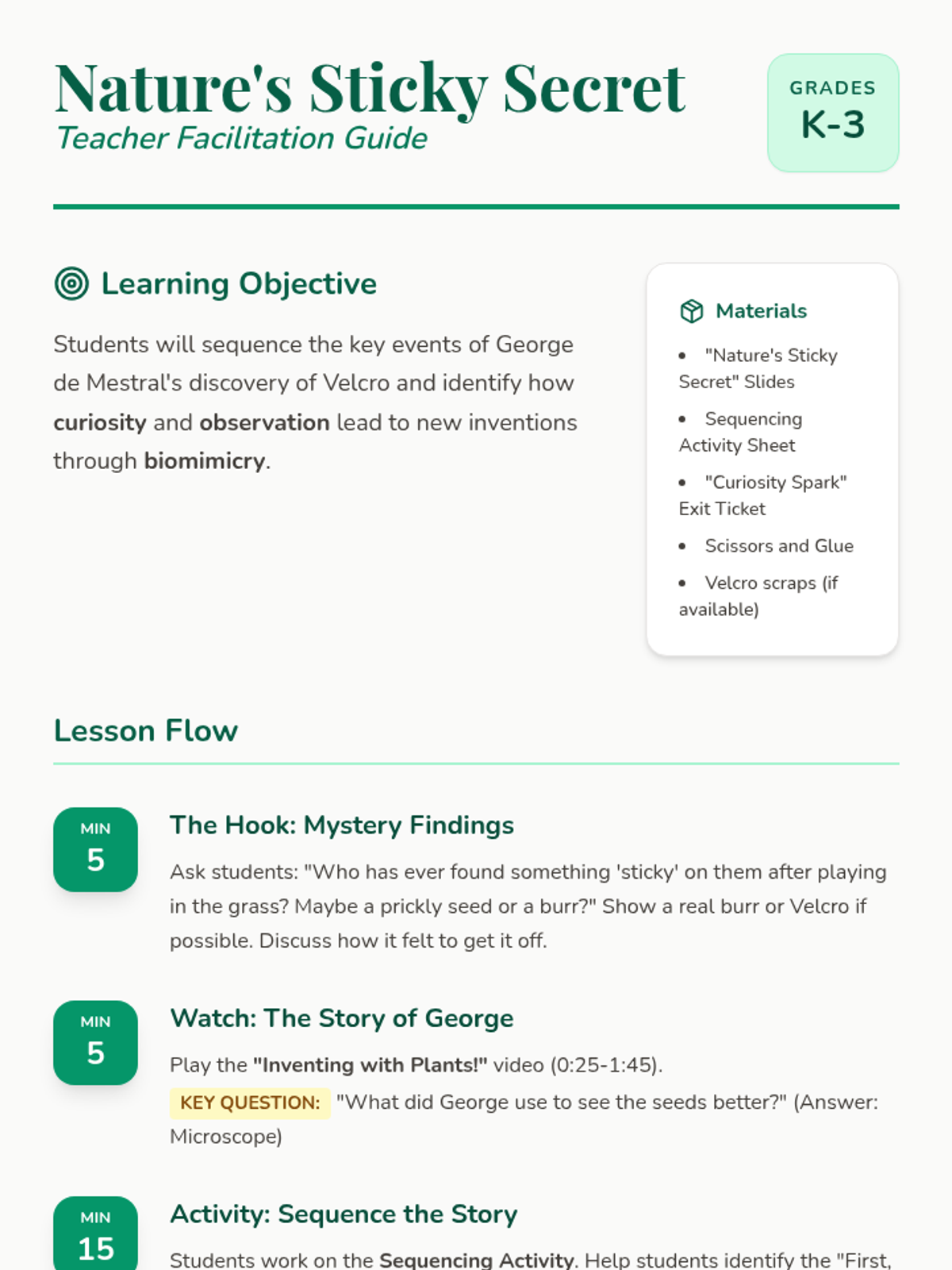 Students will sequence the story of George de Mestral's invention of Velcro, exploring the scientific concept of biomimicry and the character trait of curiosity. This K-3 literacy-integrated science lesson uses a story-based approach to teach sequencing and observation skills.