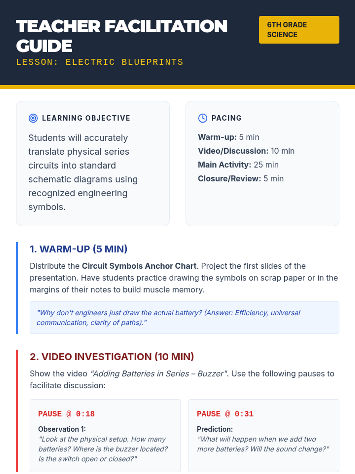 A hands-on lesson where 6th-grade students learn to translate physical circuit components into professional schematic diagrams using a series circuit with a buzzer.