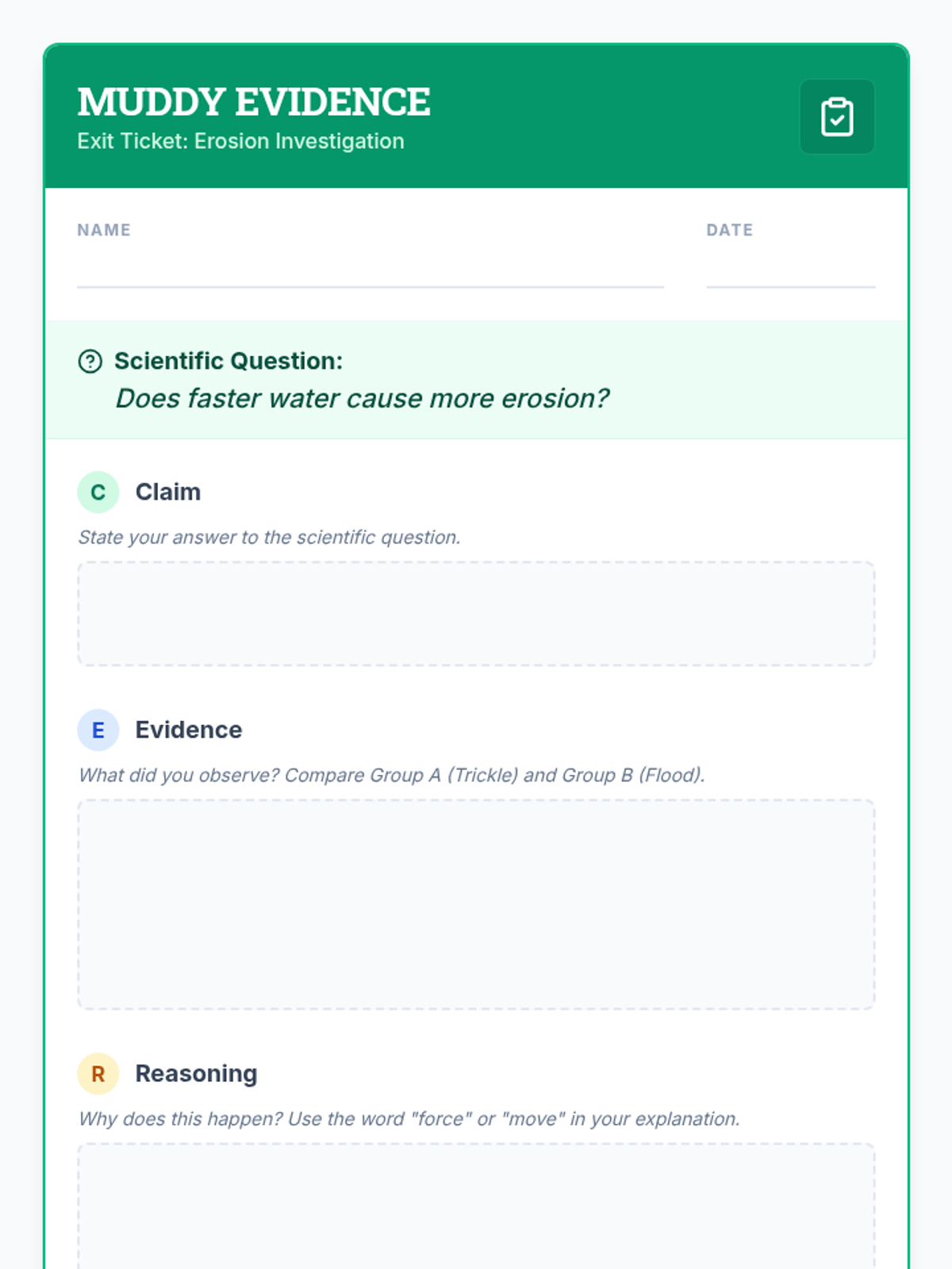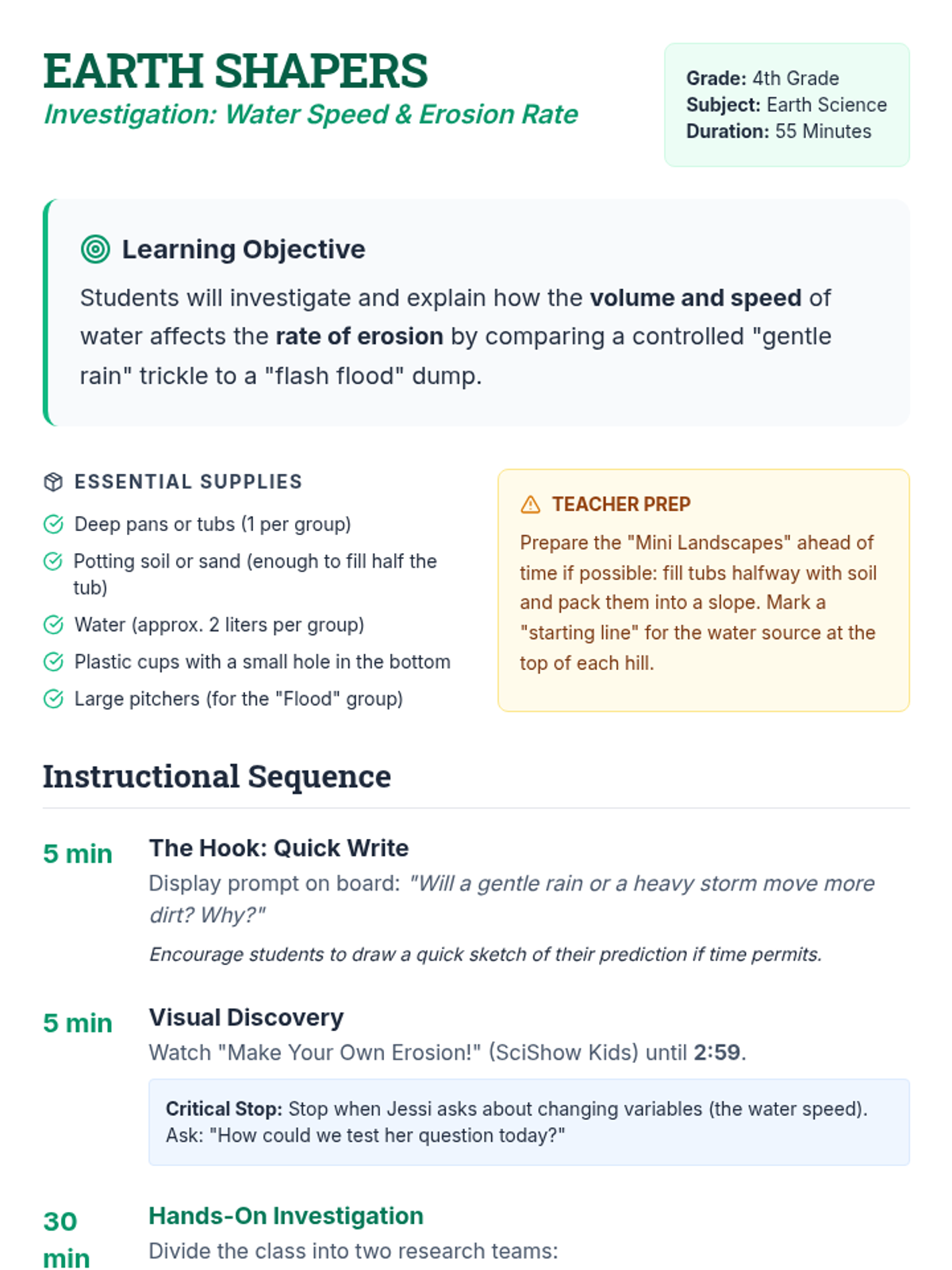 A 4th-grade science lesson where students investigate how the speed and volume of water impact the rate of erosion through a hands-on simulation. Students compare a 'gentle trickle' to a 'flash flood' to observe changes in a mini landscape.