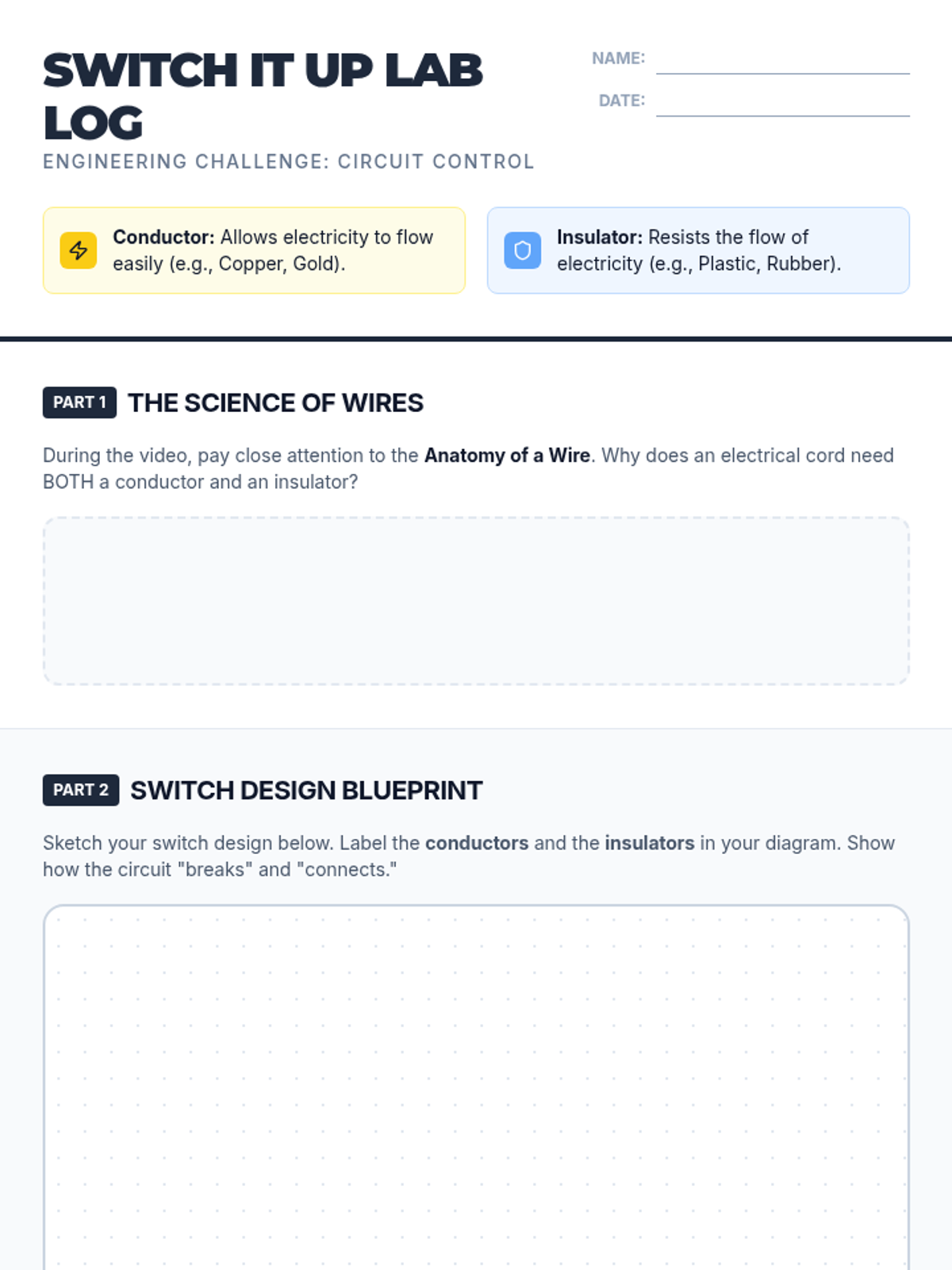 Students explore the properties of conductors and insulators by designing and building their own functional circuit switches using everyday materials.