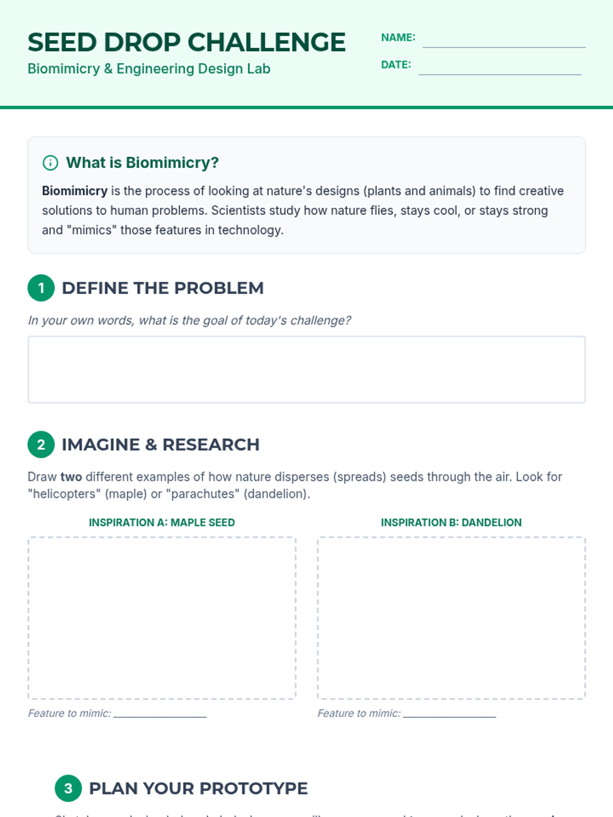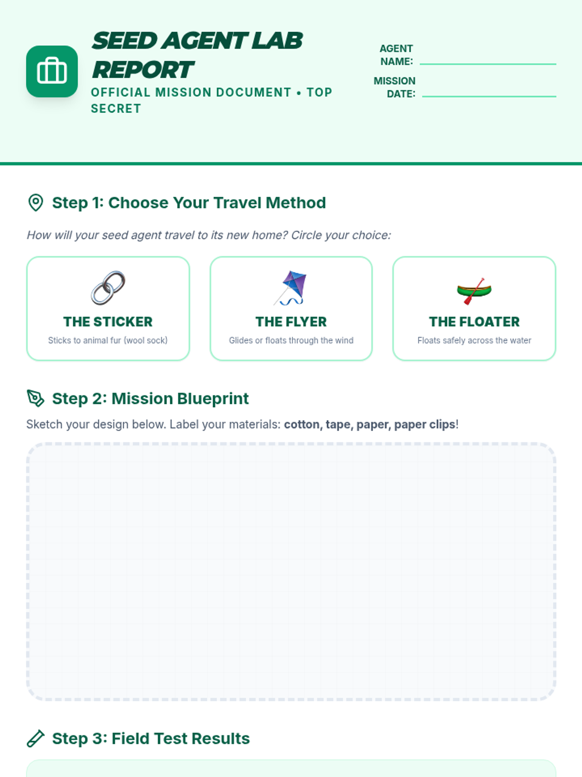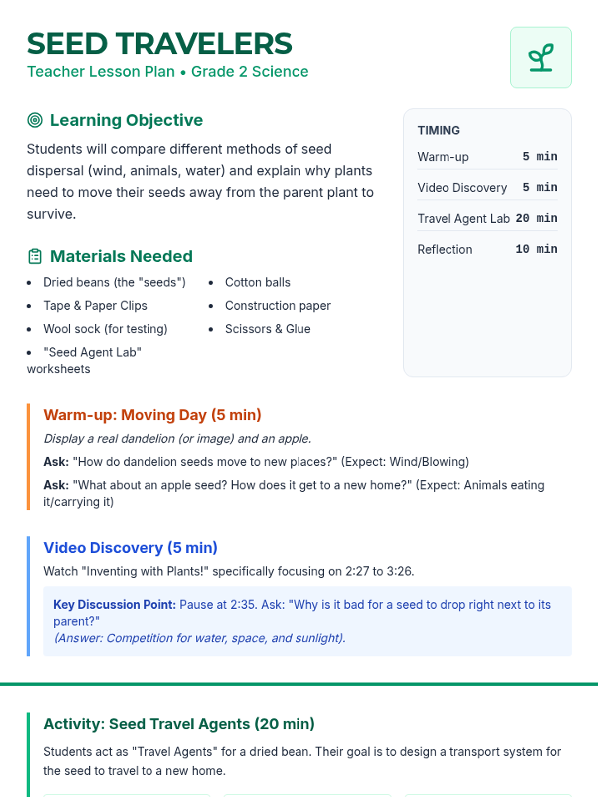 A 2nd-grade science lesson exploring seed dispersal through biomimicry and hands-on engineering, featuring the 'Seed Travel Agents' activity.