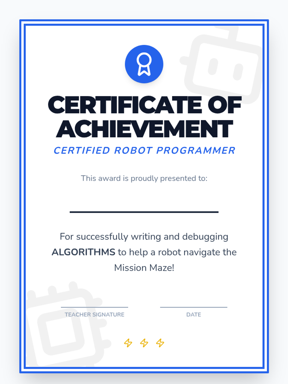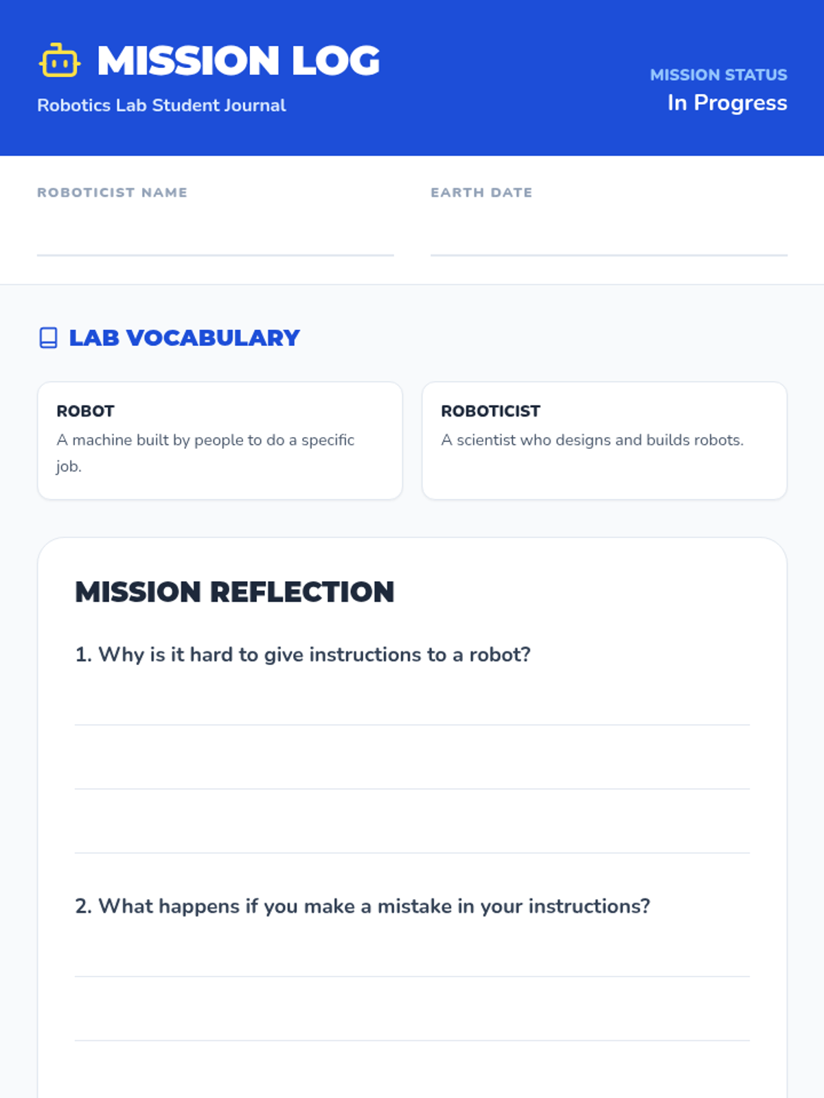Students explore the world of robots, define the role of a roboticist, and practice algorithmic thinking through a literal-instruction activity.