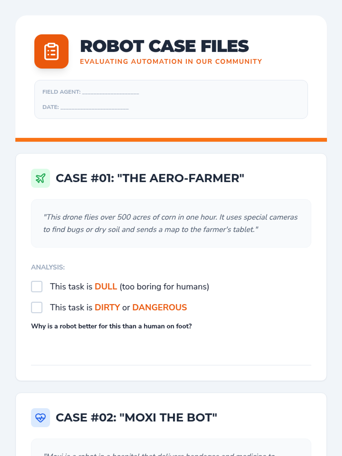 Students examine case studies of how robots and automated systems assist in jobs like farming, manufacturing, and medicine. They discuss the difference between dangerous tasks suitable for robots and creative tasks best for humans.