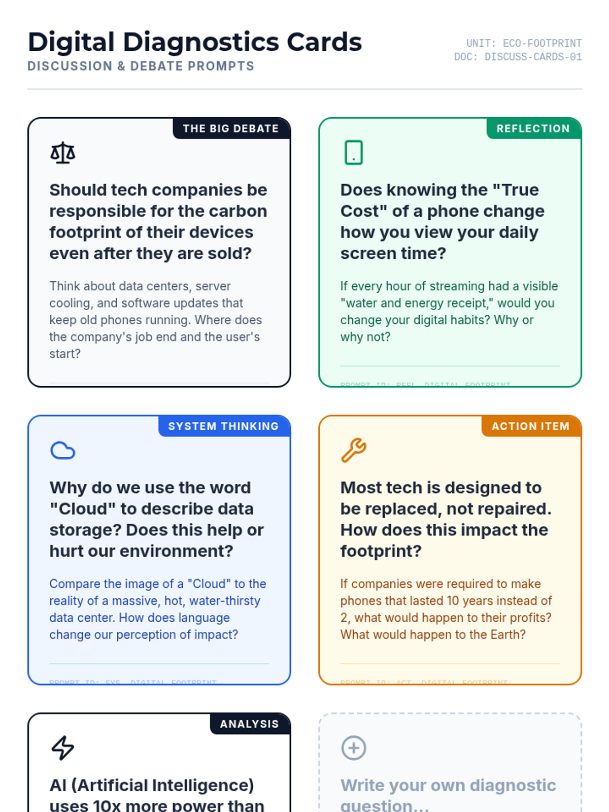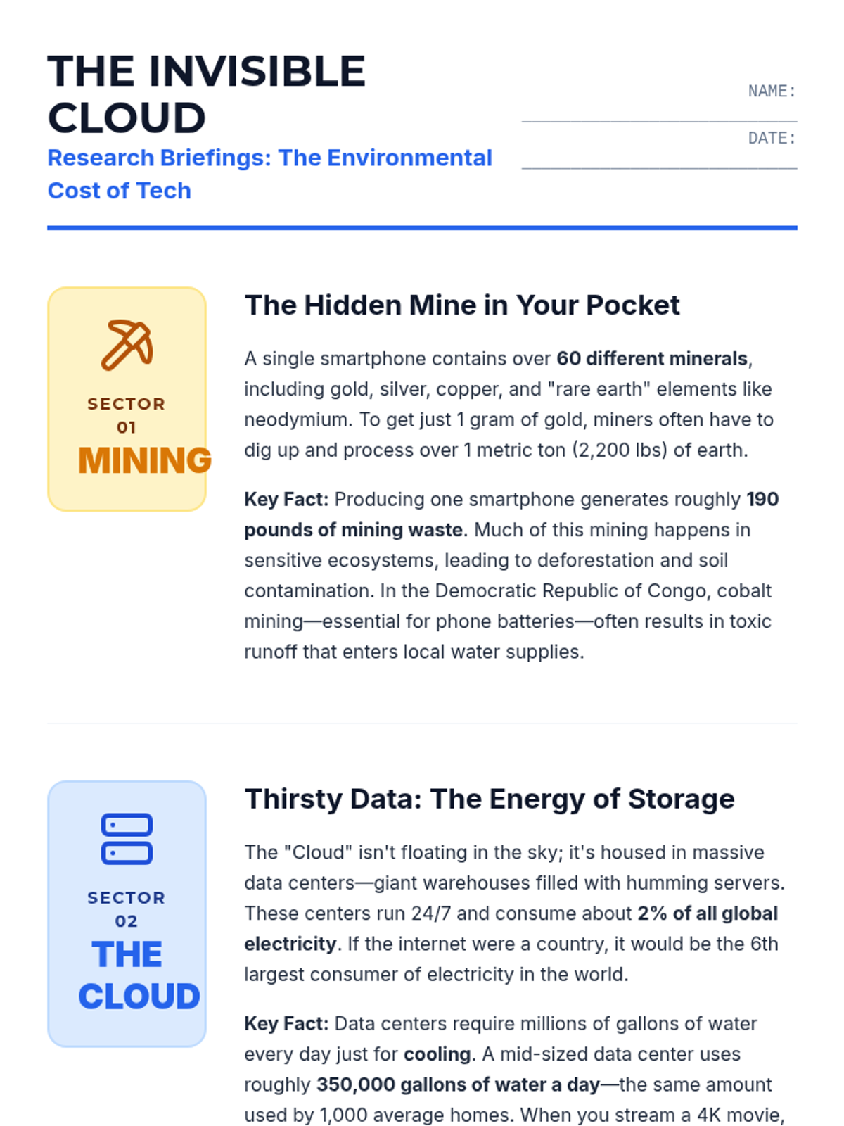 Students will investigate the hidden environmental costs of digital technology, analyzing how internet usage, device manufacturing, and data centers contribute to an individual's ecological footprint.