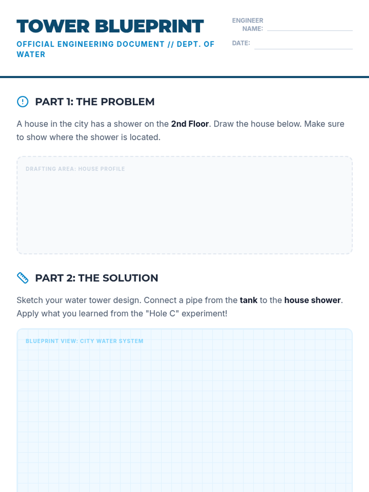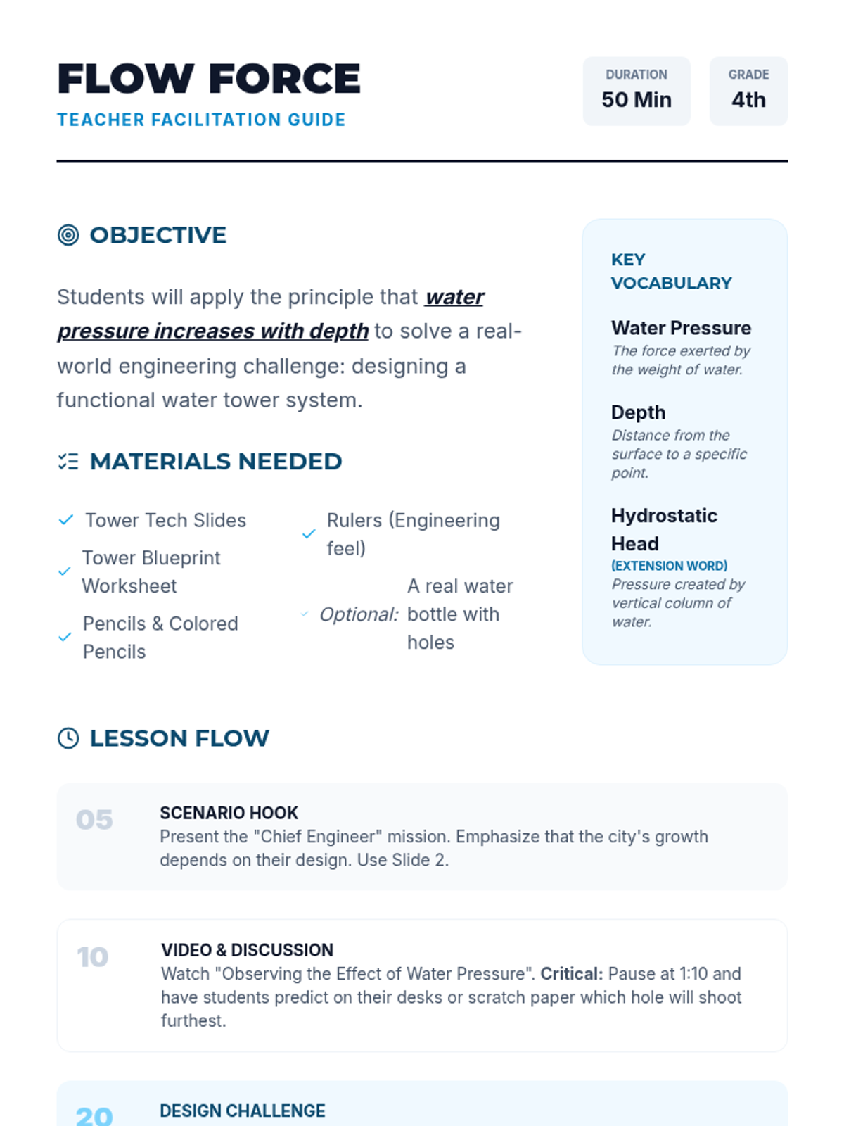 In this lesson, 4th-grade students explore the relationship between depth and water pressure through a hands-on design challenge. They watch an experiment demonstration and apply their findings to engineer a functional water tower system for a local town.