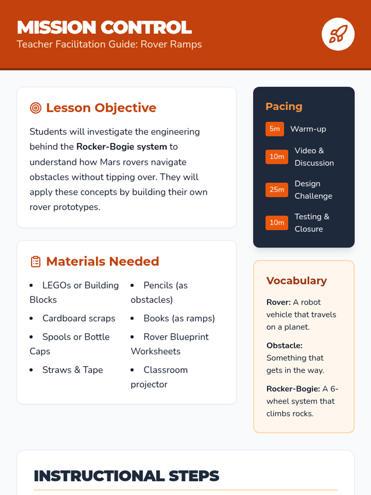 A hands-on engineering lesson where students explore the Rocker-Bogie suspension system used by Mars rovers to navigate rocky terrain without tipping over.
