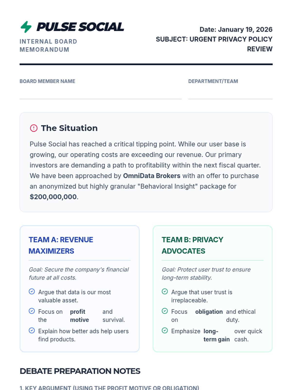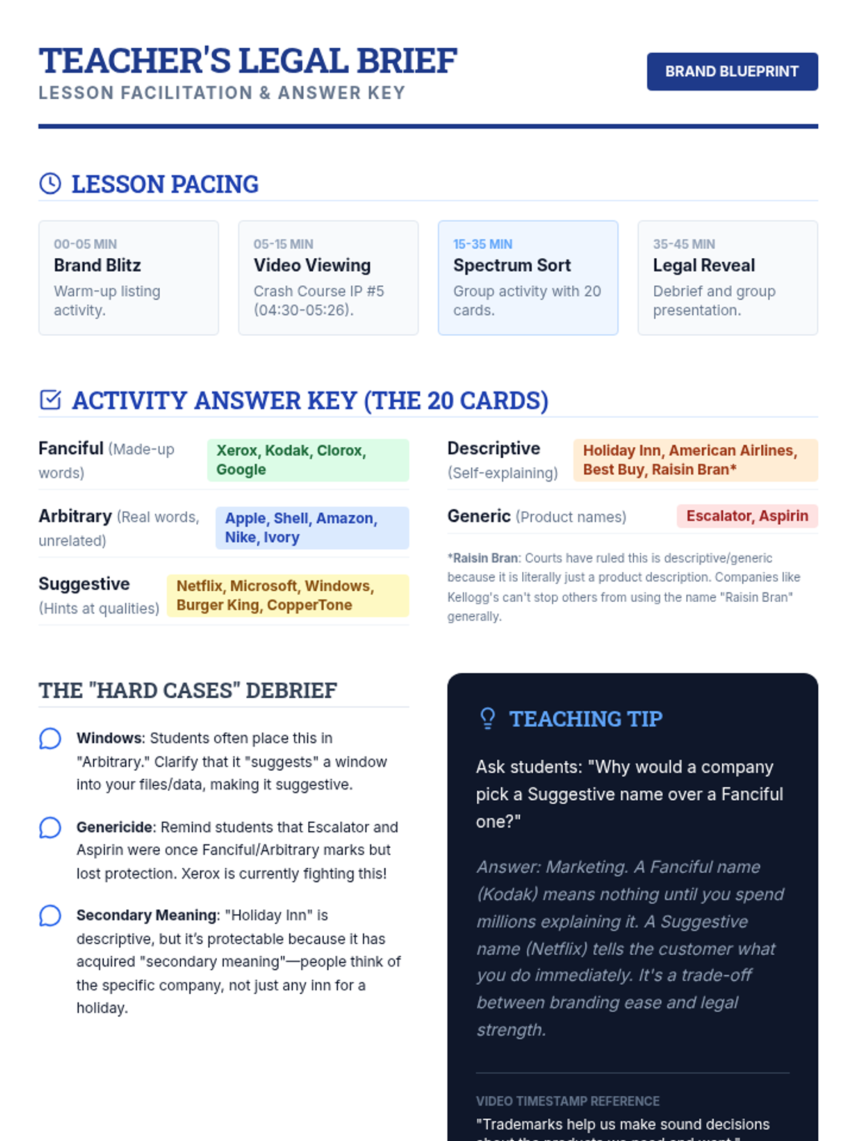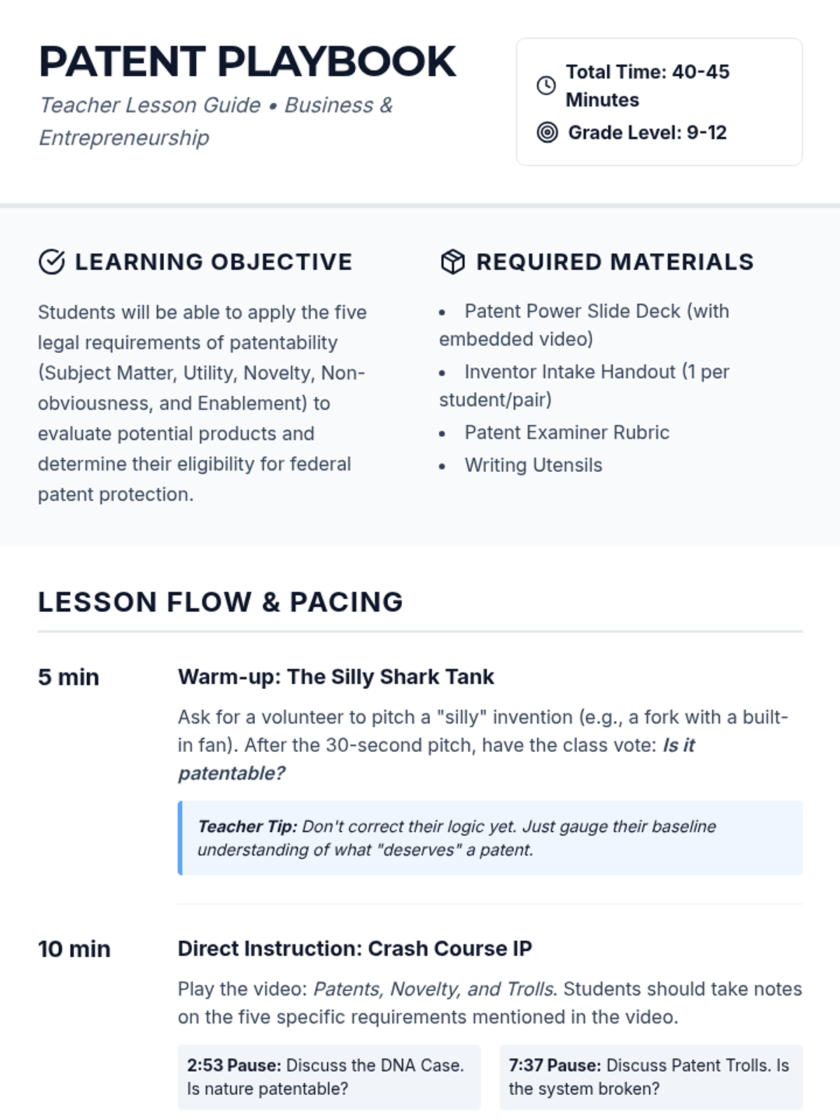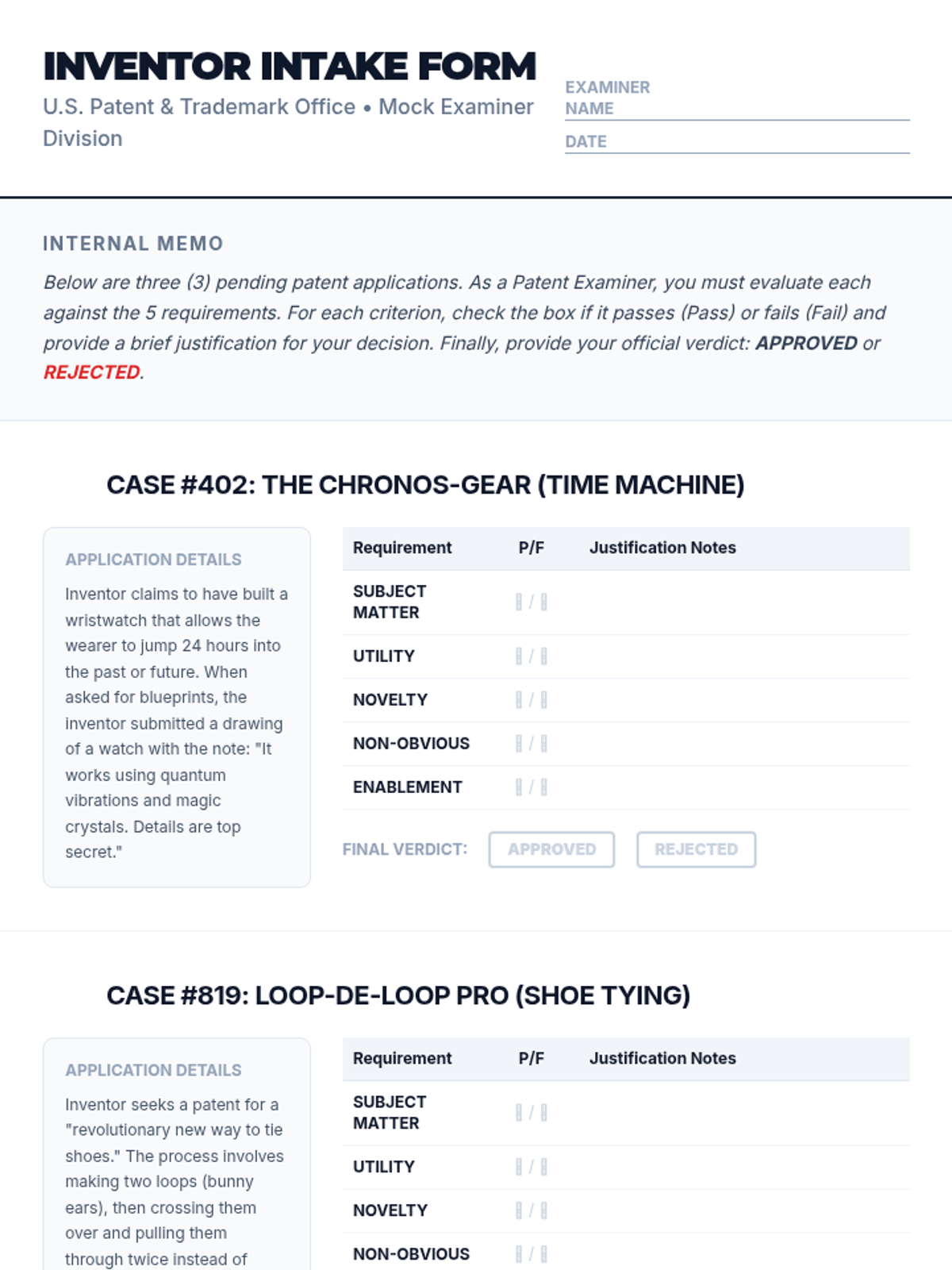 Students step into the shoes of patent examiners to evaluate inventions against the five legal requirements for patentability: Subject Matter, Utility, Novelty, Non-obviousness, and Enablement. through a silly warm-up, a Crash Course video, and case study analysis, students learn the delicate balance between protecting innovation and public access.