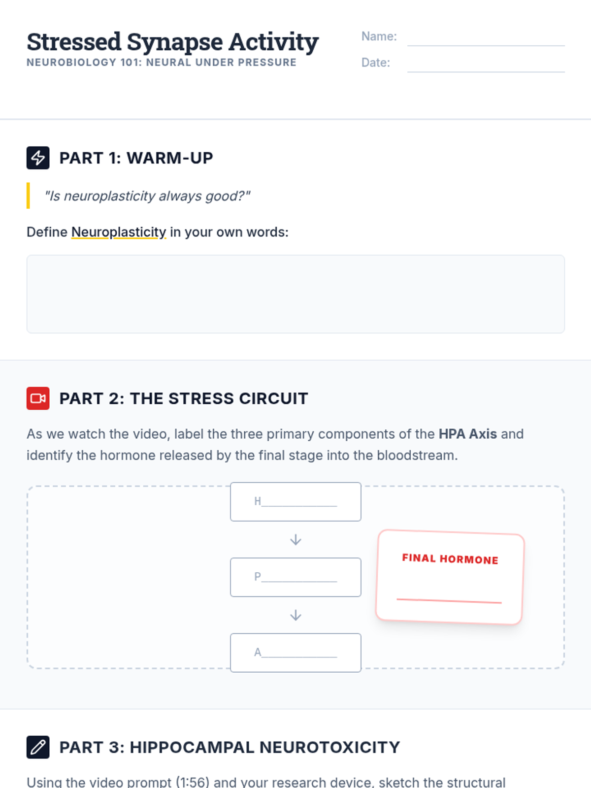 An undergraduate-level neuroscience lesson exploring the physiological and cellular impacts of chronic stress on the brain, specifically focusing on the HPA axis, cortisol-induced neurotoxicity, and the role of BDNF in neuroplasticity.