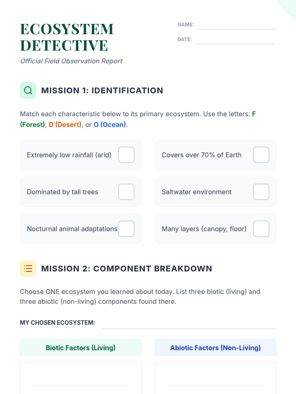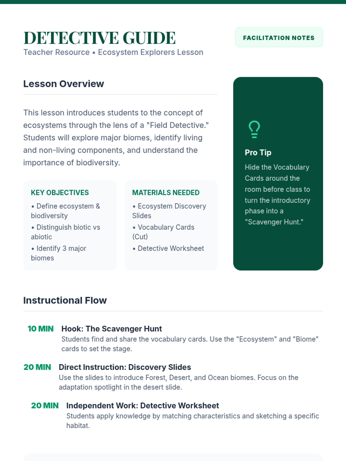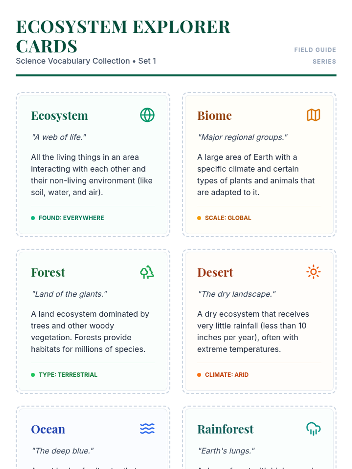 A lesson introducing students to various ecosystems through vocabulary and visual identification. Students will learn the key characteristics of different biomes including forests, deserts, and oceans.