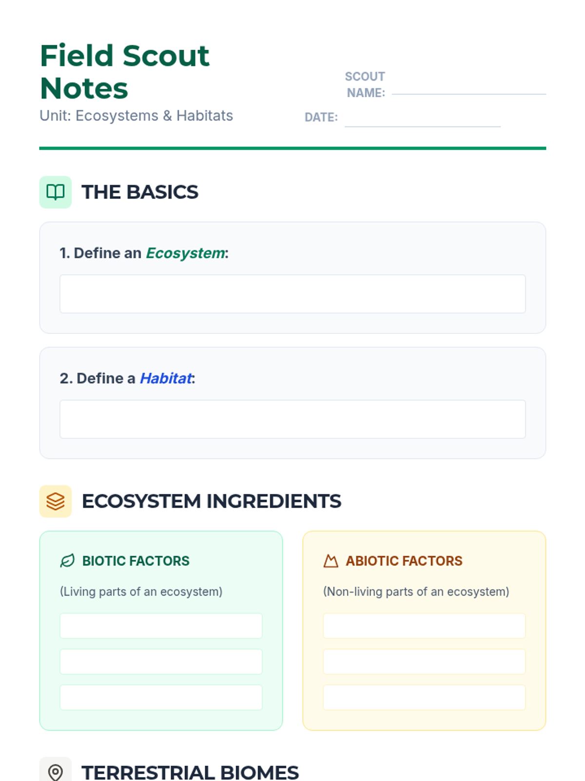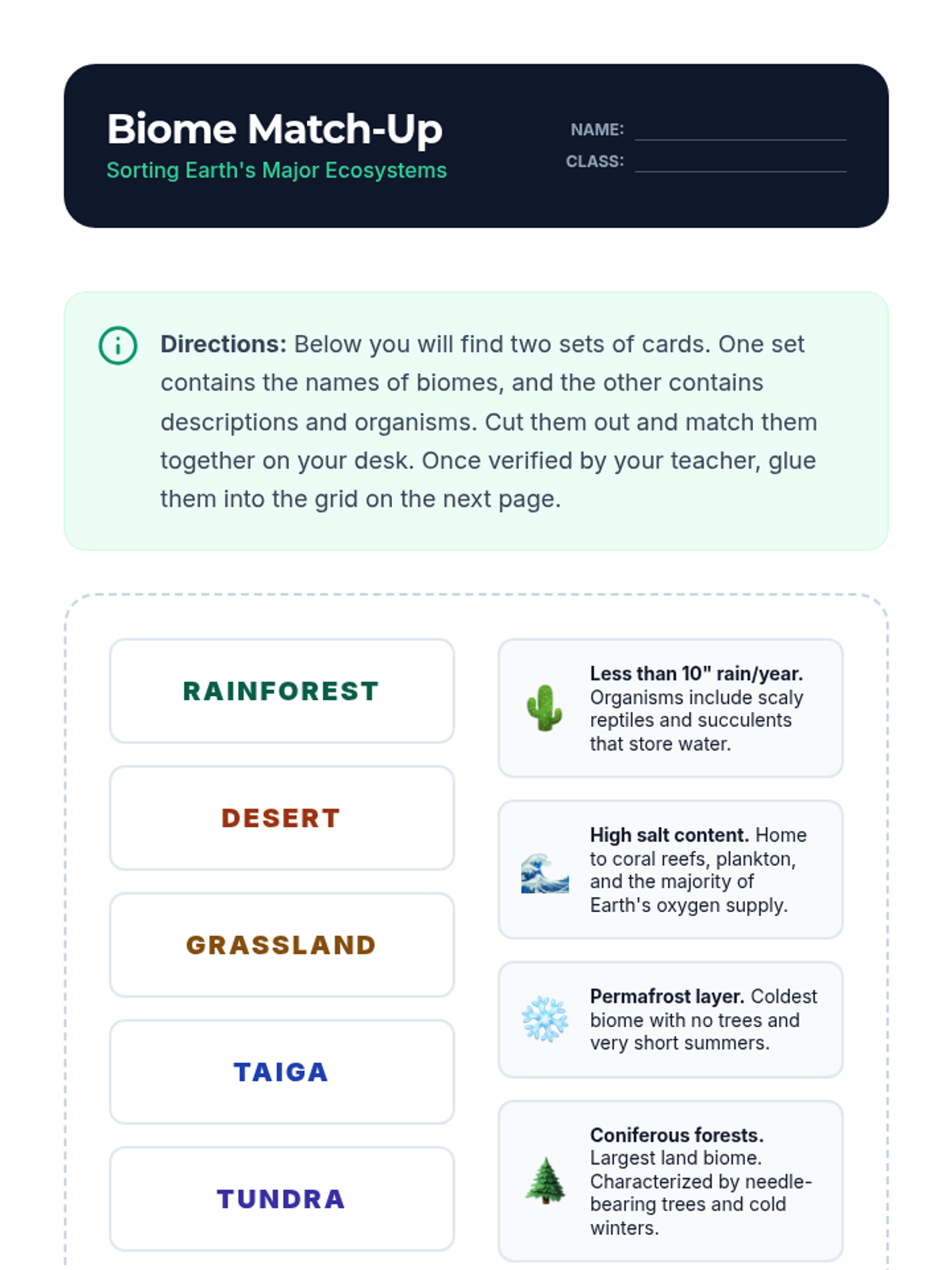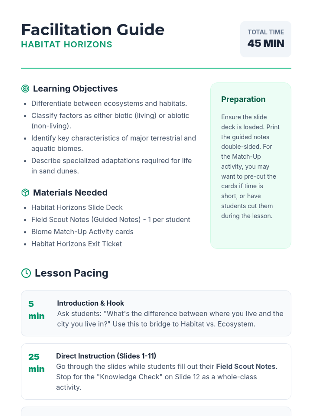 A lesson introducing students to various ecosystems through vocabulary and visual identification. Students will learn the key characteristics of different biomes including forests, deserts, and oceans.
