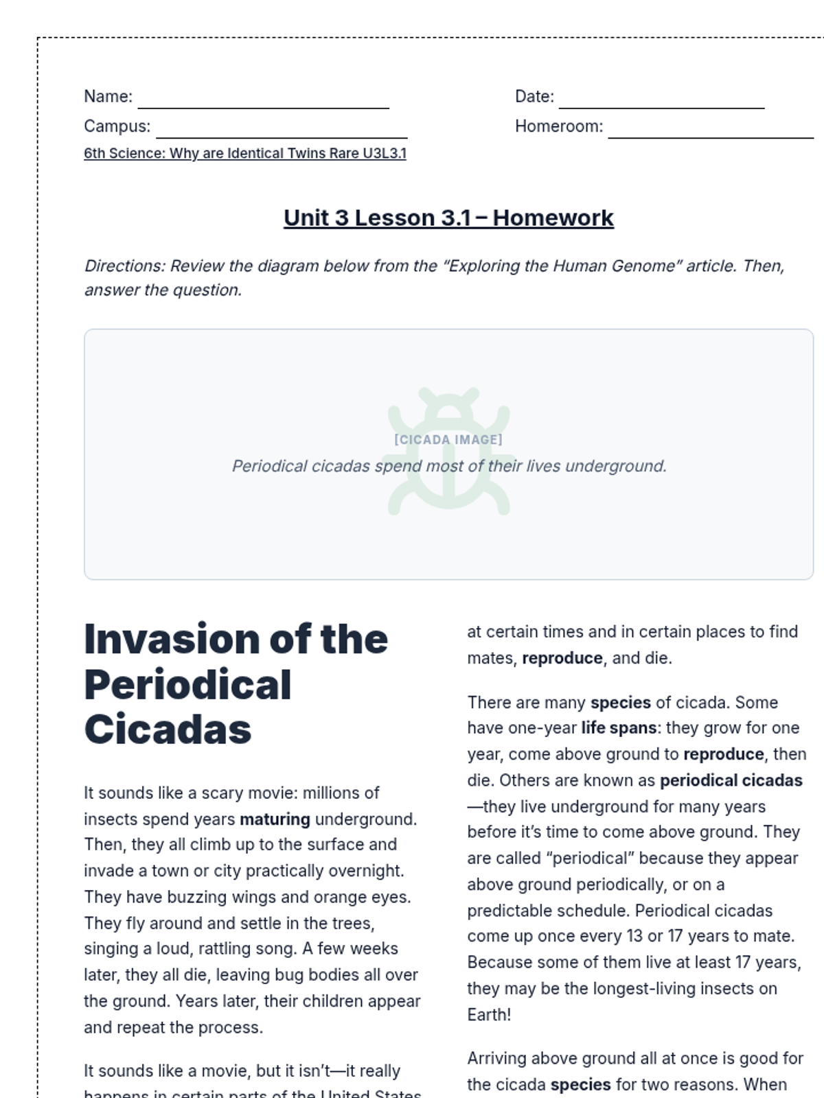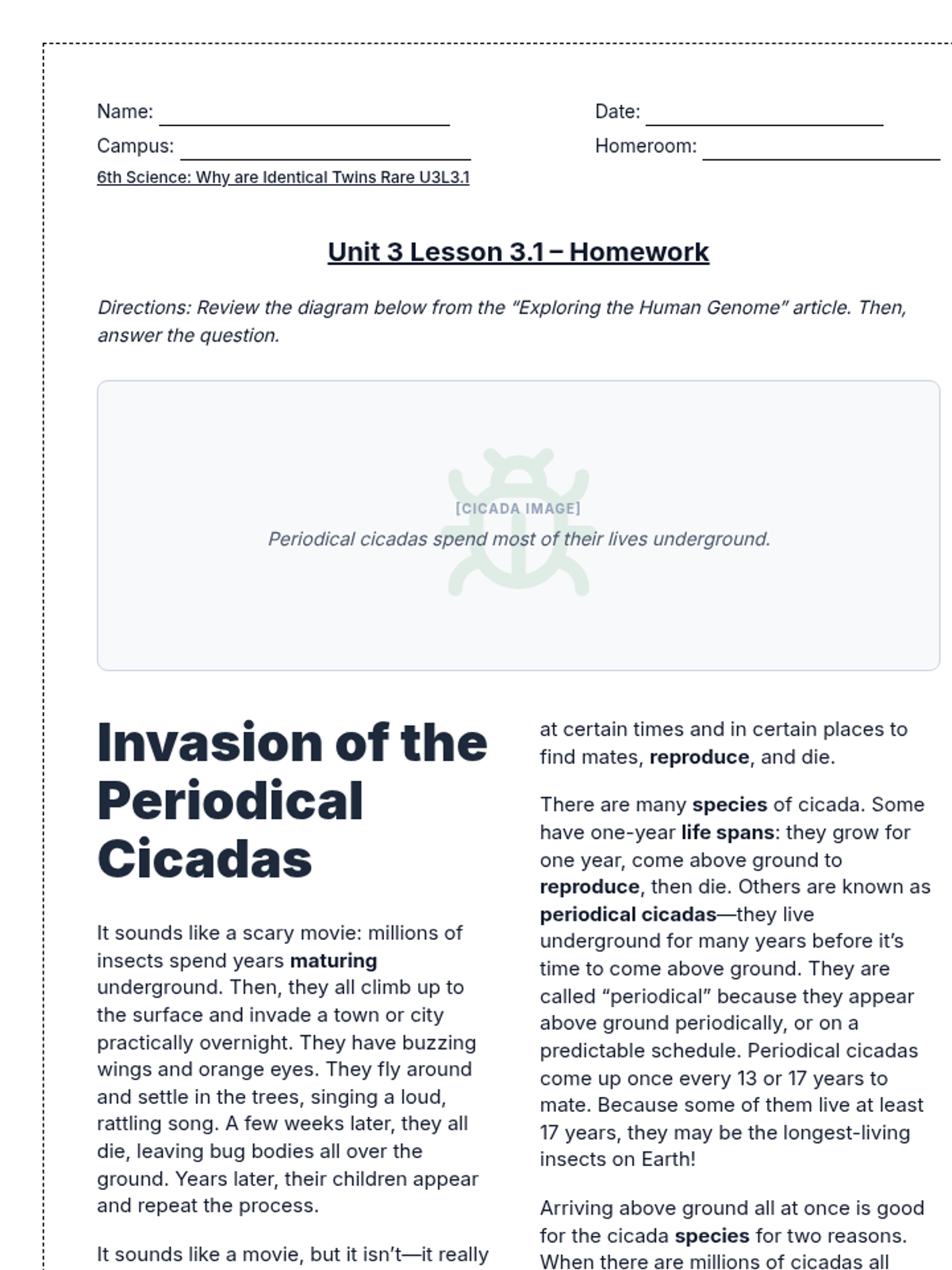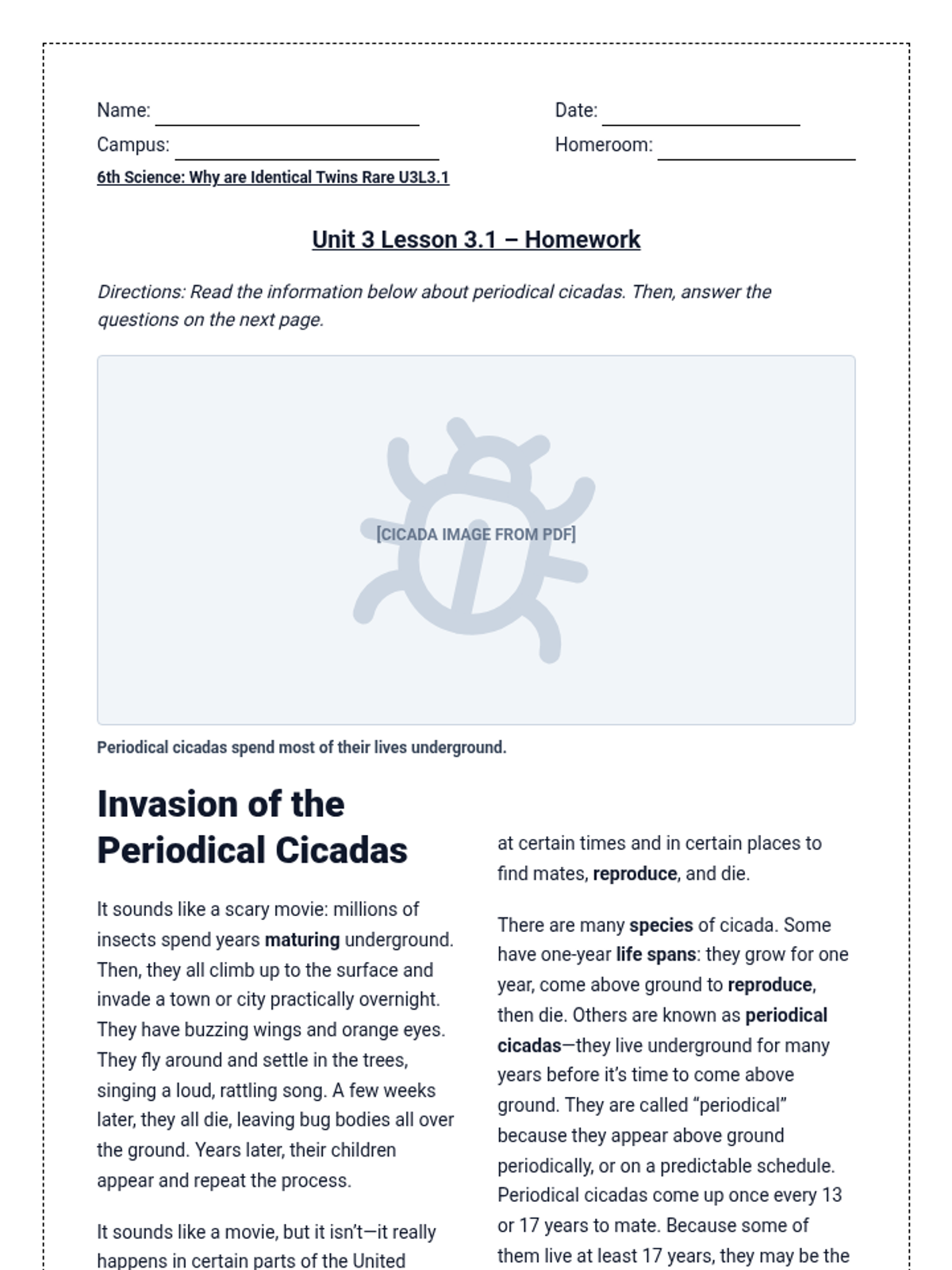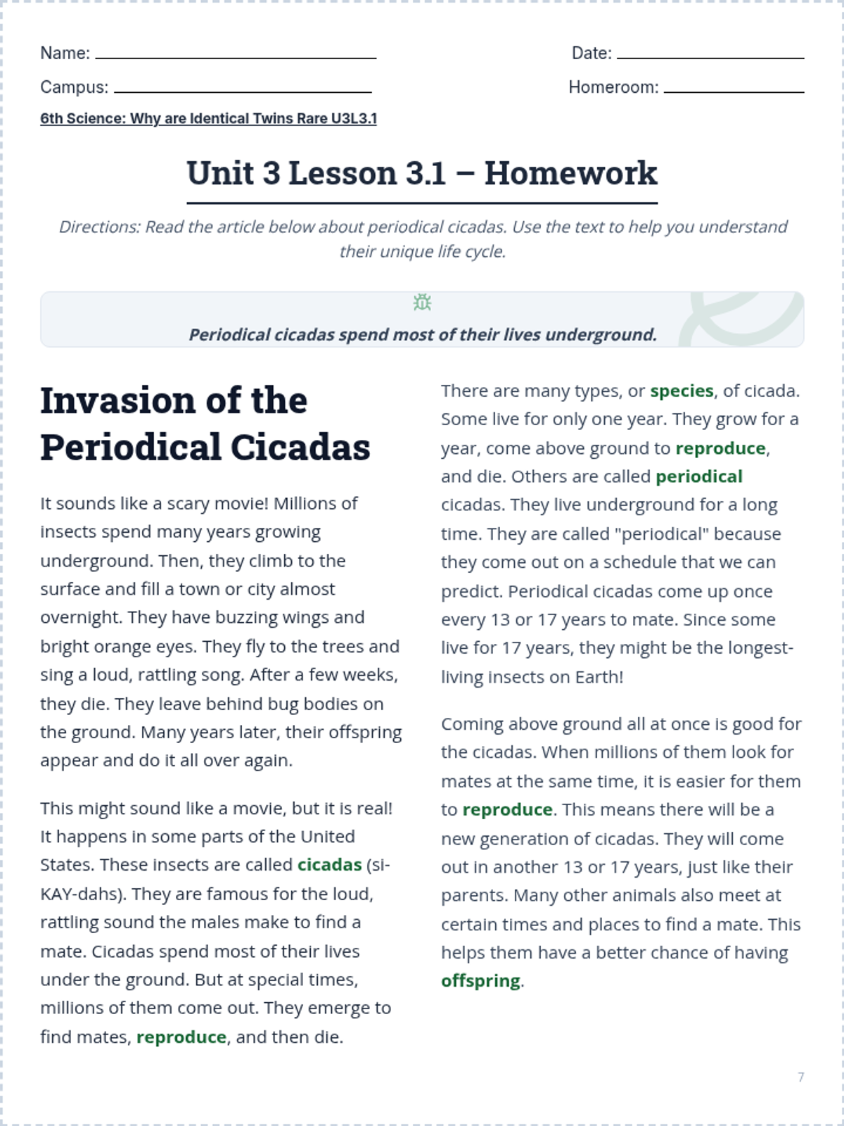 A lesson exploring the unique life cycle of periodical cicadas and how their emergence patterns help them survive and reproduce.