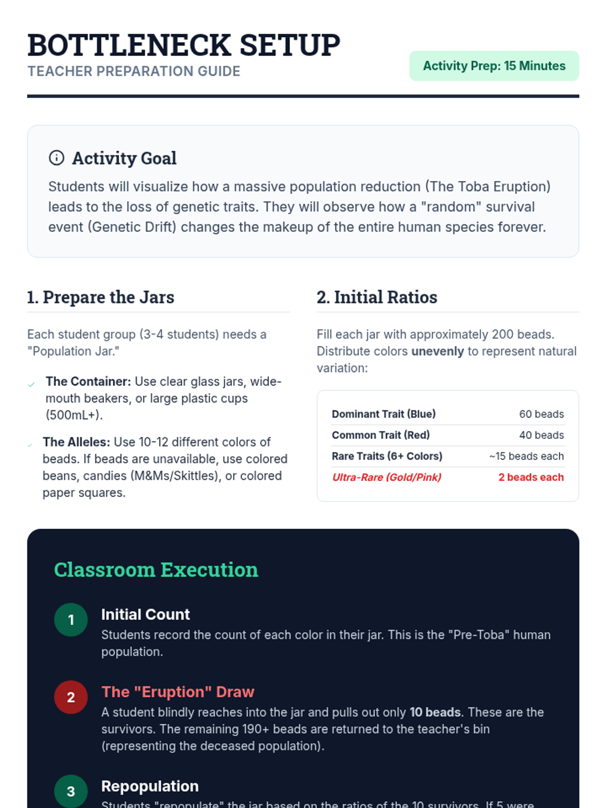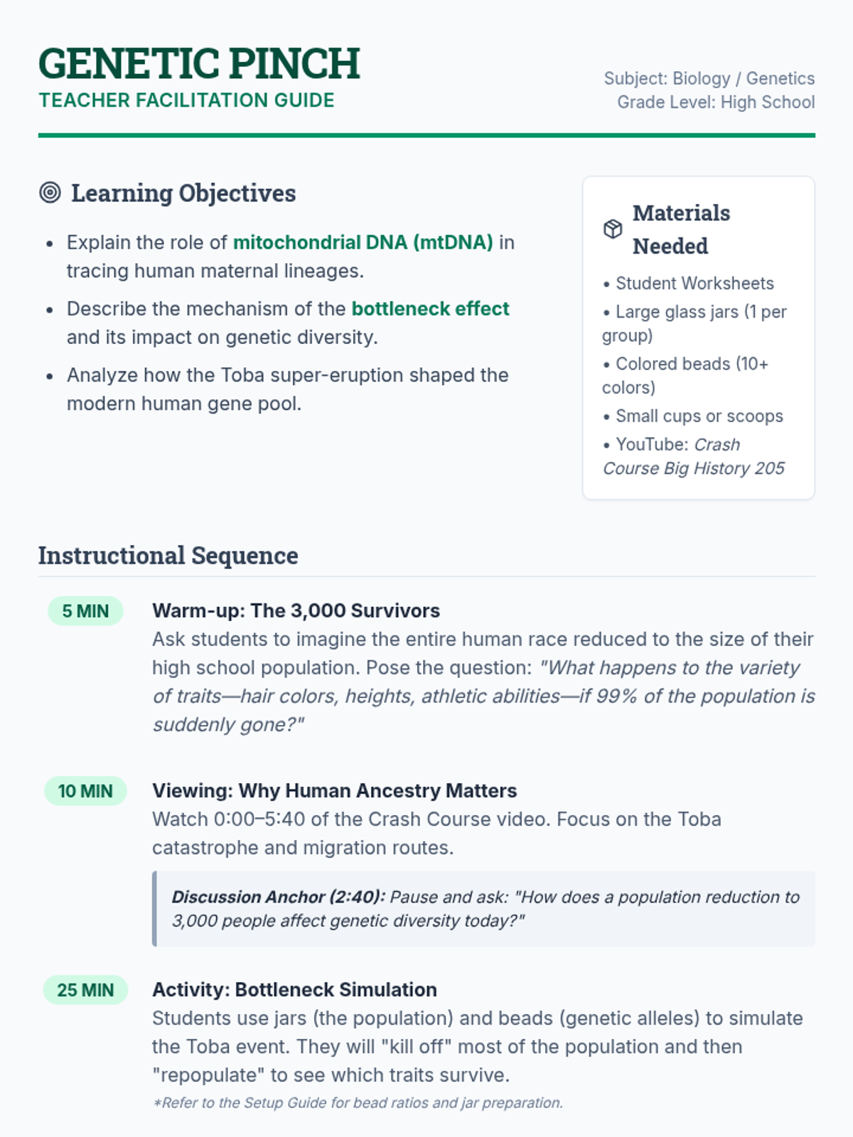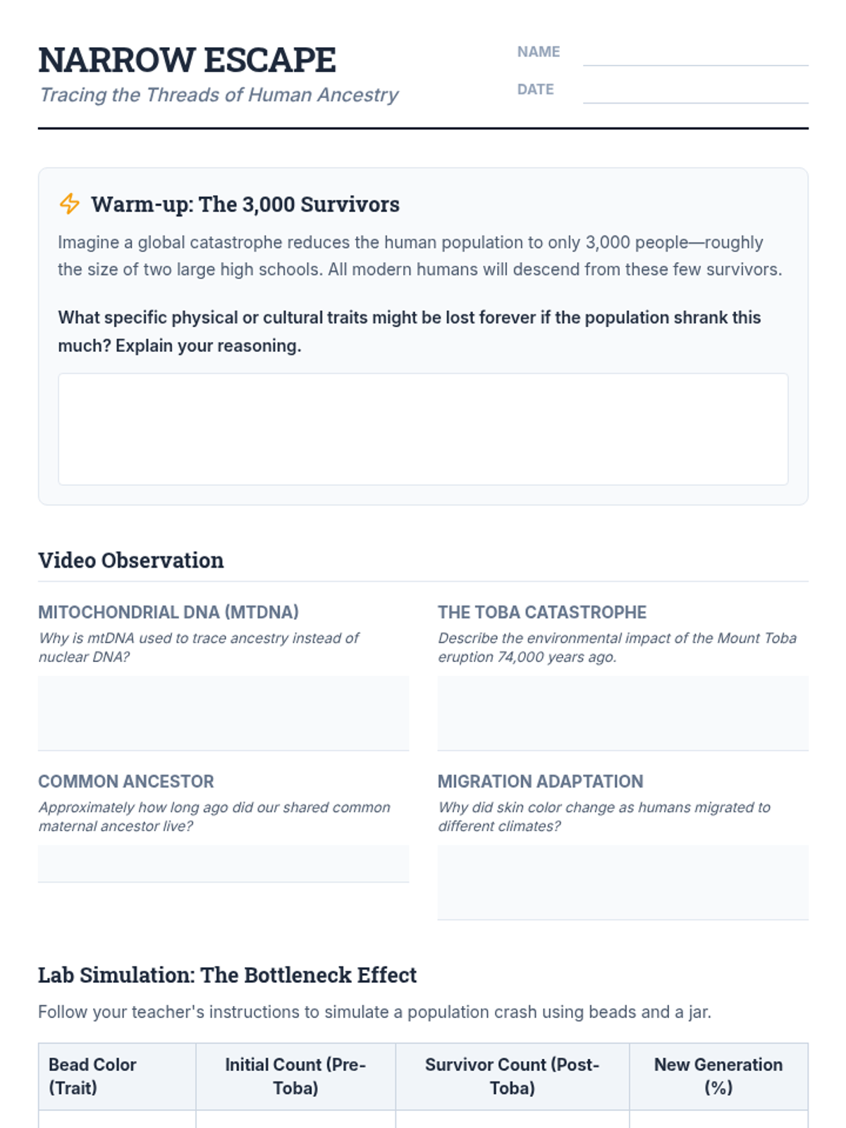 A lesson exploring human evolution through the lens of the Toba catastrophe and mitochondrial DNA. Students simulate a genetic bottleneck to understand why modern humans share such high genetic similarity.
