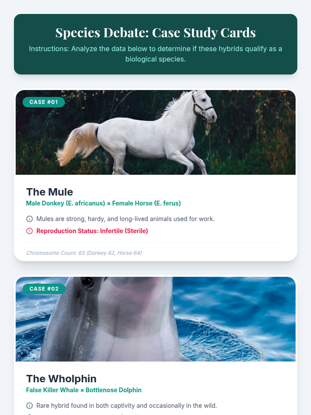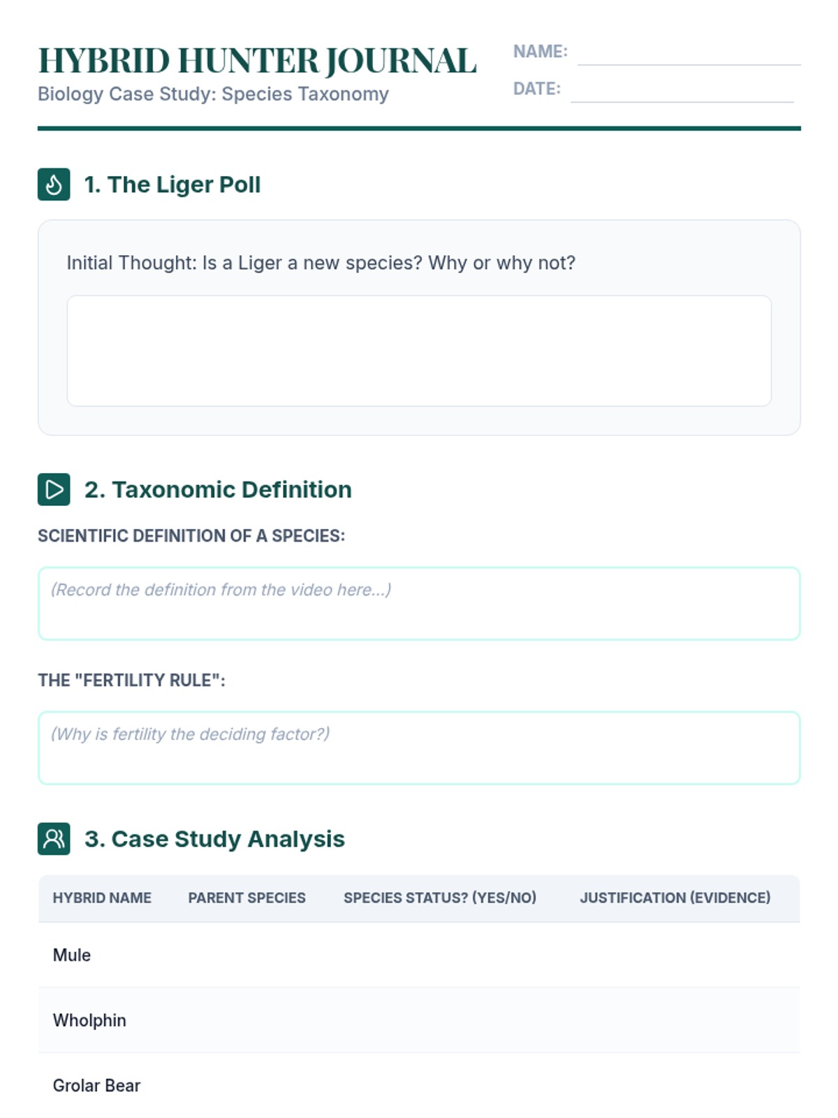 A High School Biology lesson exploring the biological definition of a species through the lens of hybrid animals, featuring video analysis, small-group debate, and written reflection.