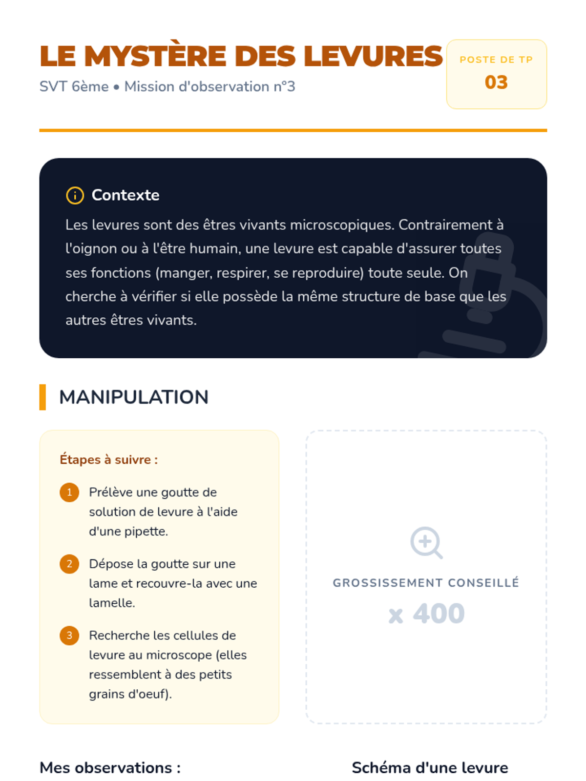 Observation d'organismes composés d'une seule cellule comme les levures ou les paramécies.