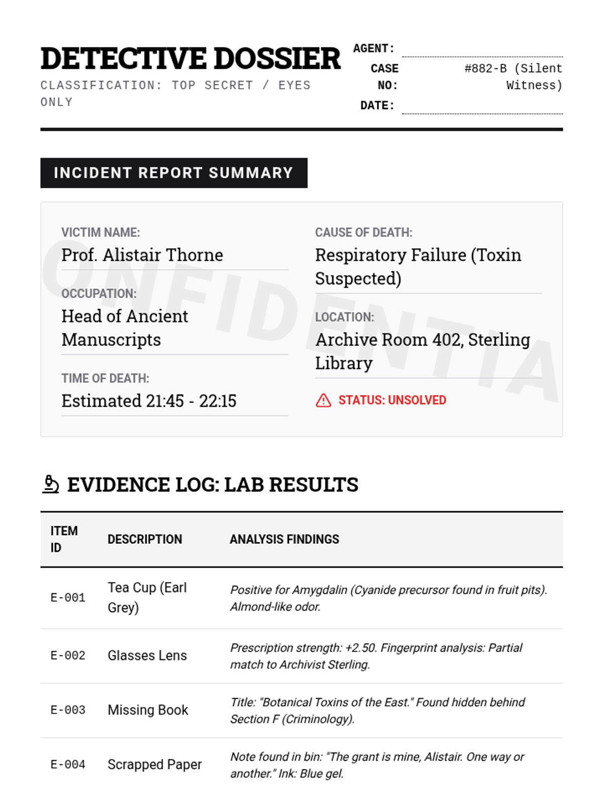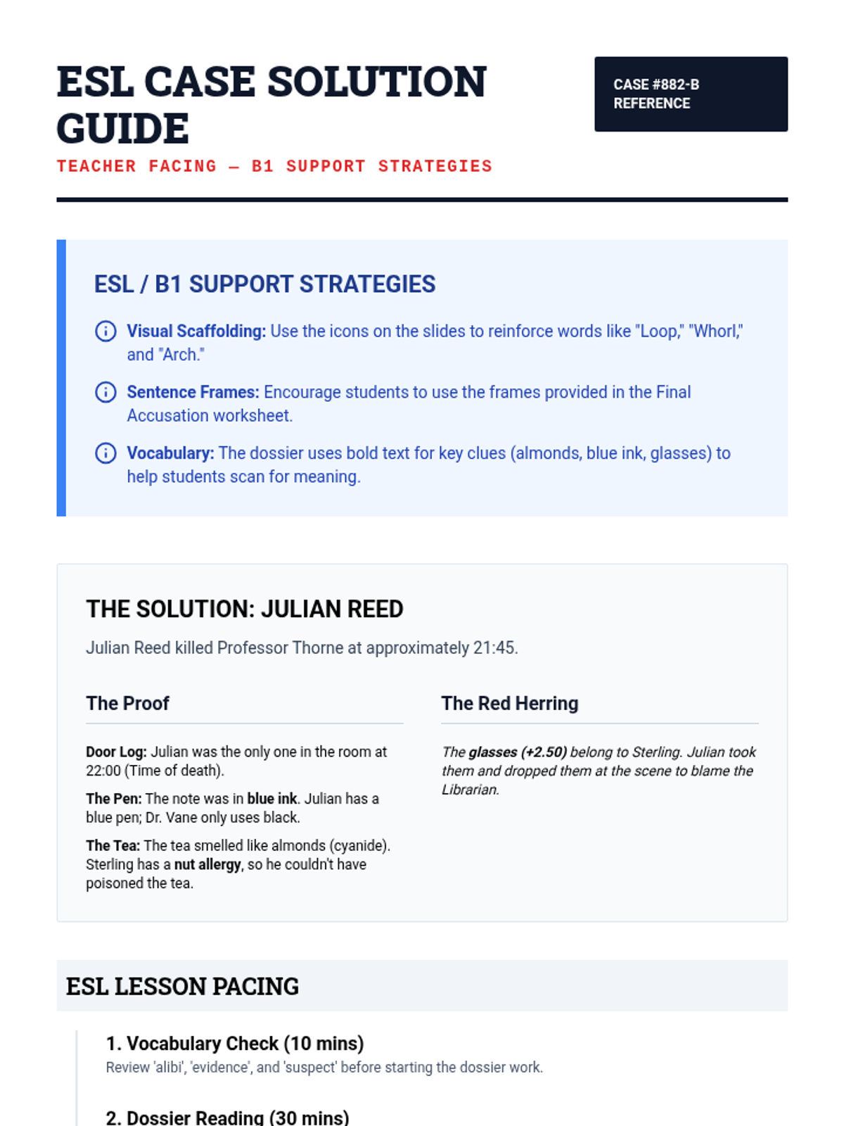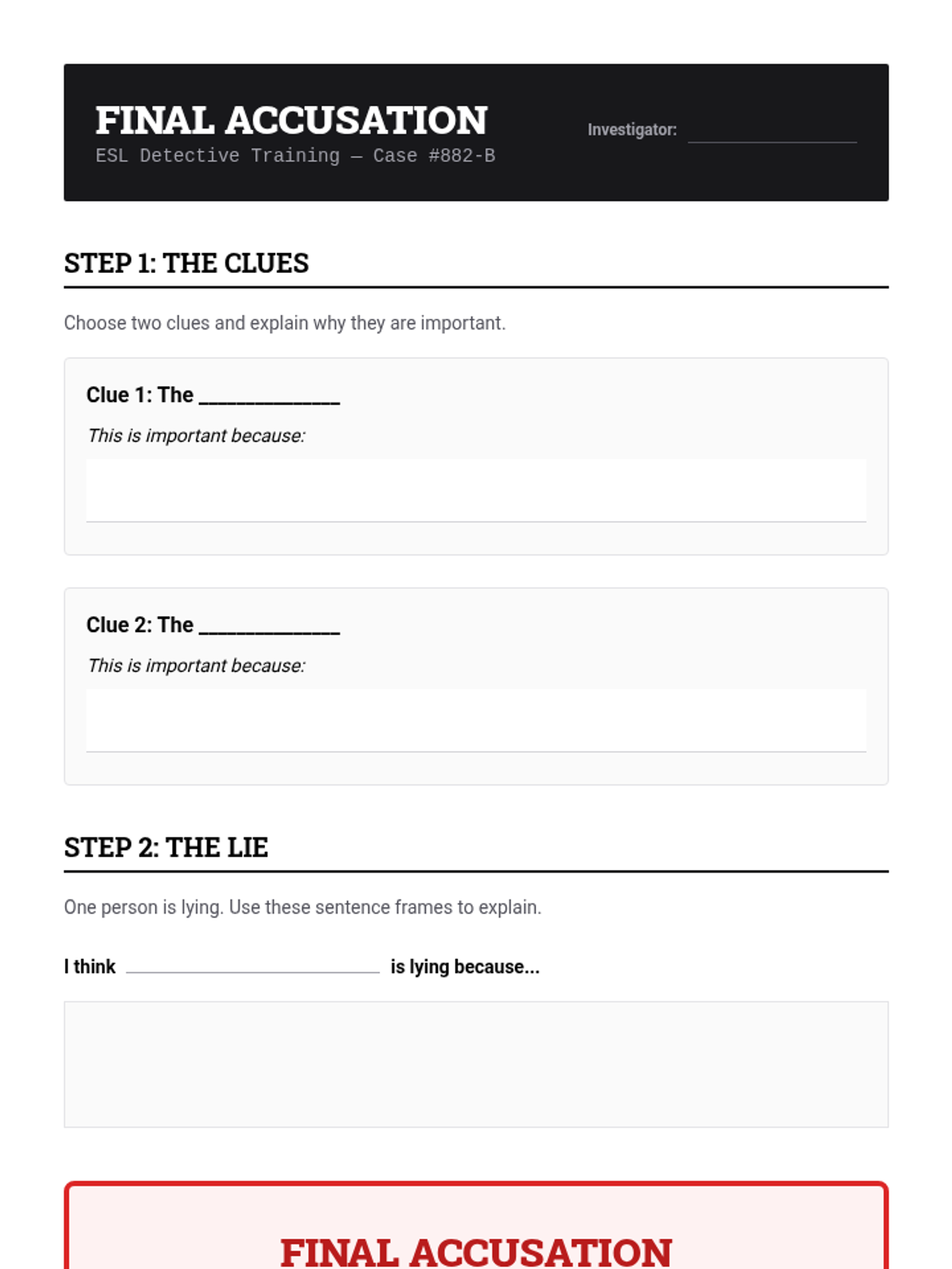 A simplified murder mystery investigation. Students use a detective dossier with B1-level text to solve the crime of Professor Thorne. Includes sentence frames for final accusations.