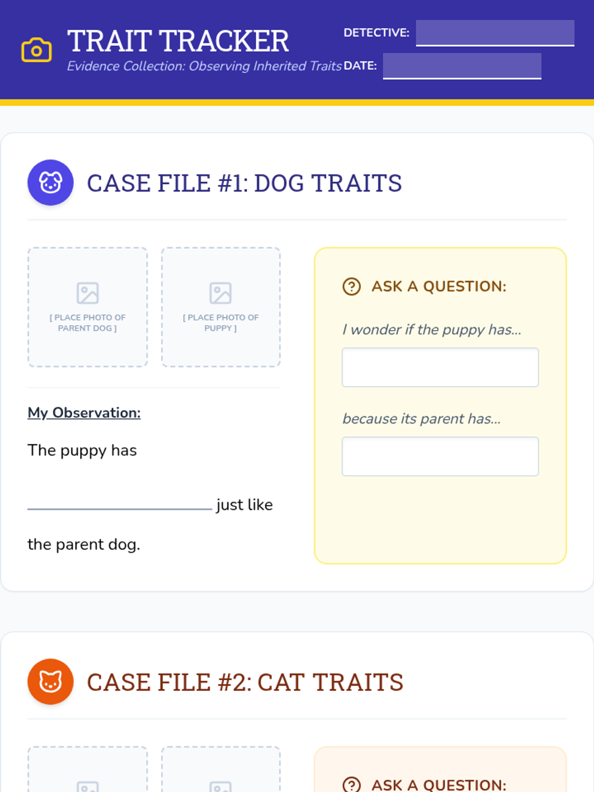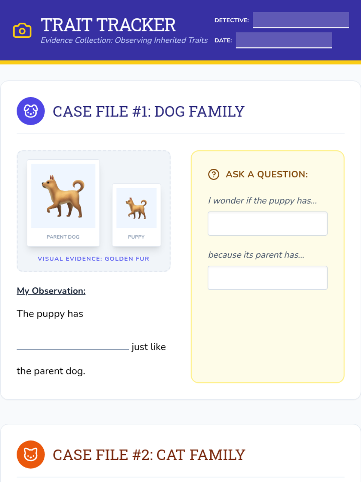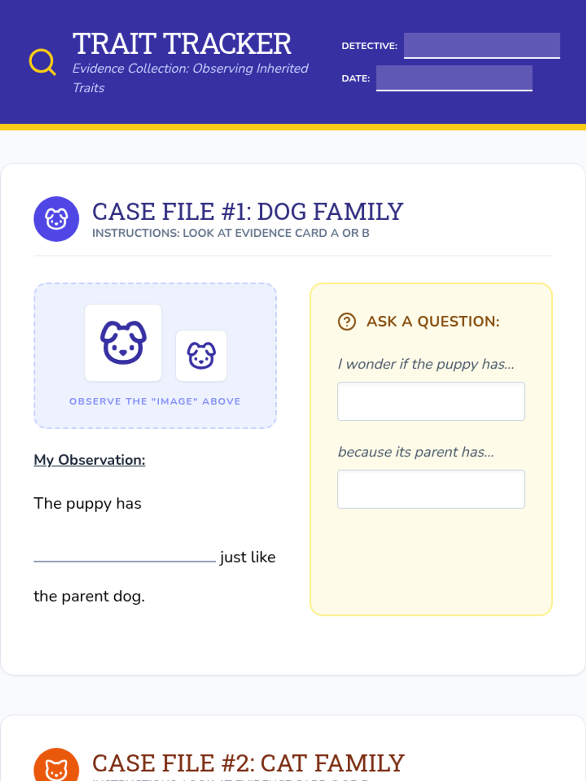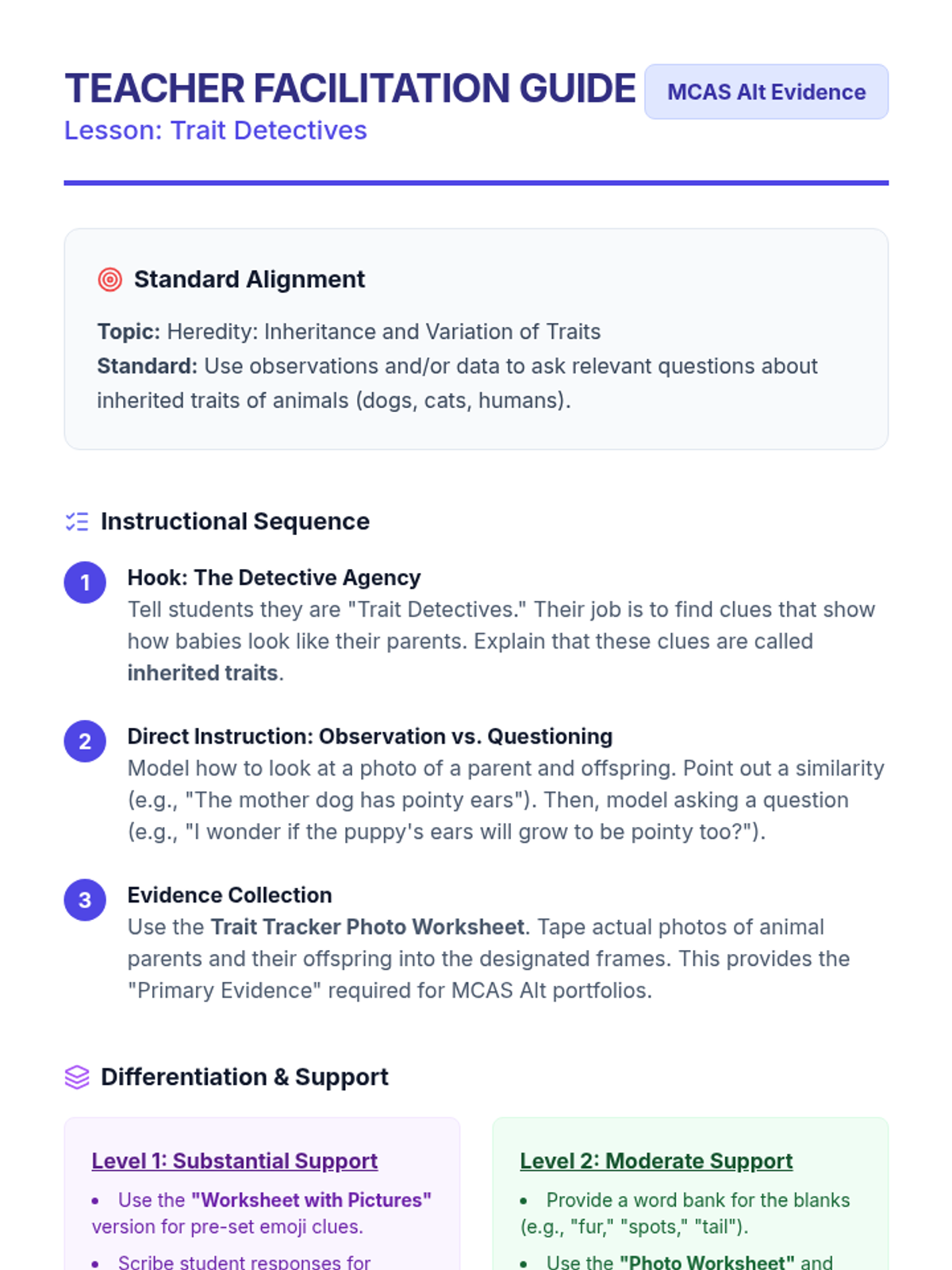 A lesson focused on observing and questioning inherited traits in animals (dogs, cats, and humans) designed for MCAS Alt evidence collection. Students use structured sentence stems to record observations and develop inquiry questions about how traits are passed from parents to offspring.