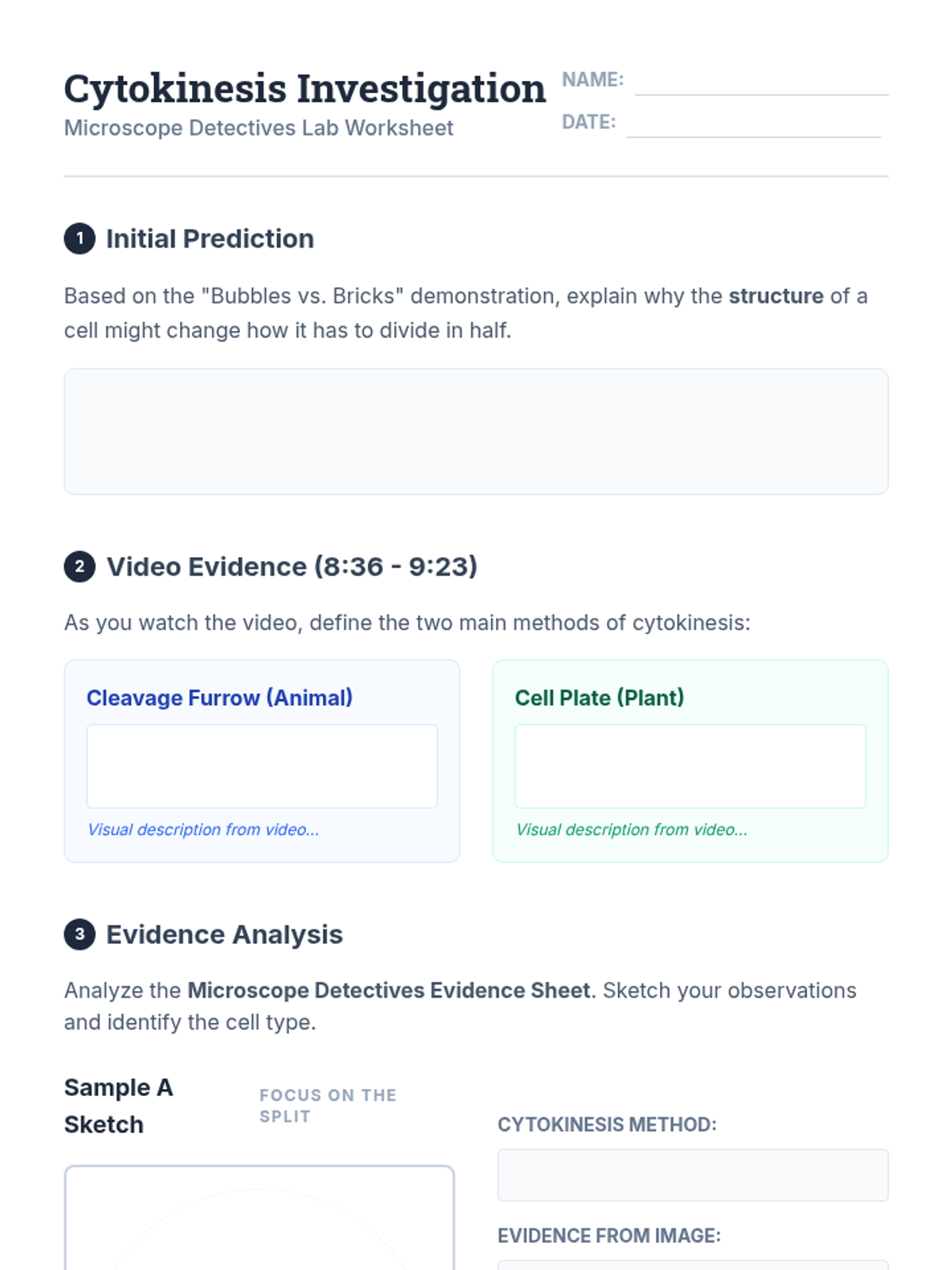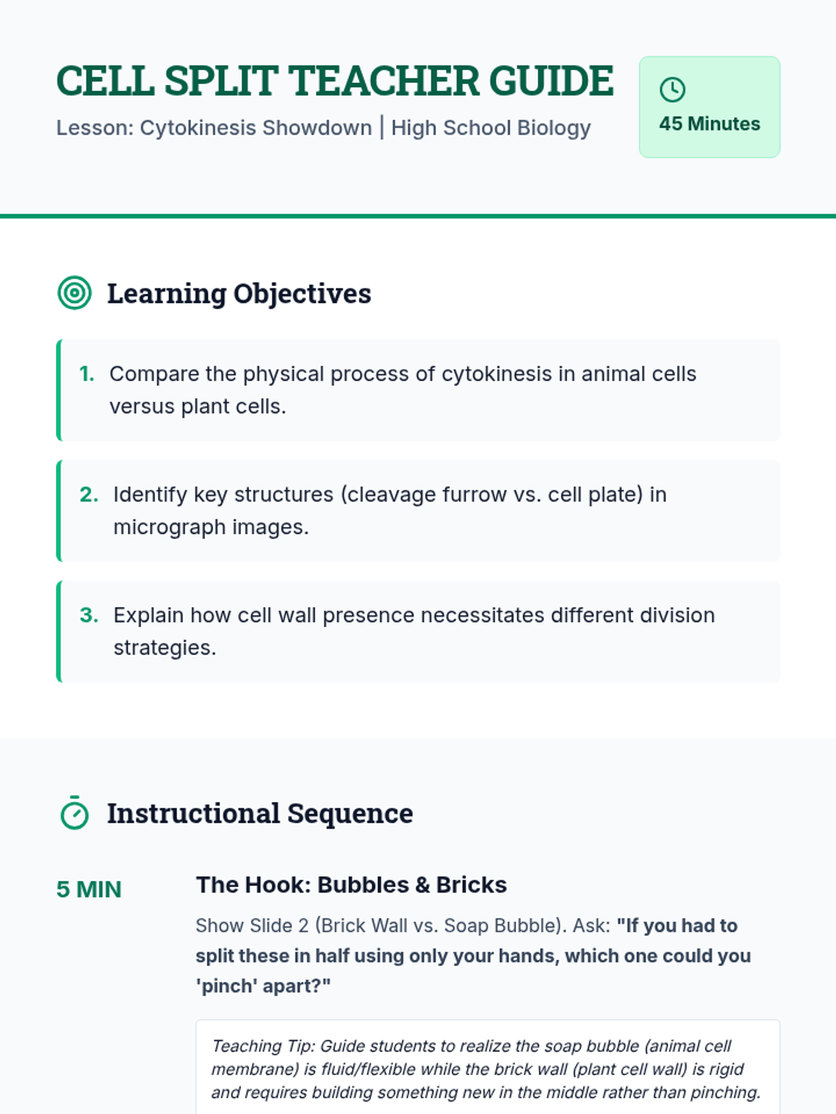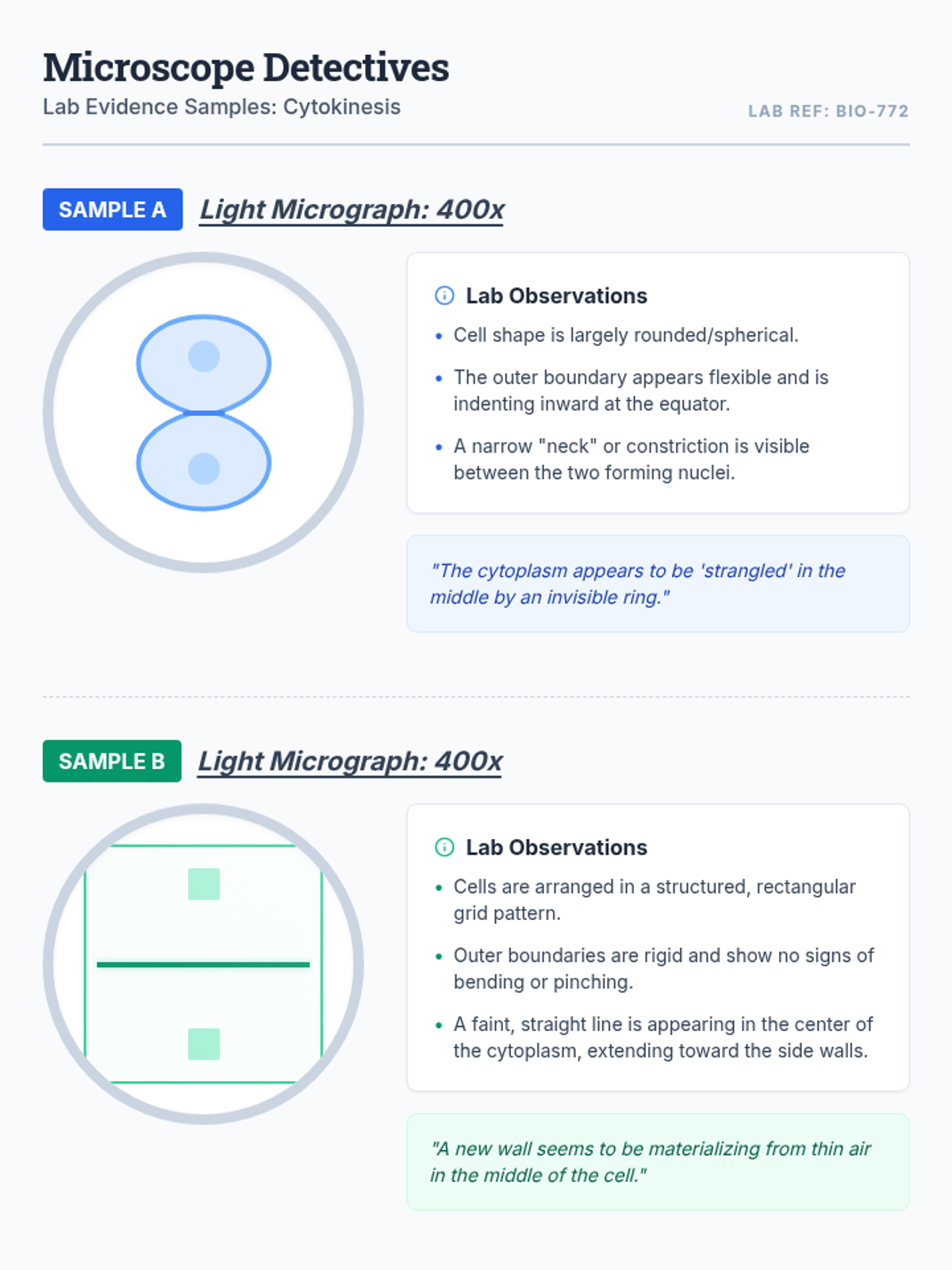 A high school biology lesson comparing cytokinesis in plant and animal cells through video analysis and a 'Microscope Detectives' investigative activity. Students identify structural differences like the cell plate and cleavage furrow using real-world cellular evidence.