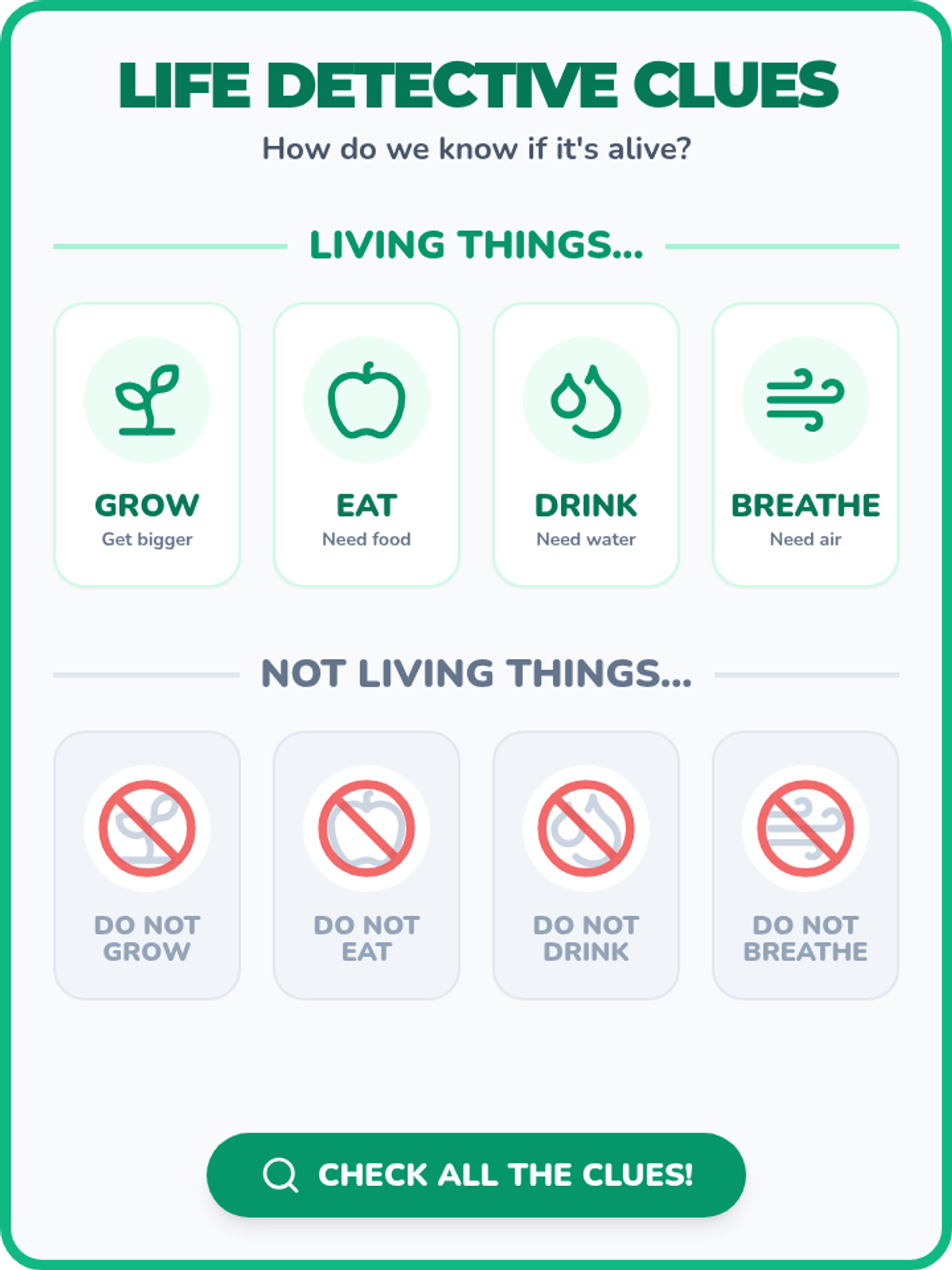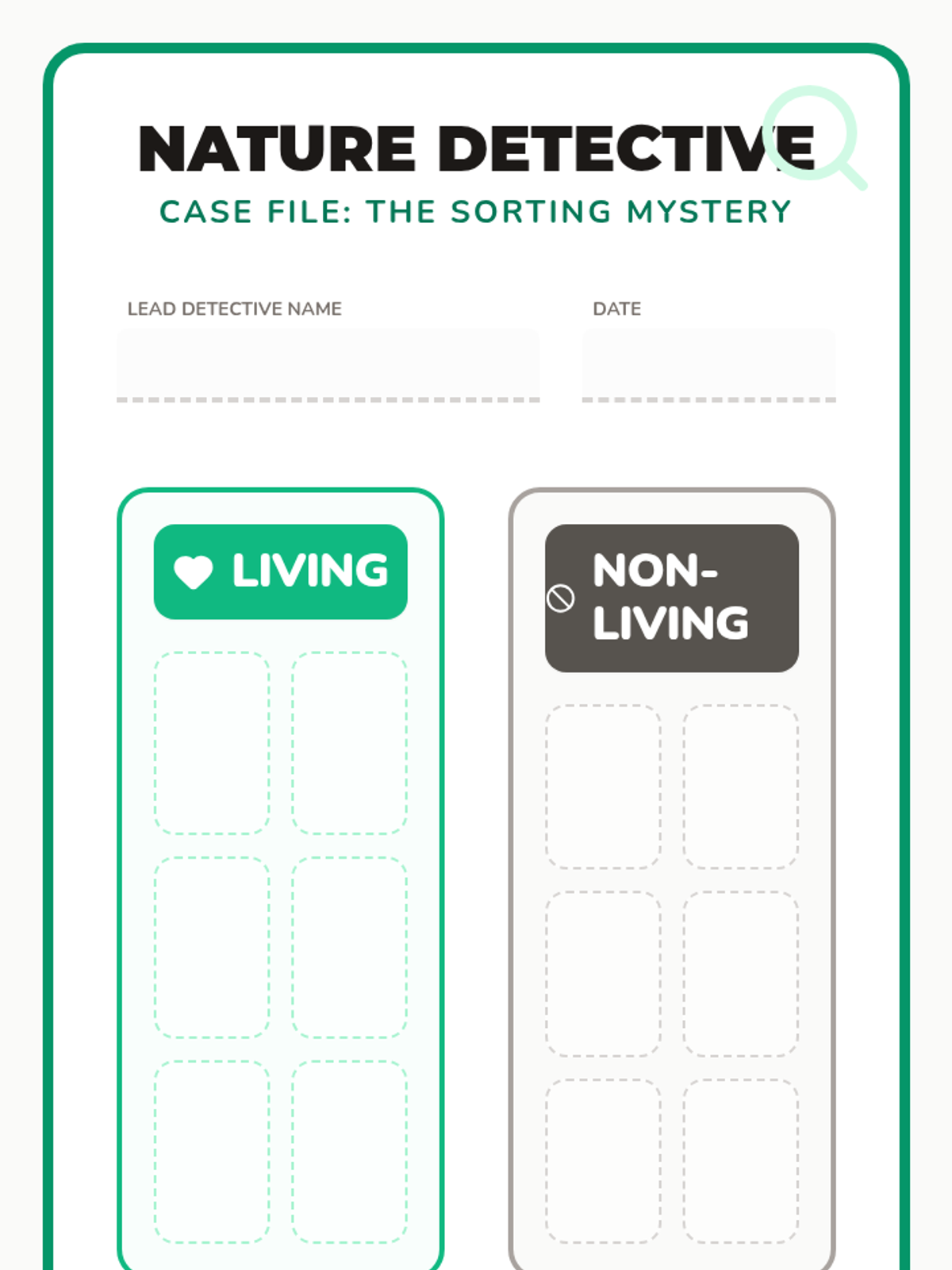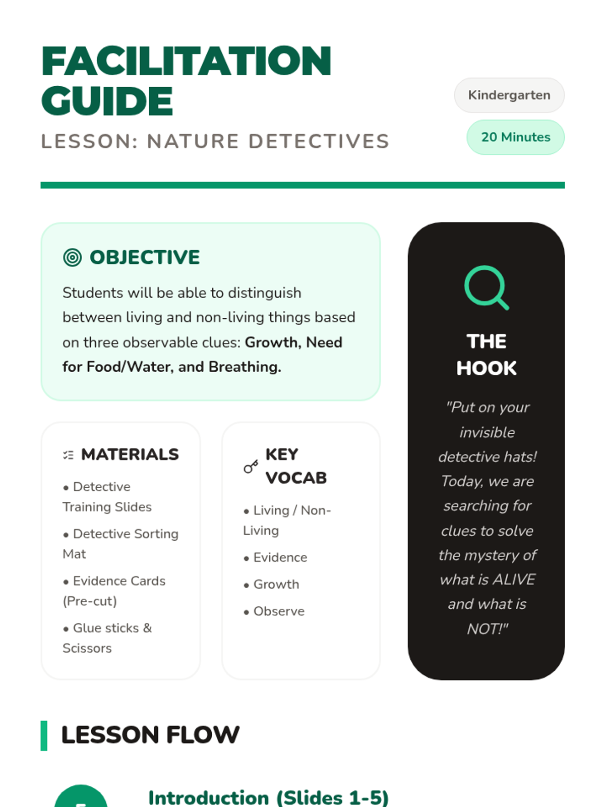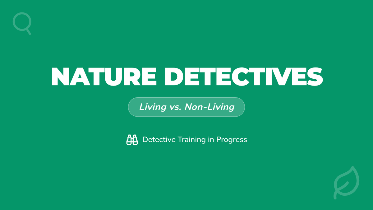 An interactive kindergarten lesson where students become 'Nature Detectives' to identify living and non-living things through observation and a hands-on sorting game.