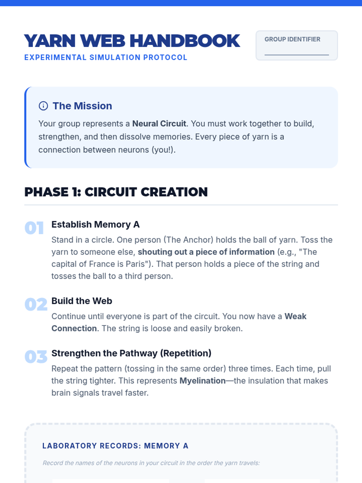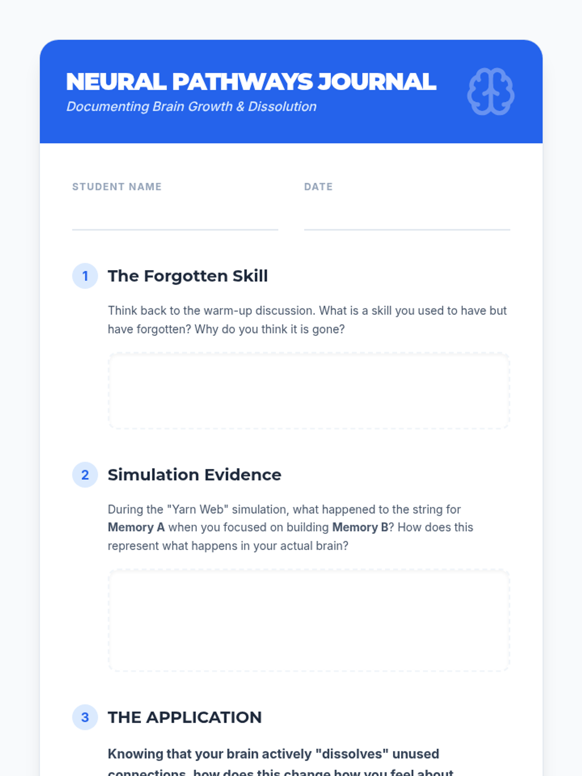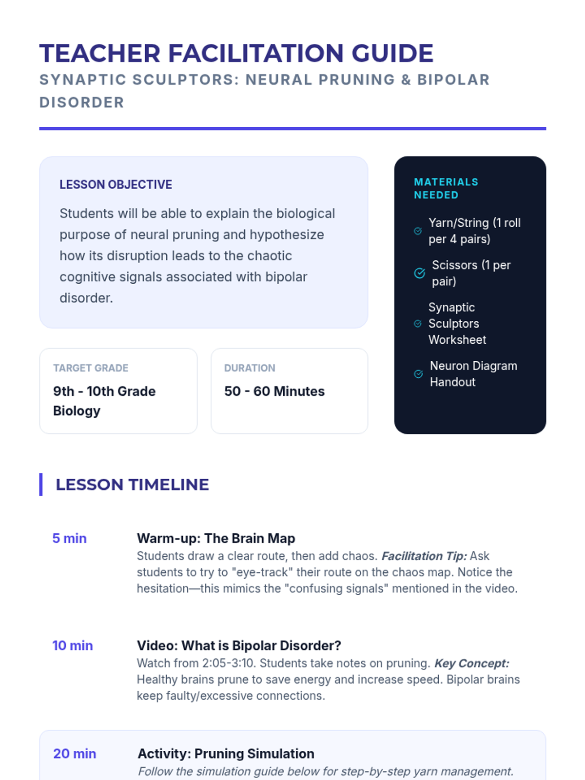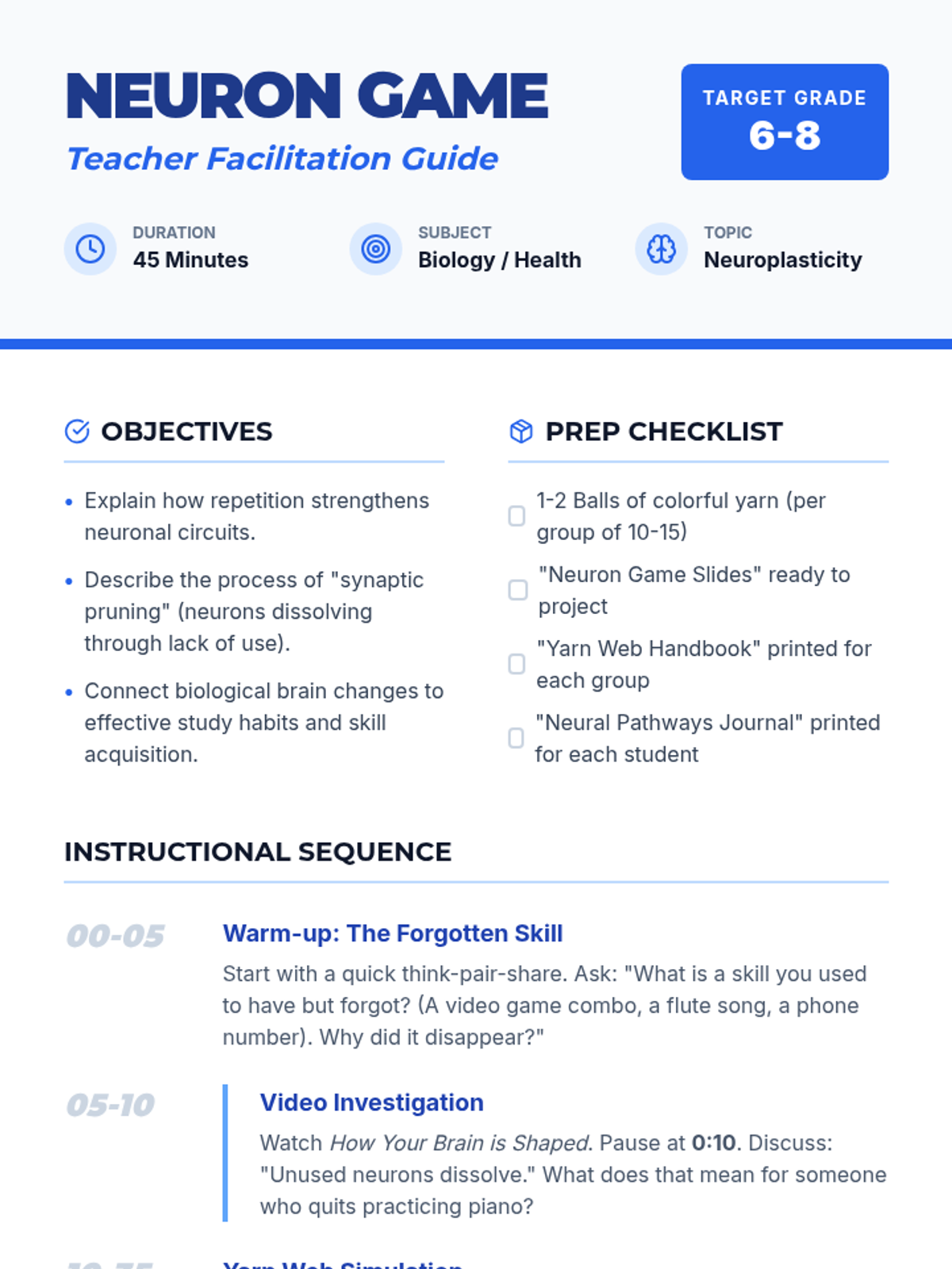 A 6th-8th grade science and health lesson exploring neuroplasticity through a hands-on yarn simulation and a video-based discussion. Students learn how neural pathways strengthen through use and dissolve through neglect.