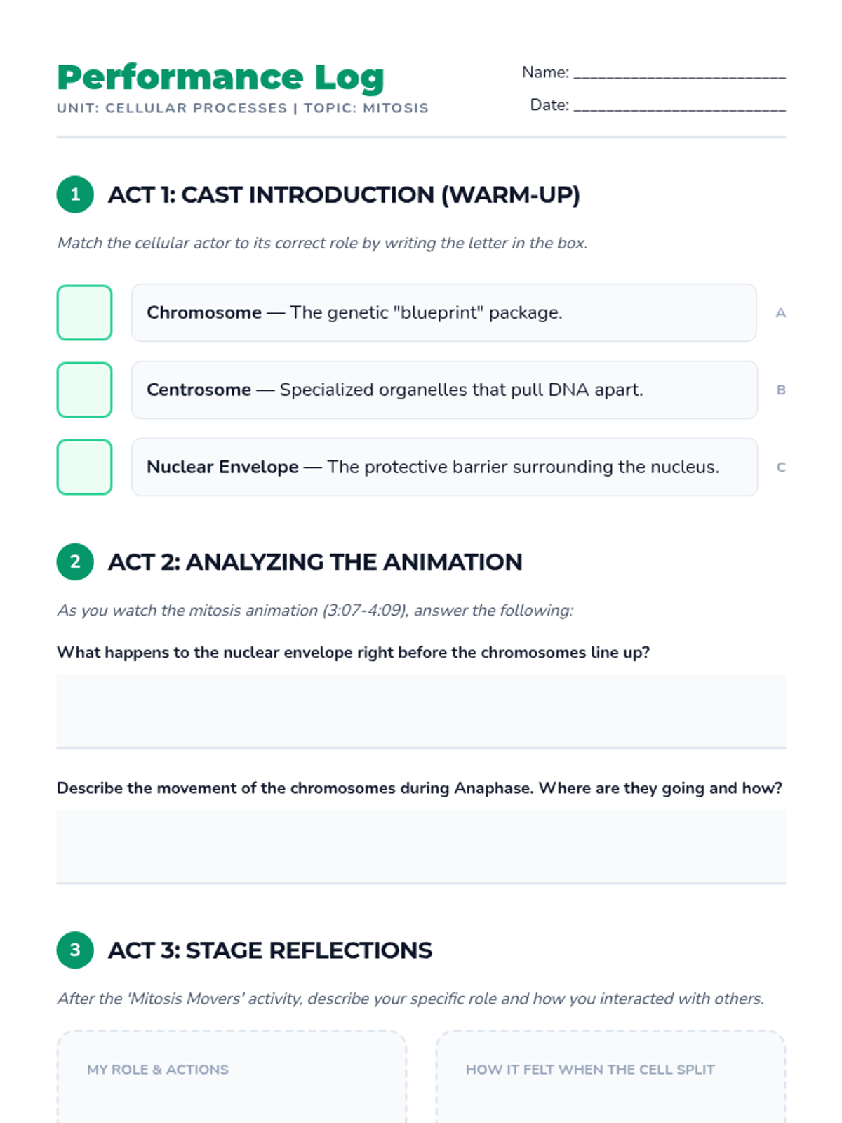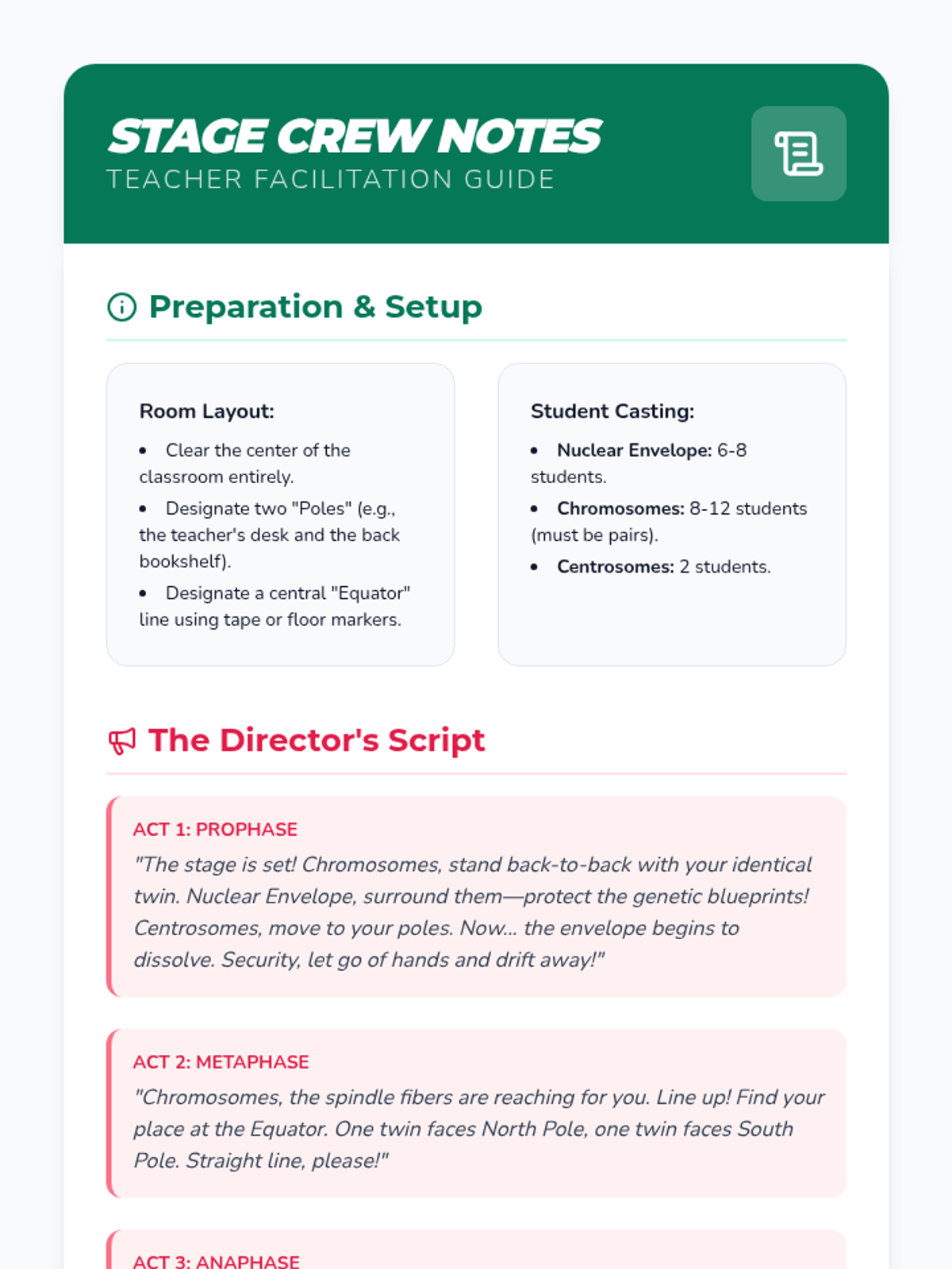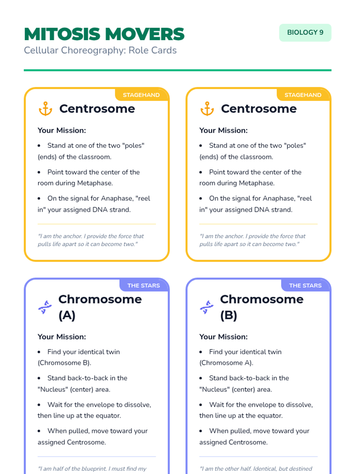 A high-energy, kinesthetic lesson where 9th-grade biology students act out the phases of mitosis to understand the mechanical movement of DNA and organelles during cell division.
