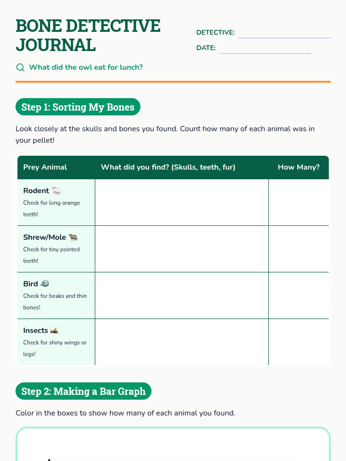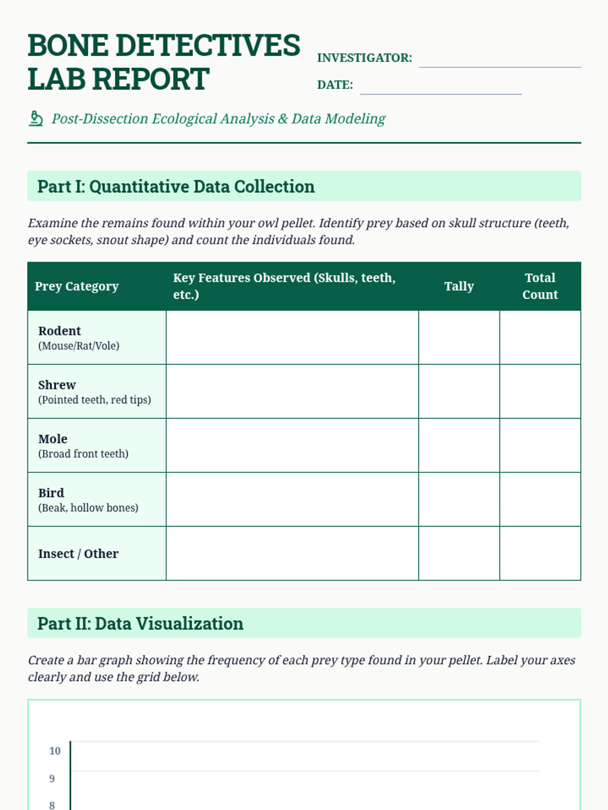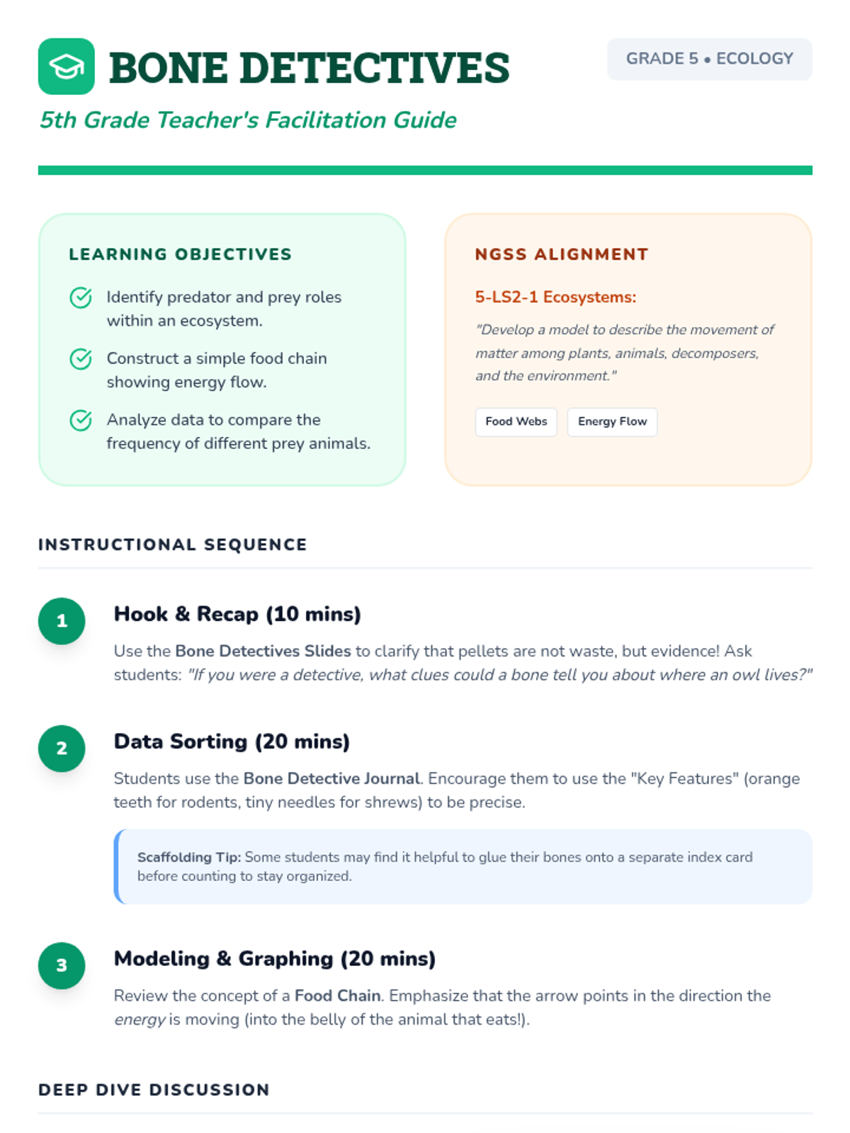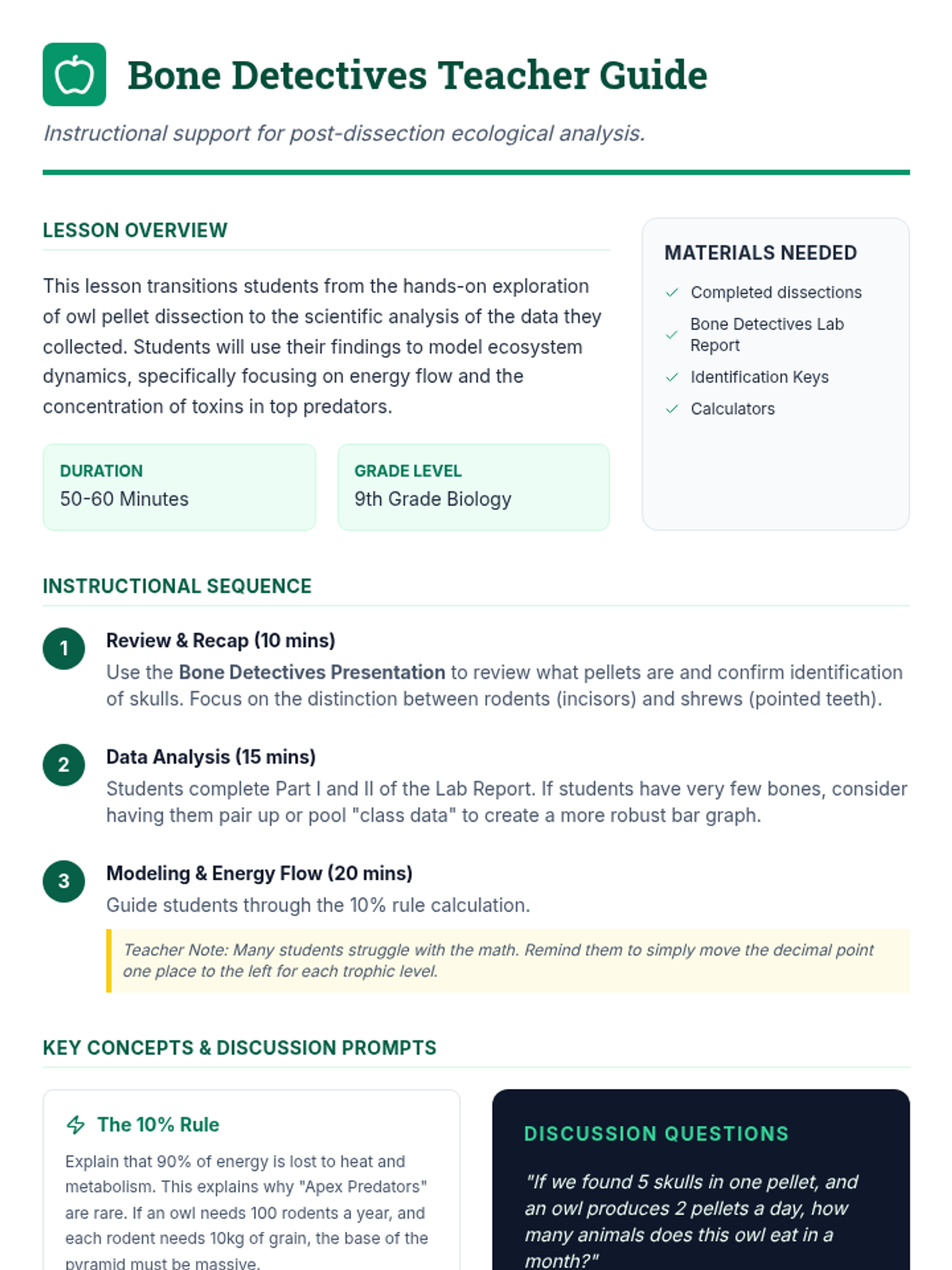 A post-dissection lesson focused on analyzing owl pellet data to understand ecological relationships and energy flow, with materials specifically designed for both 9th grade (quantitative analysis) and 5th grade (qualitative observation and basic food chains).