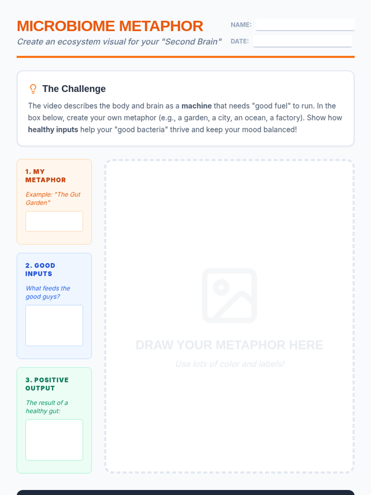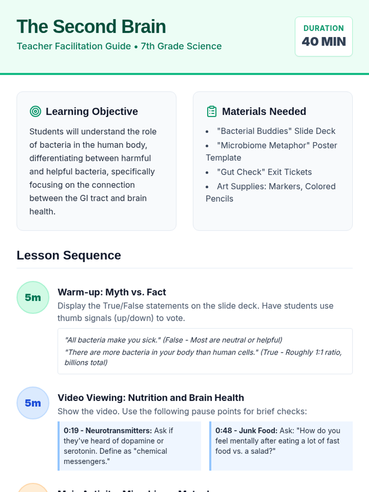 A lesson exploring the symbiotic relationship between humans and gut bacteria, focusing on the gut-brain connection and the impact of nutrition on mood. Students create metaphors for their microbiome and identify ways to support beneficial bacteria.