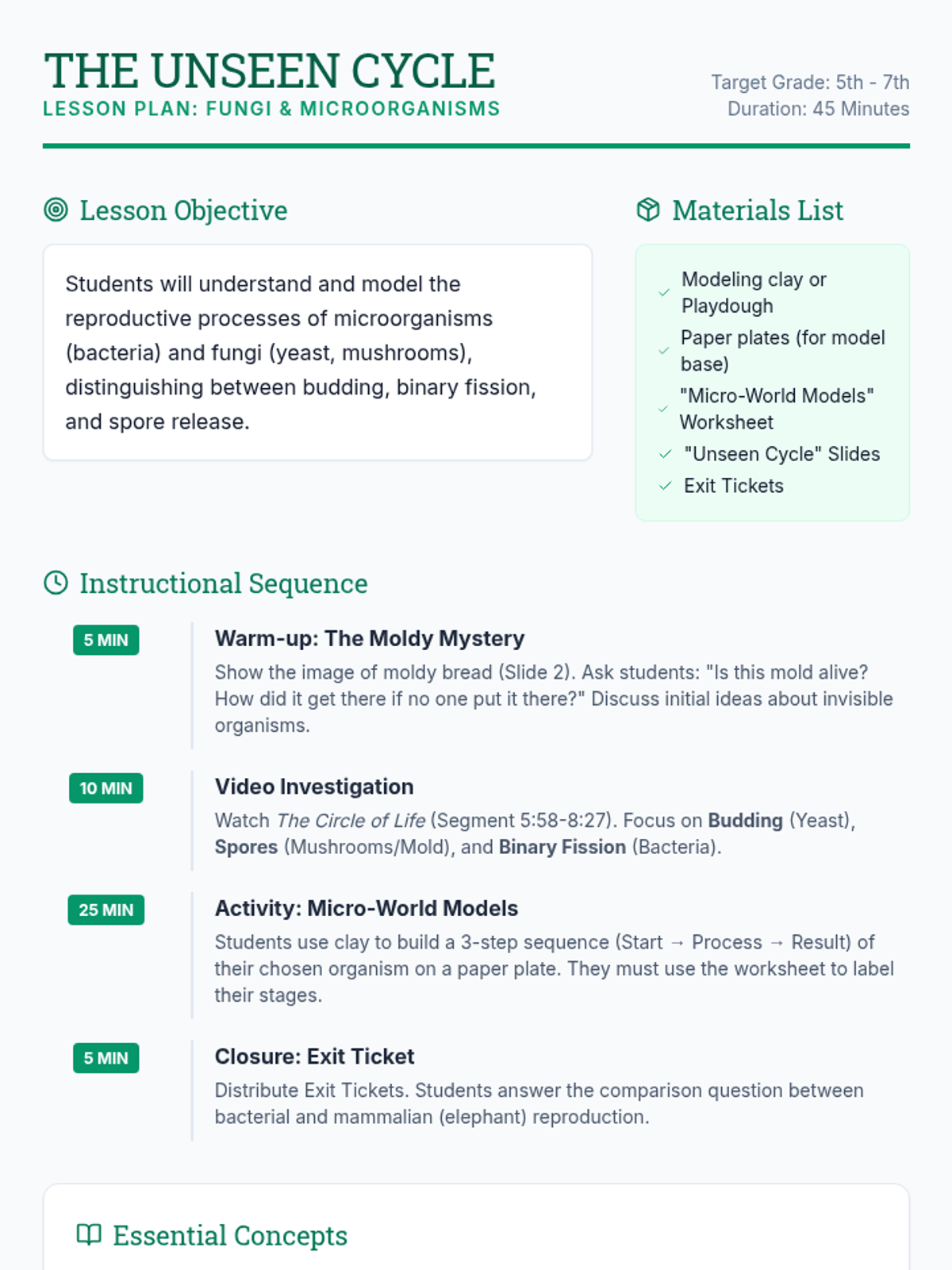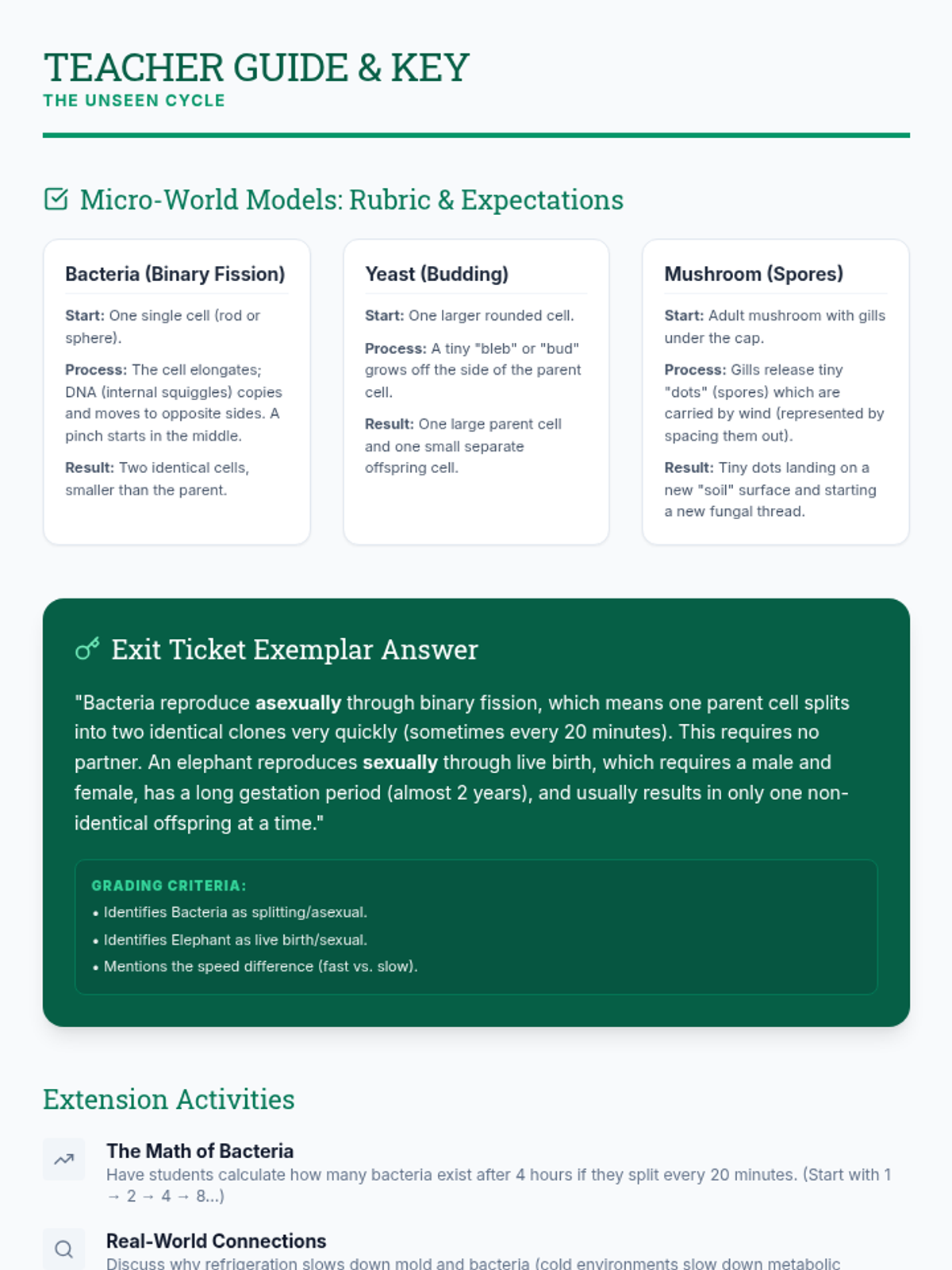 A lesson exploring the rapid and fascinating reproductive methods of fungi and microorganisms like bacteria and yeast, featuring a hands-on modeling activity.