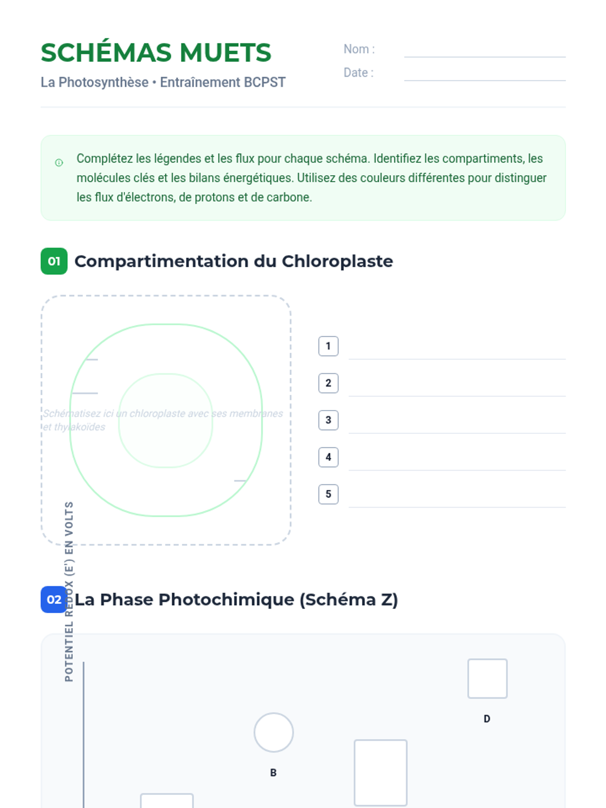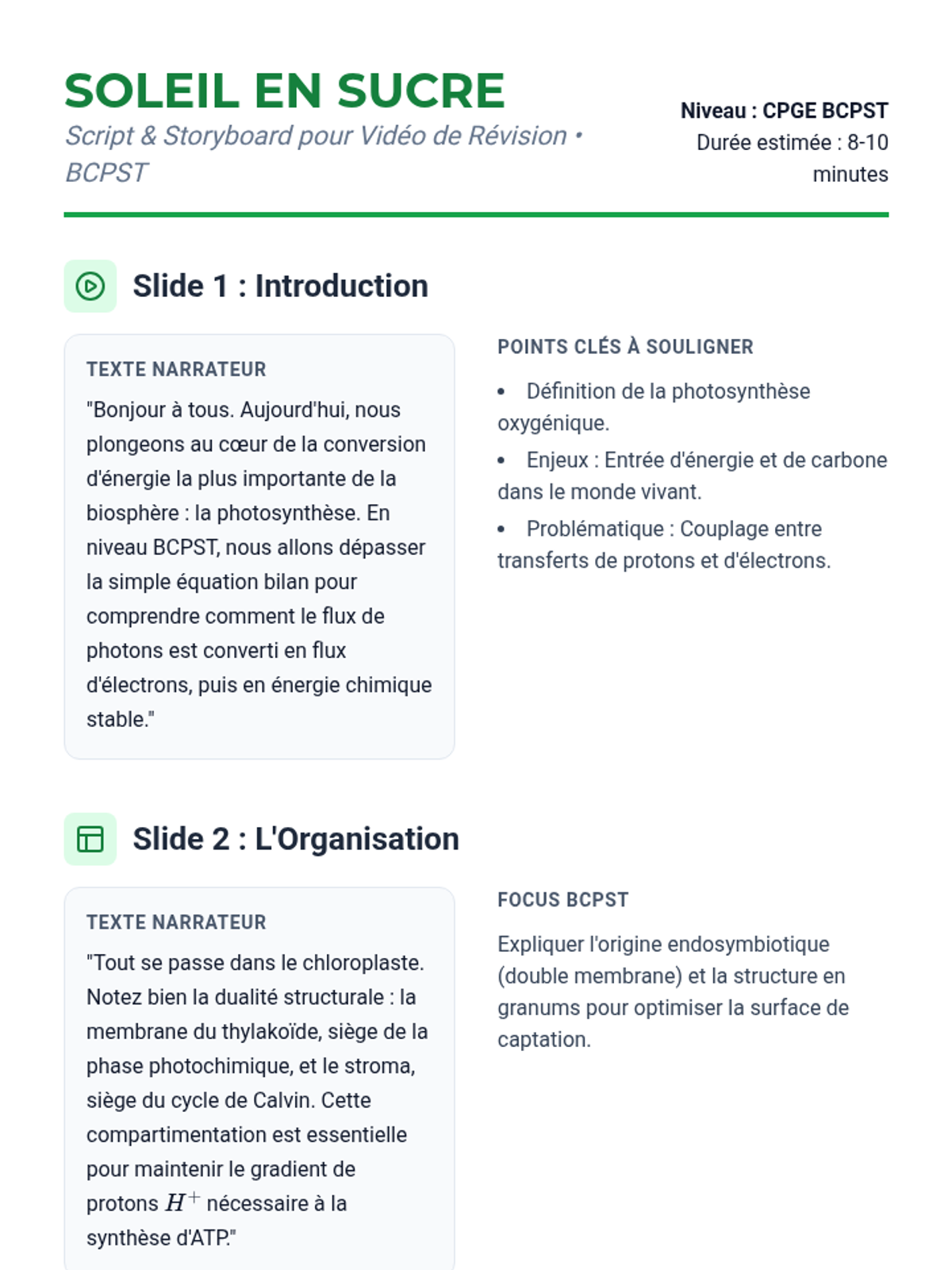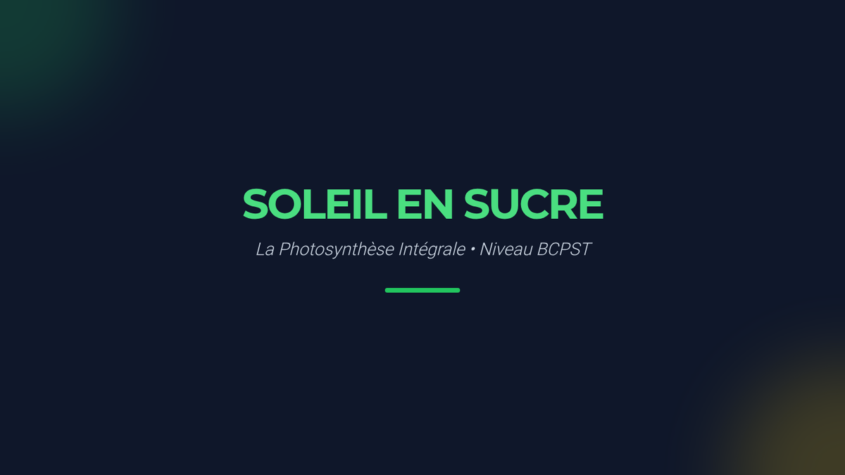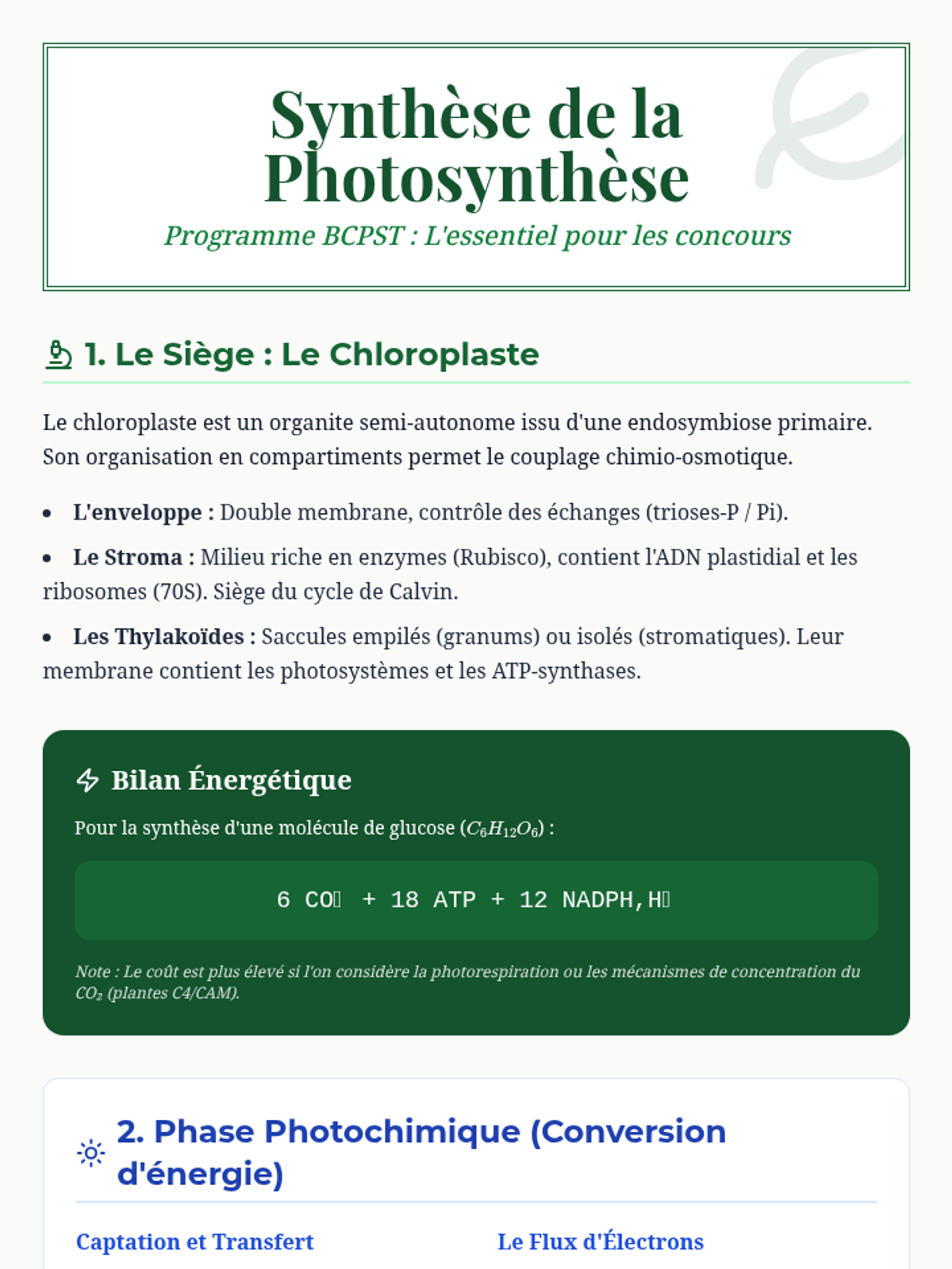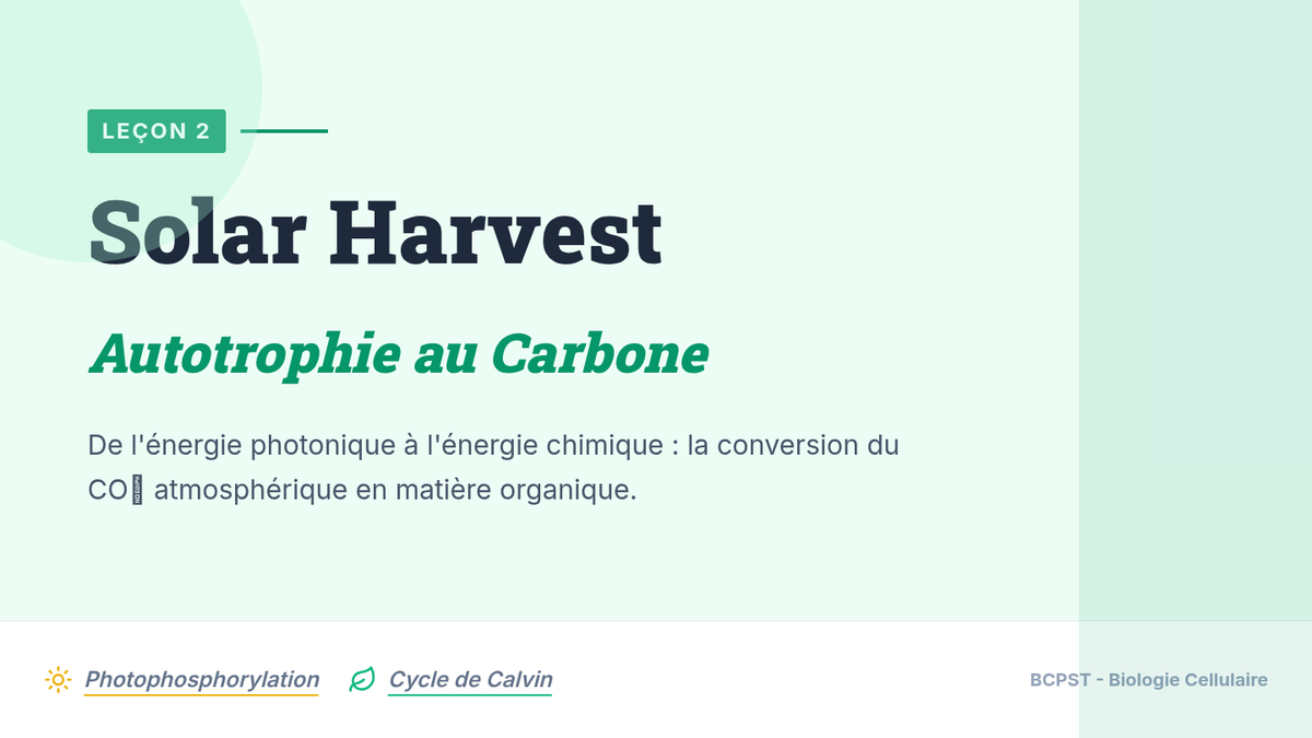 Une leçon complète sur la photosynthèse pour le niveau BCPST, couvrant les phases photochimique et chimique, l'organisation du chloroplaste et les bilans énergétiques. Conçue pour servir de base à une révision intensive ou à la création d'un support vidéo.