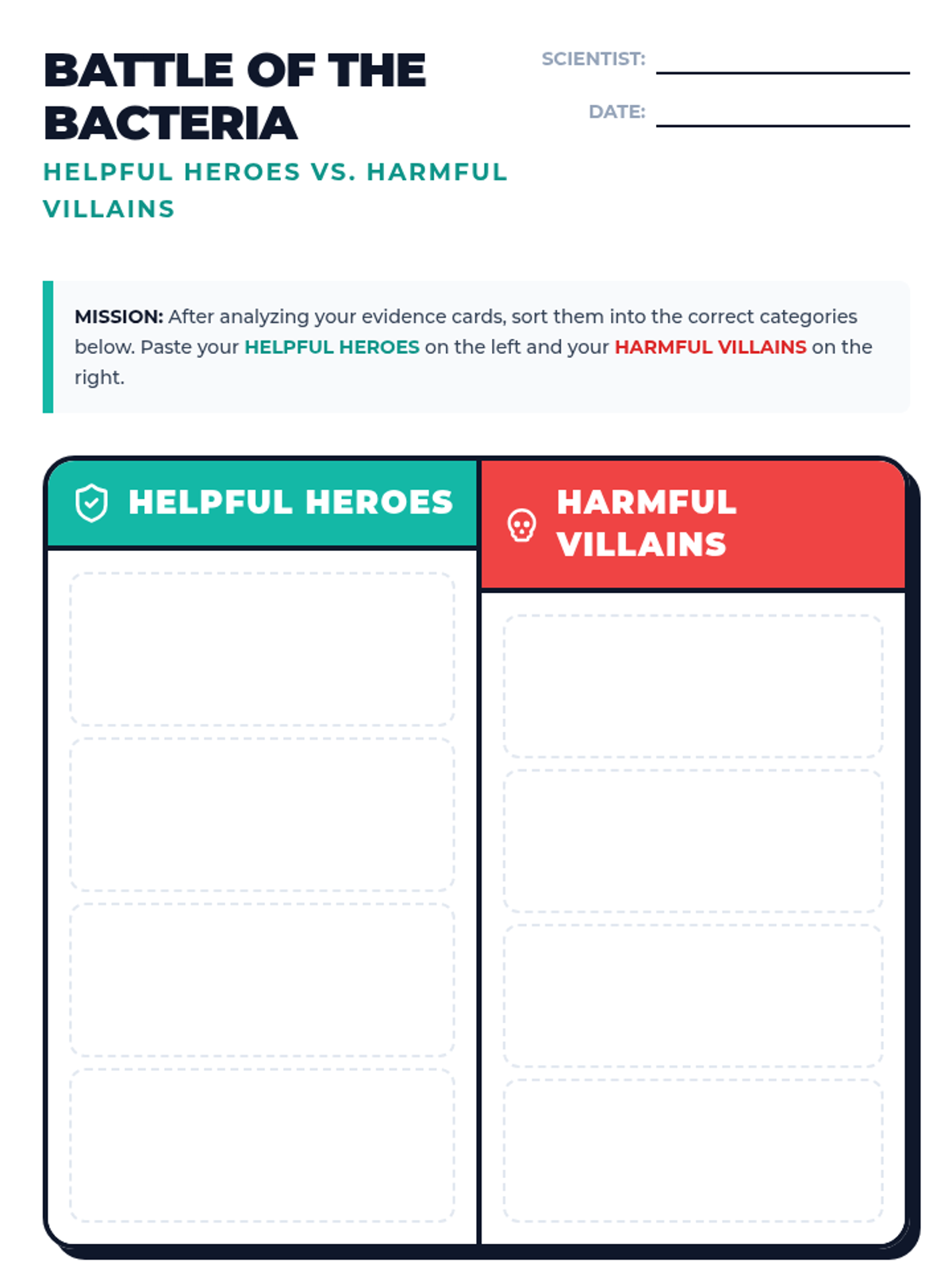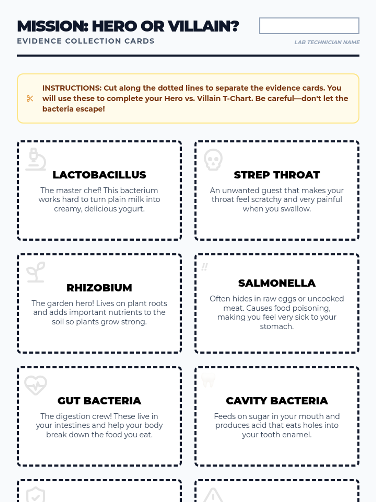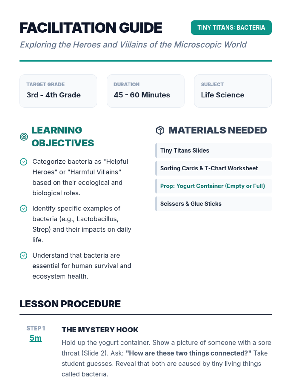 Students will investigate the dual nature of bacteria, categorizing them as 'Heroes' or 'Villains' while exploring their roles in food production, human health, and the environment. This lesson features a video-based investigation, a hands-on sorting activity, and critical thinking about microscopic life.