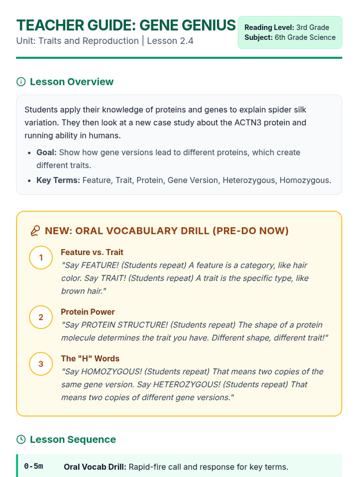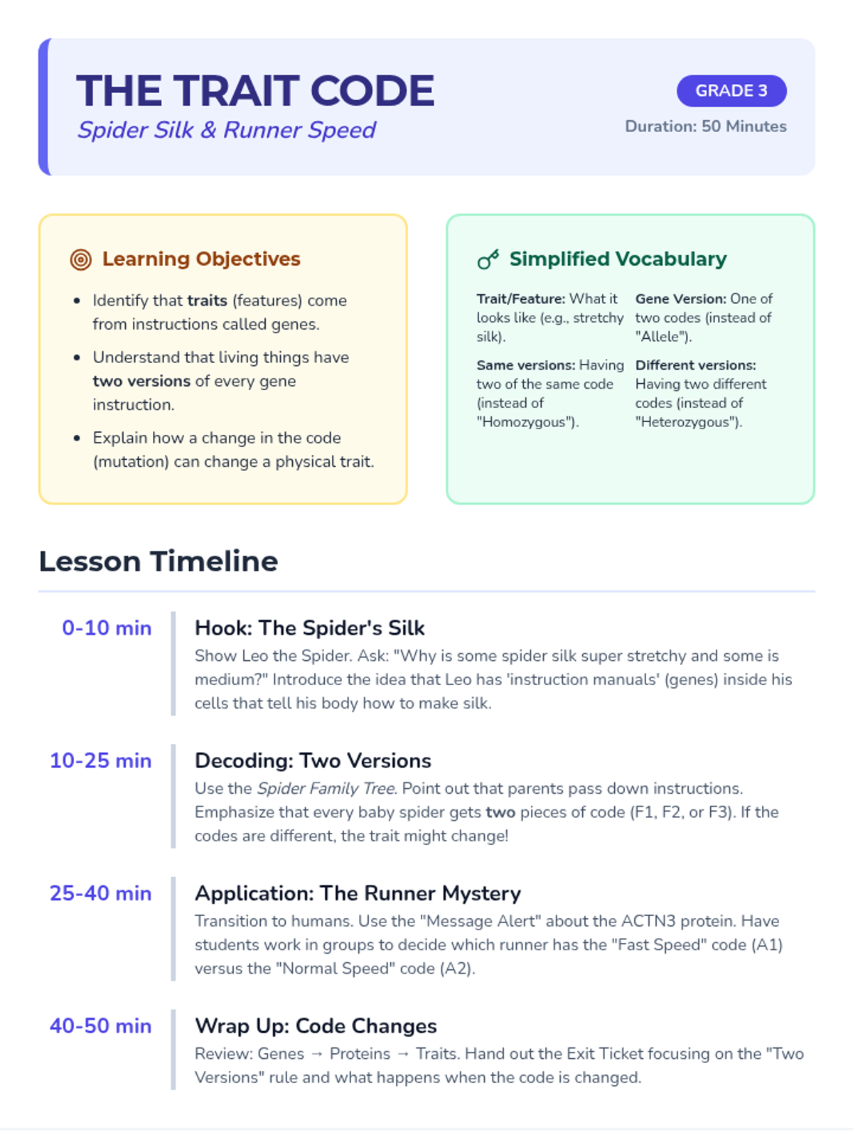 A lesson where students learn how gene versions provide instructions for proteins that determine traits, specifically exploring spider silk flexibility and human running ability. Adjusted for a 3rd-grade reading level while maintaining 6th-grade vocabulary.