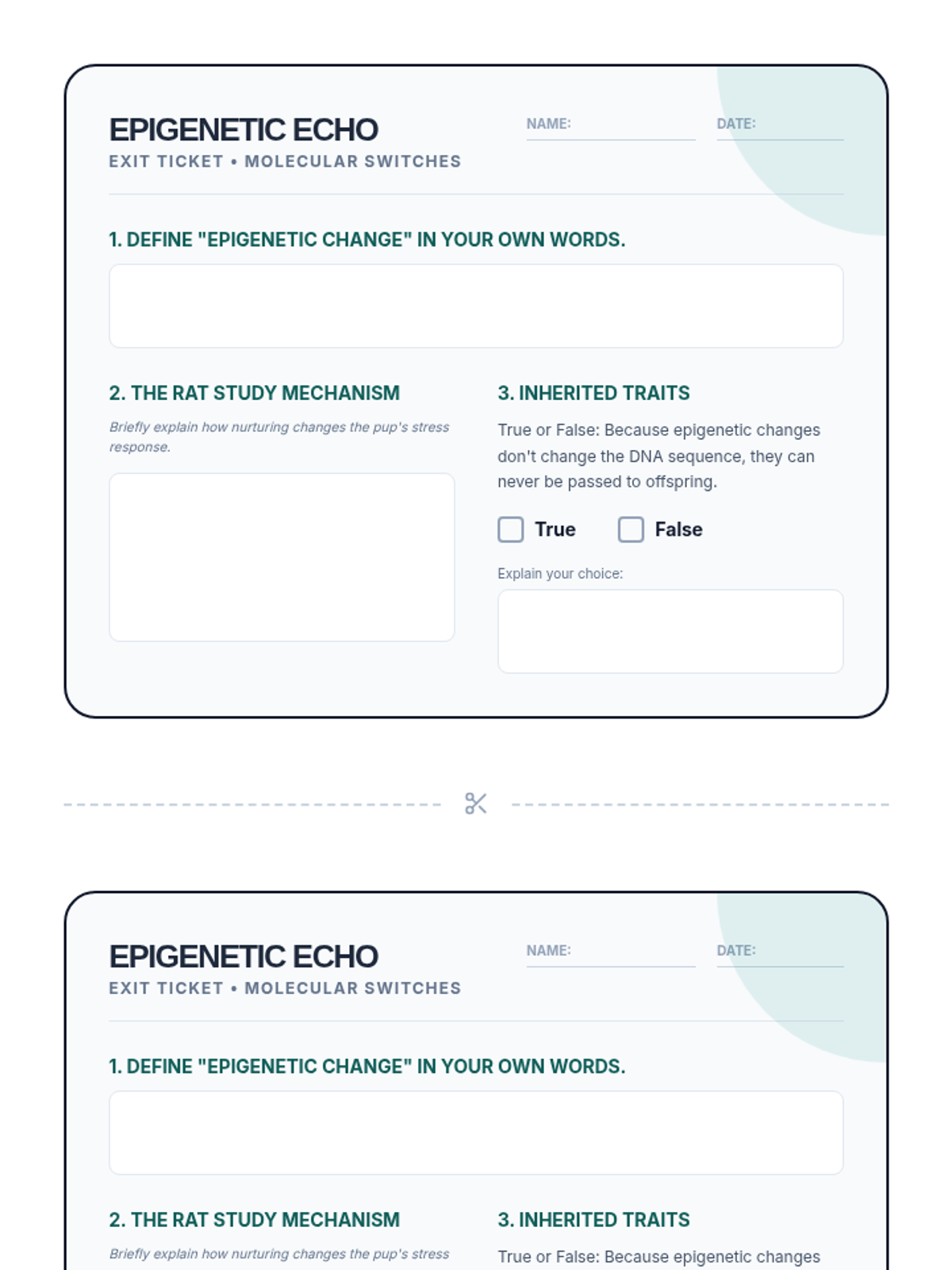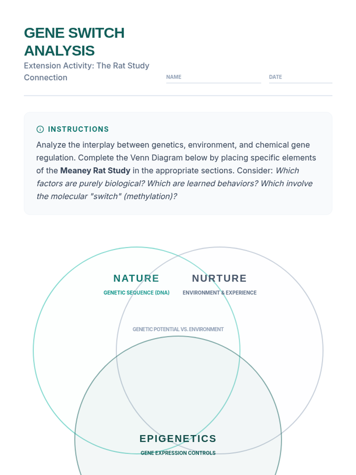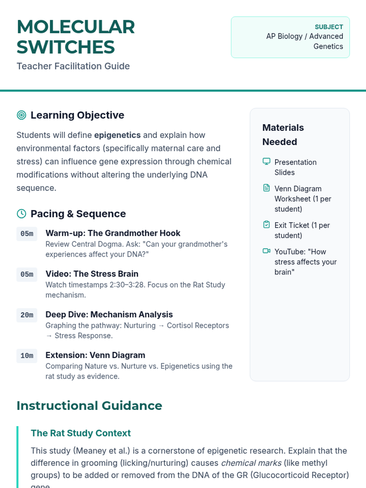 A high-level genetics lesson exploring how environmental factors like maternal care and stress trigger epigenetic modifications that influence gene expression across generations. Students analyze the classic Meaney rat study to understand the molecular mechanisms beyond DNA sequences.