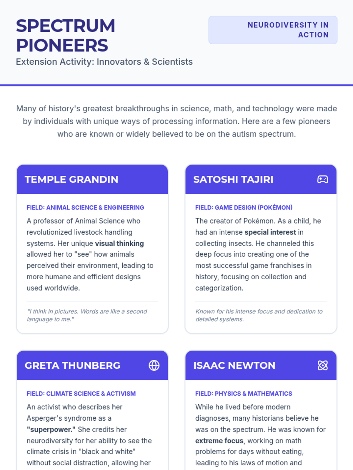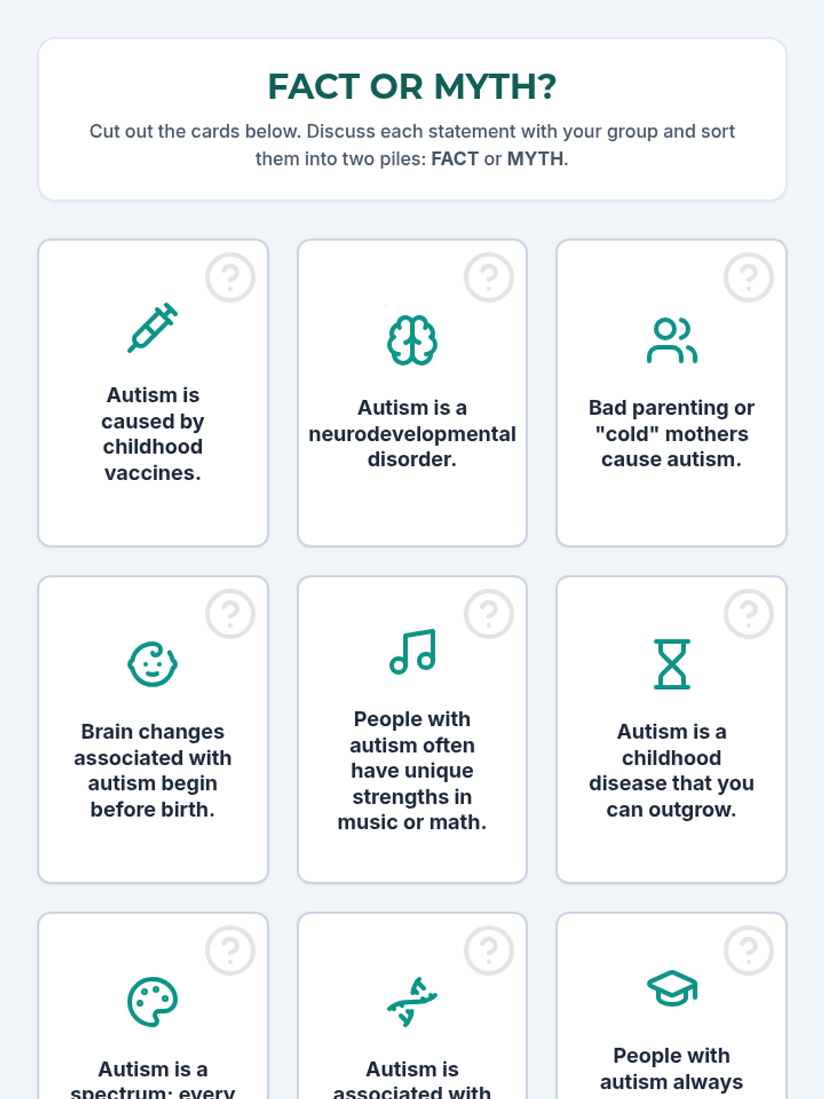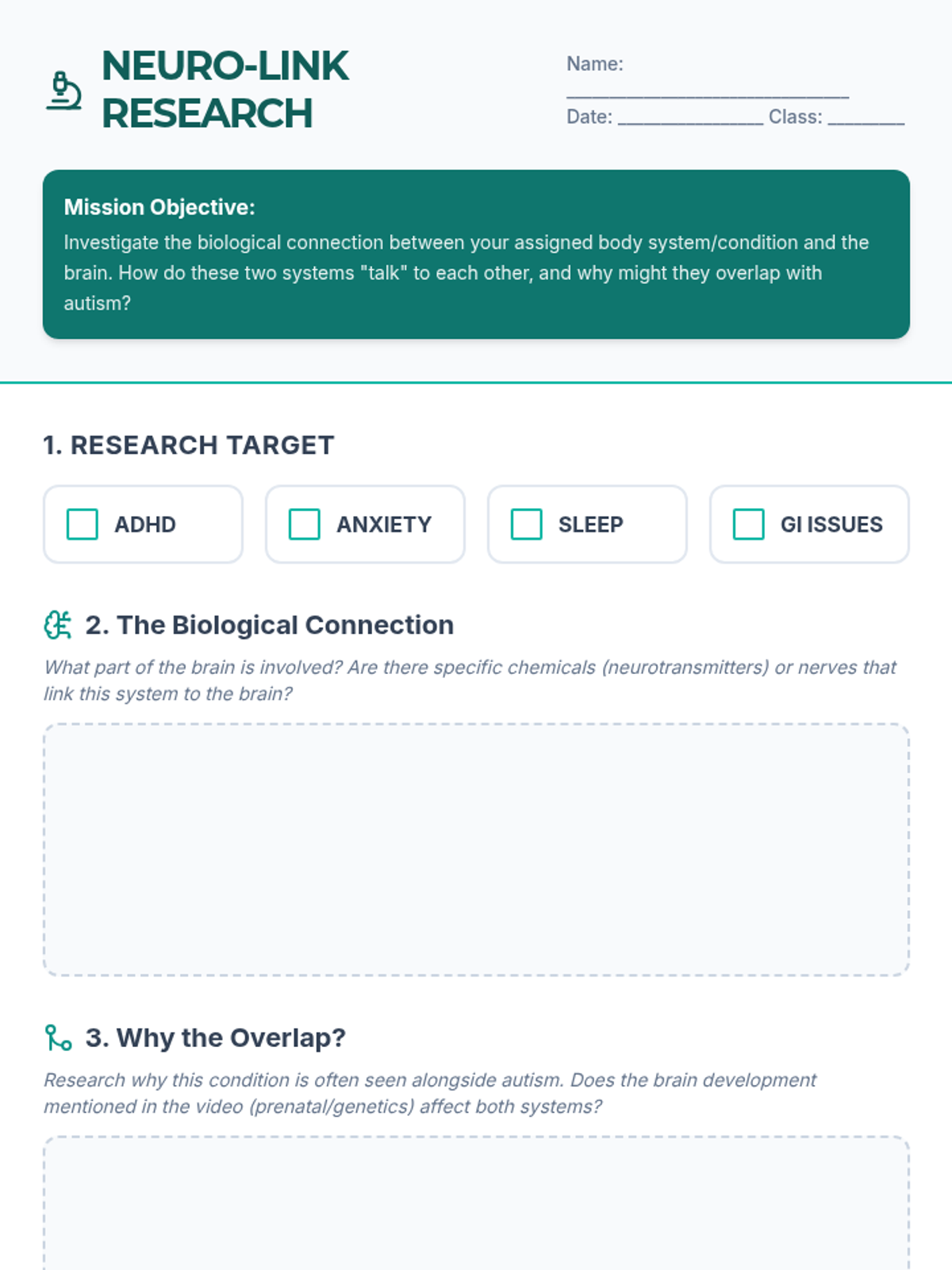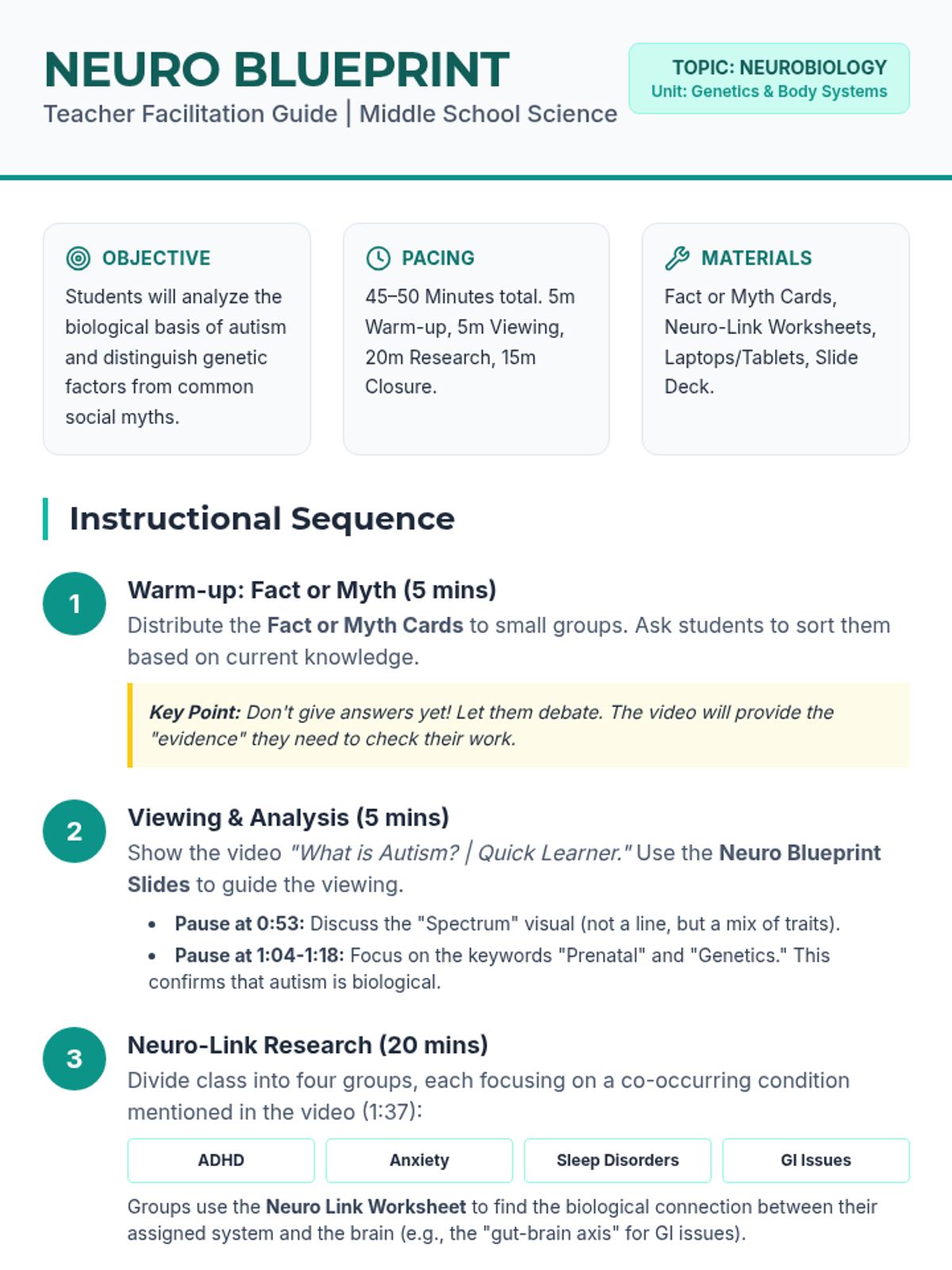 A lesson for 7th-8th grade science focusing on the biological and genetic foundations of autism. Students debunk common myths, analyze brain development through video, and research how the brain interacts with other body systems in co-occurring conditions.