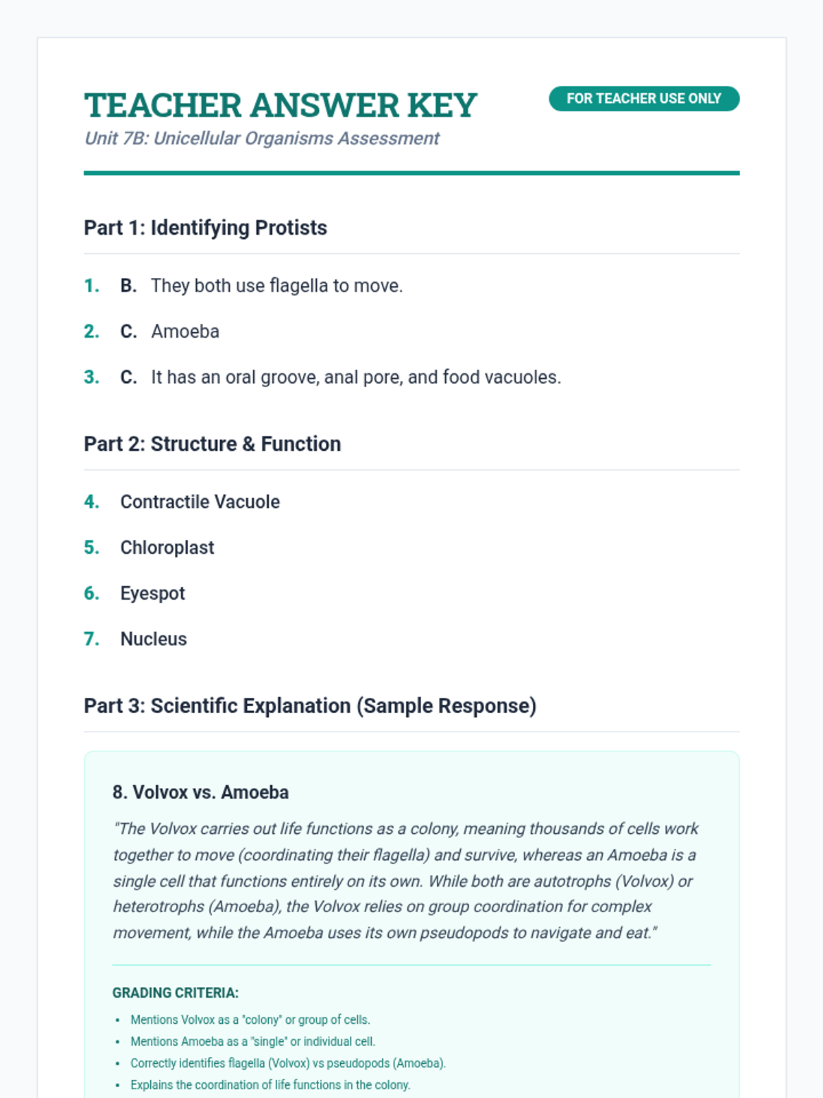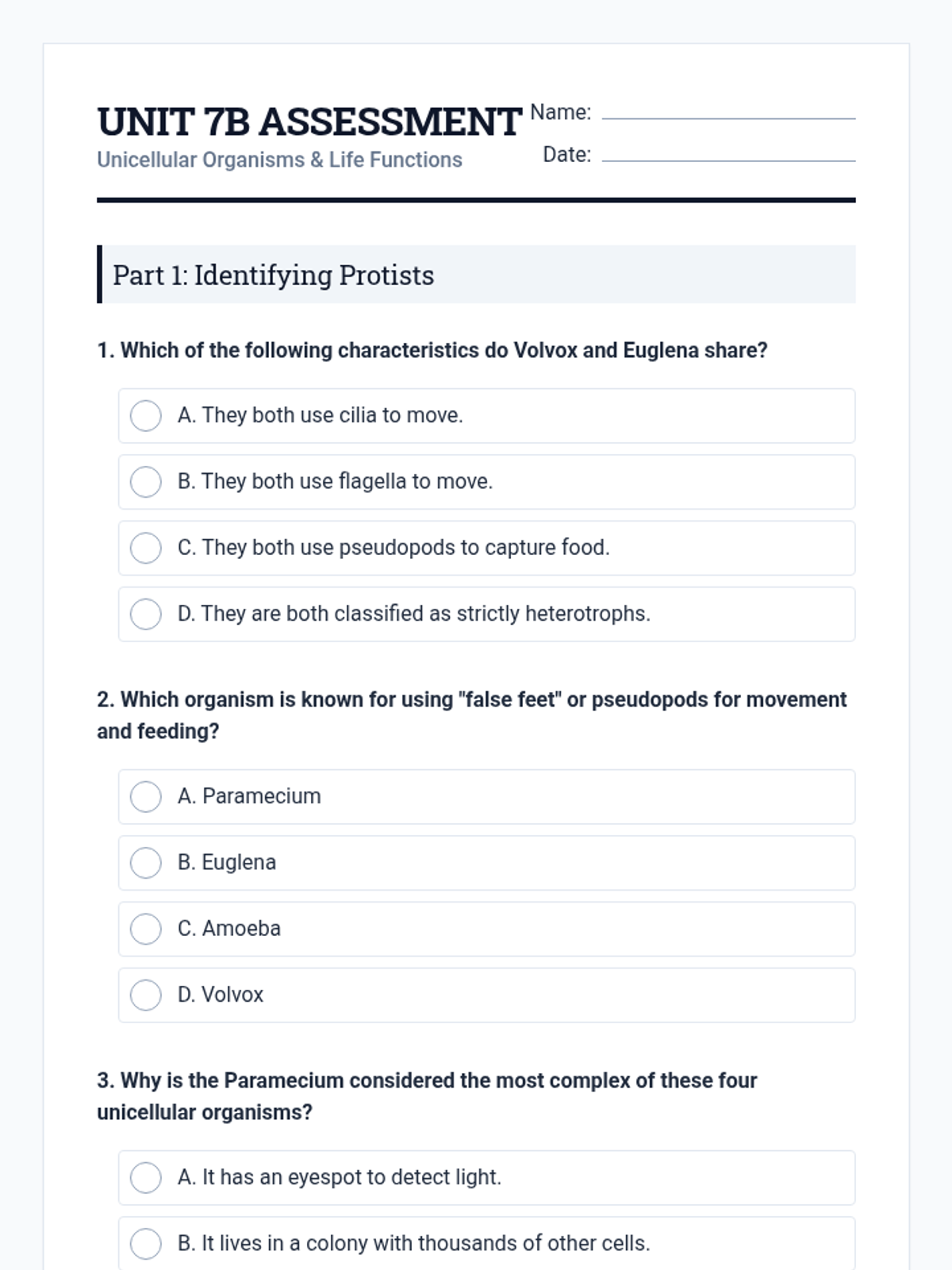 Review key concepts and assess student understanding of unicellular organism structures and functions.
